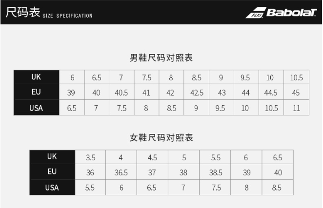 备注:Babolat 鞋子偏小半码,建议比平时码数大半码购买。