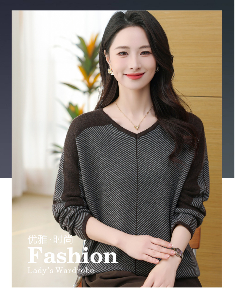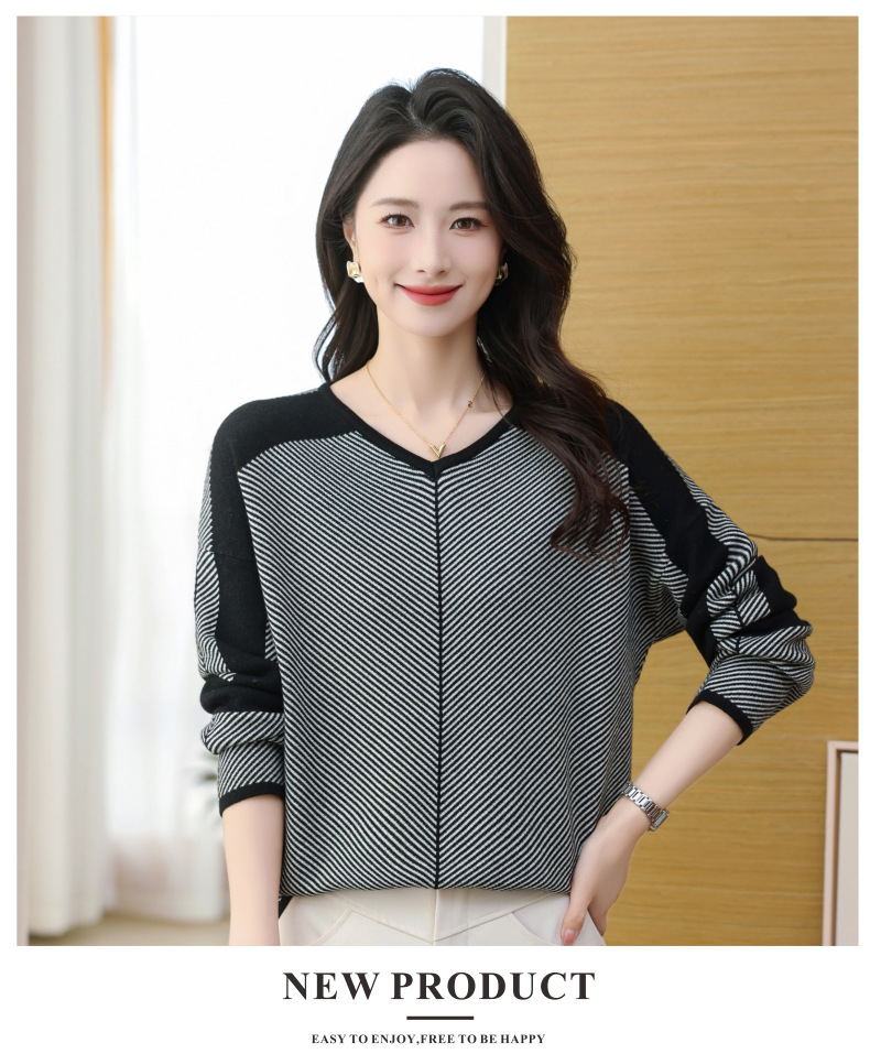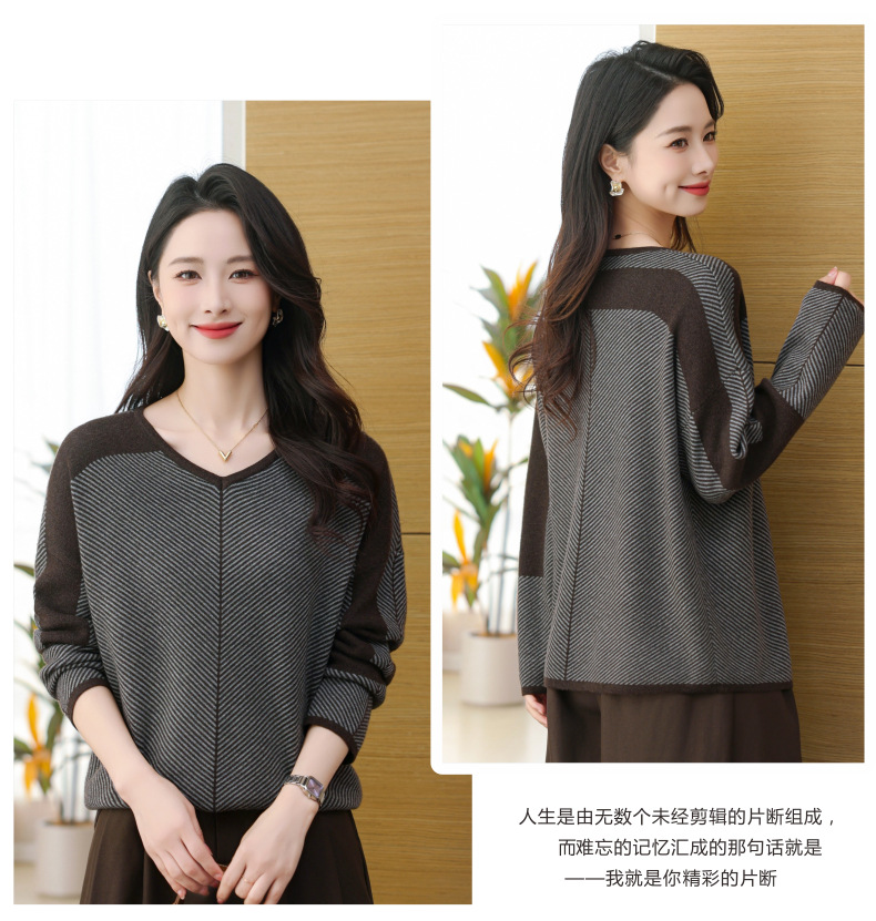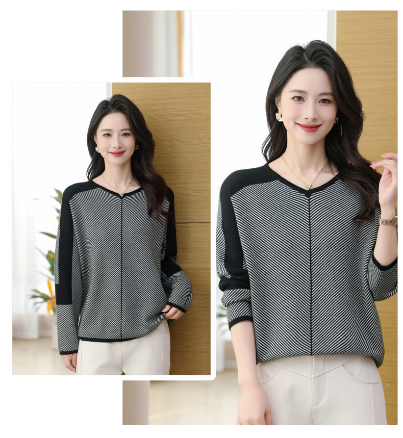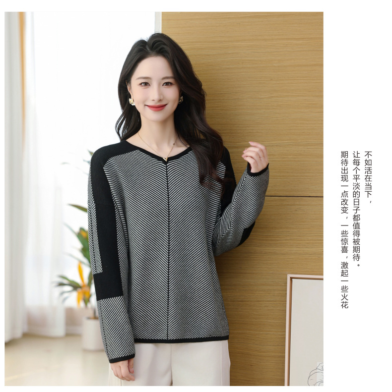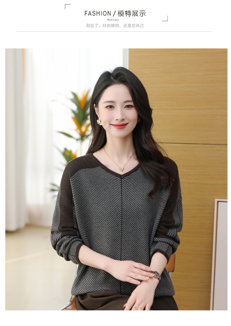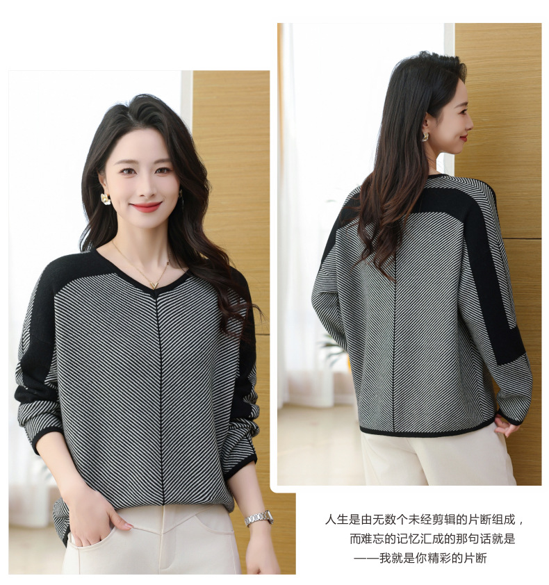 CC-SYX-9036桃心领打底衫女秋冬条纹撞色上衣时髦毛衣大码羊毛针织衫