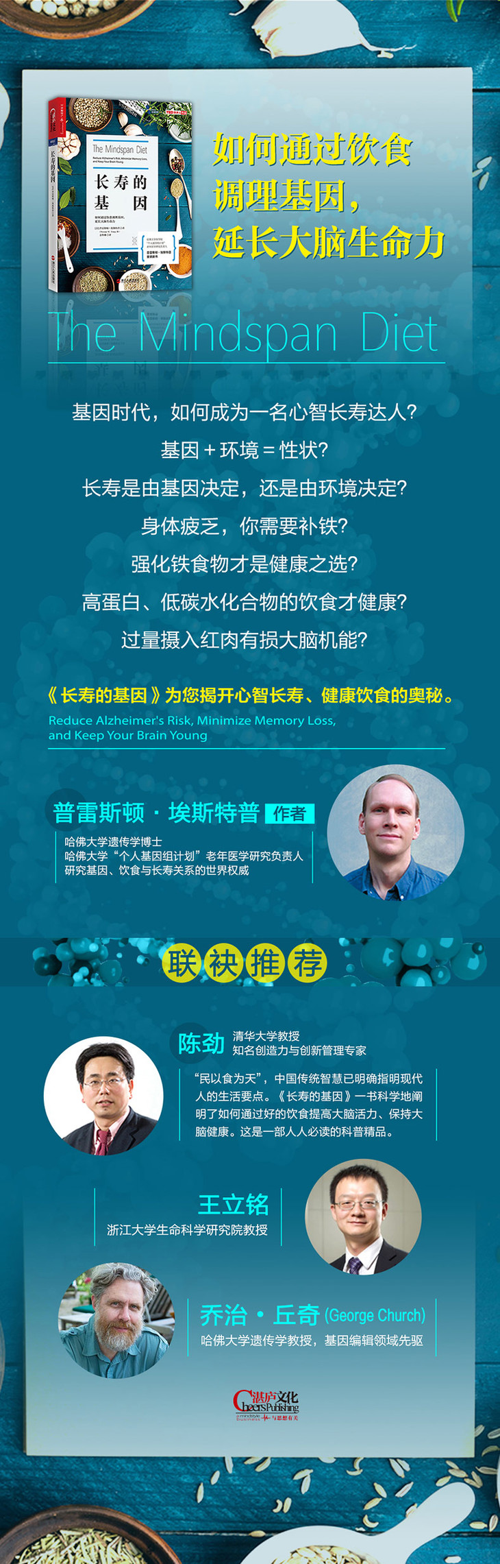 通过饮食调理我们的基因,积极影响基因表达,就能让我们保持健康的身体状态和旺盛的大脑生命力。其中,低含铁量、低血糖指数的精制碳水化合物(LIGIR),是有益于健康长寿的最佳碳水化合物;不饱和脂肪酸构成了人体的必需元素,也是生命活动的基础;饱和脂肪酸好坏参半,而反式脂肪酸则是百害而无一利。与传统“高蛋白、低碳水化合物”的饮食理念相反,“低蛋白、高碳水化合物”才是增强大脑生命力的关键。此外,富含神秘X因素的面包、红酒、醋、乳酪和酸奶更是不可多得的健康饮食。