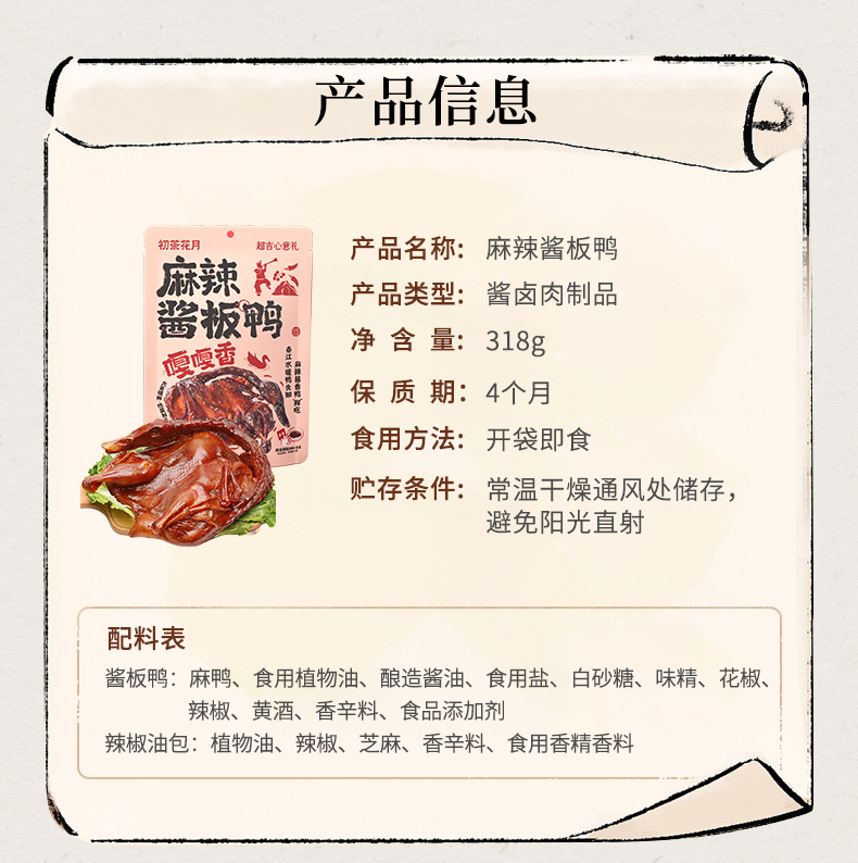 初茶花月麻辣酱板鸭318g/袋 鲜香麻辣 酱香浓郁