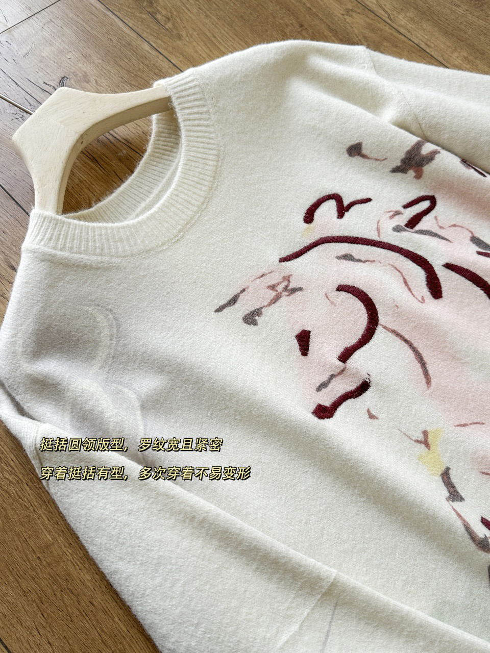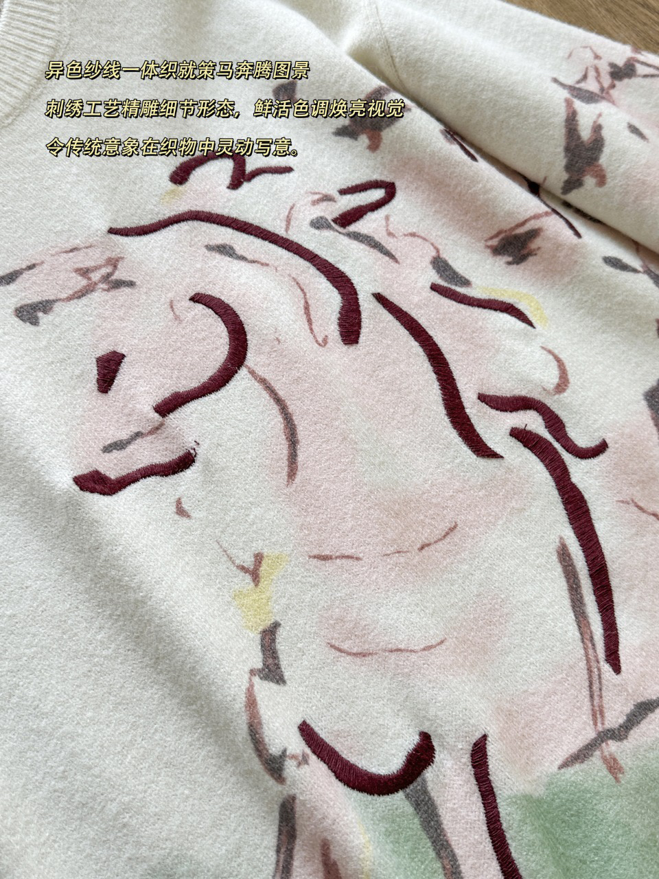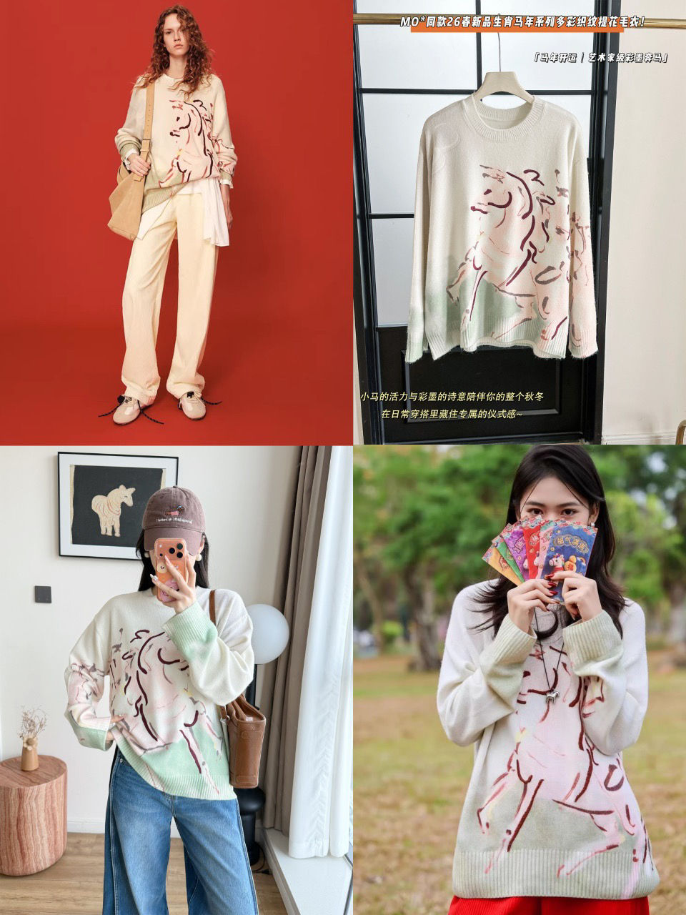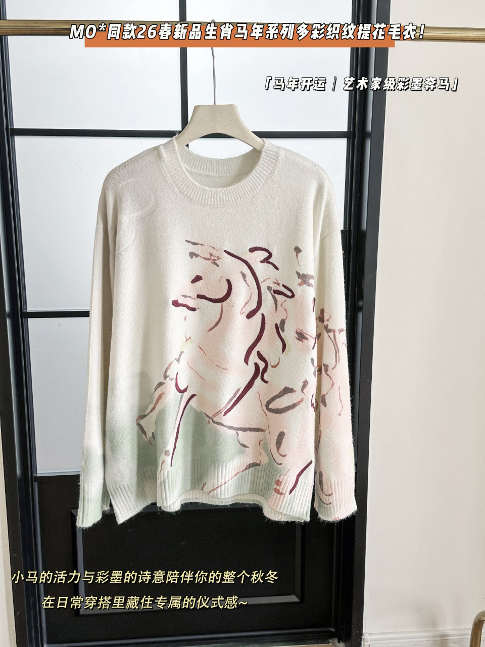 MO*同款26春新品生肖马年系列多彩织纹提花毛衣!「马年开运|艺术家级彩墨奔马」挺括圆领版型,罗纹宽且紧密,穿着挺括有型,多次穿着不易变形