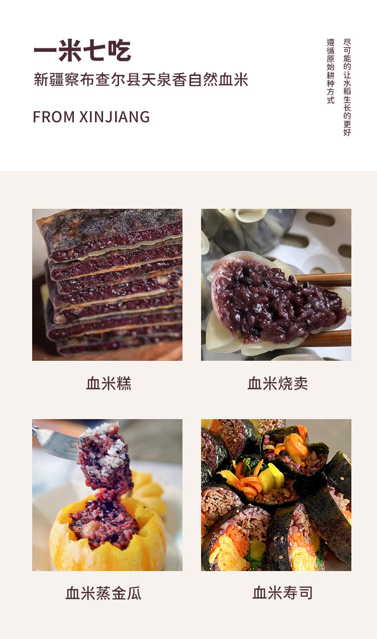 昔日皇御贡米,米中佳品。天山雪水灌溉,弱碱黑土滋养,日照充足的自然条件成就了血米的营养。“最好的大米在新疆”,原生态种植模式,营养丰富、稻香浓郁。