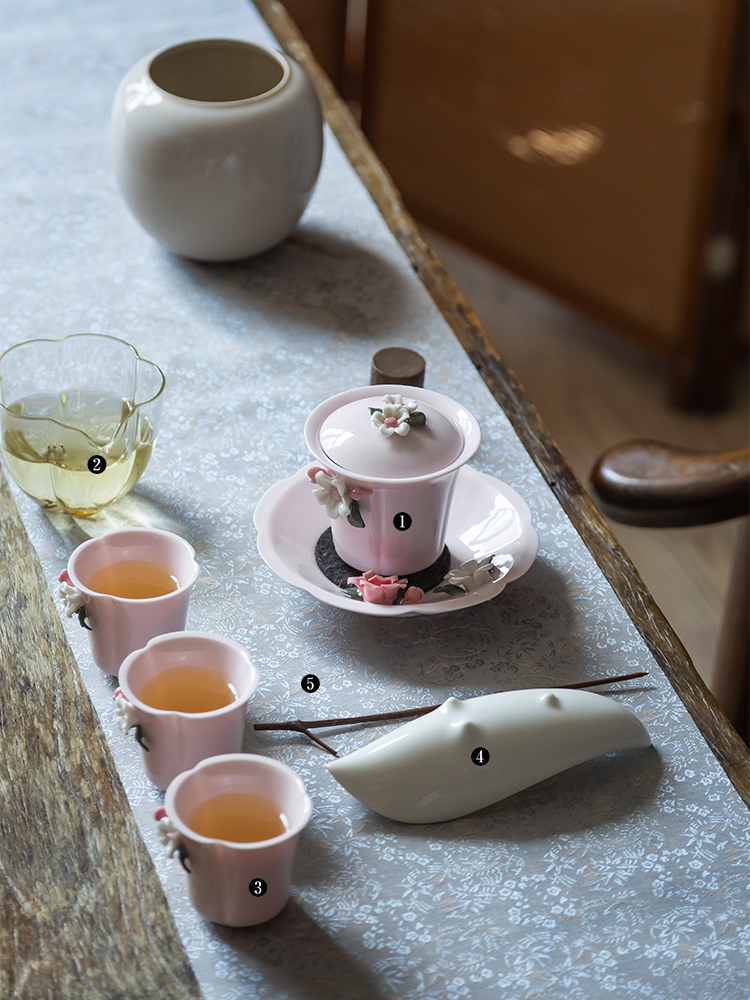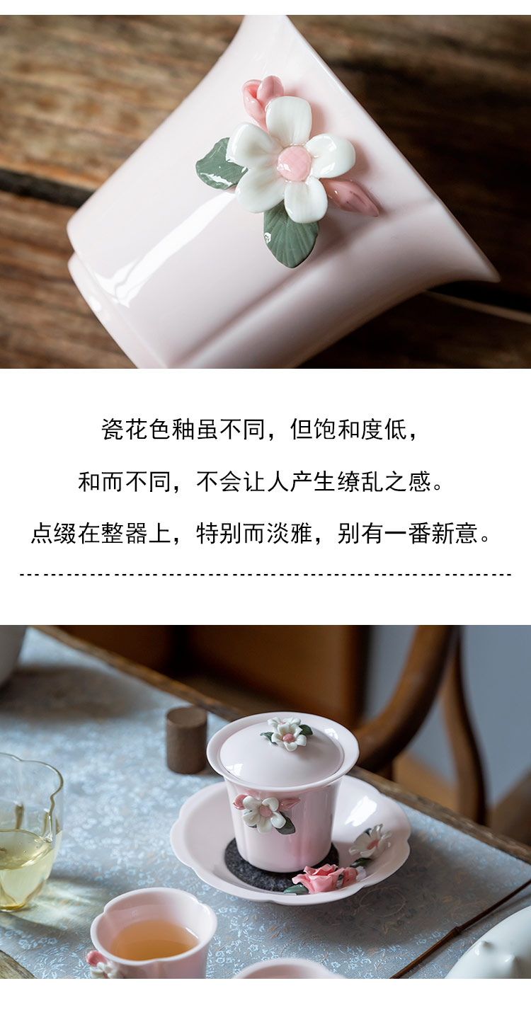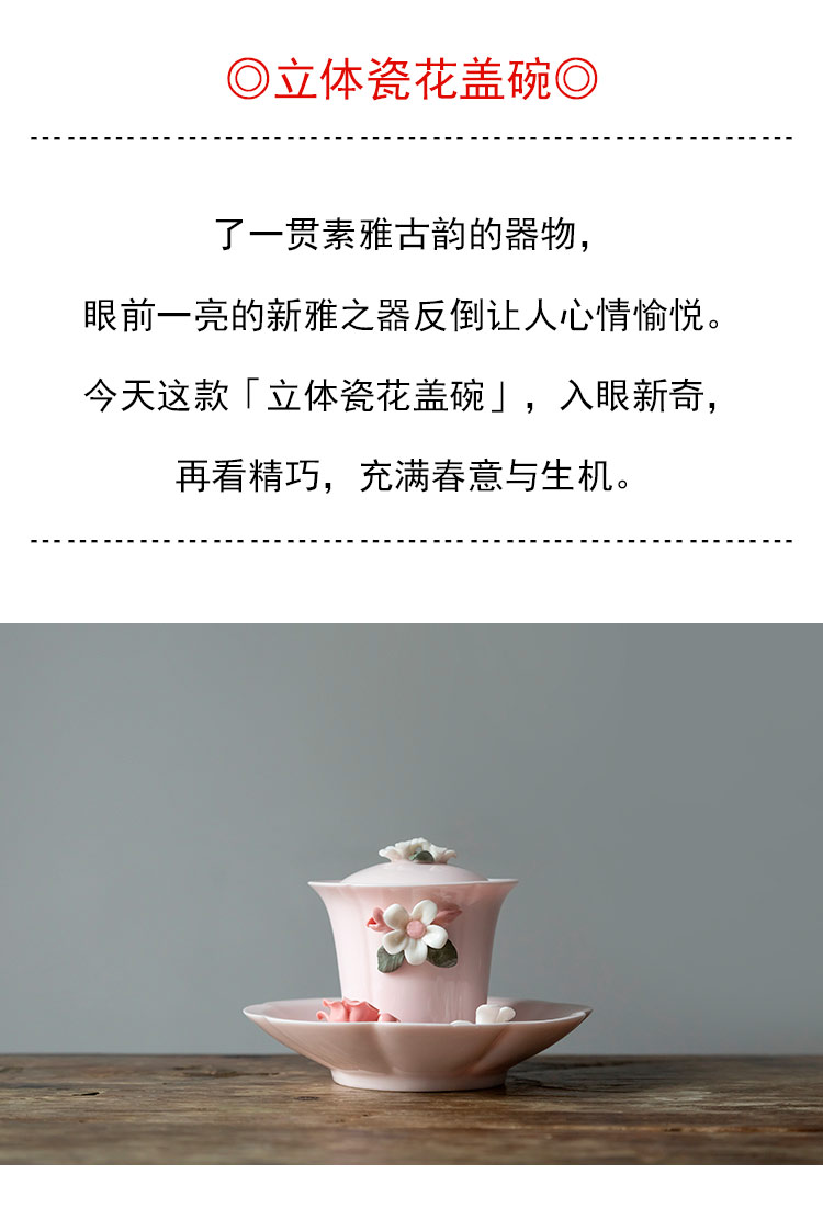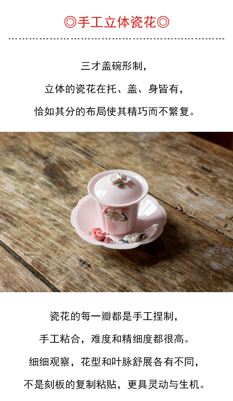 茶香记 立体瓷花盖碗三才盖碗手工瓷花130ml淡雅粉新颖优雅泡茶碗