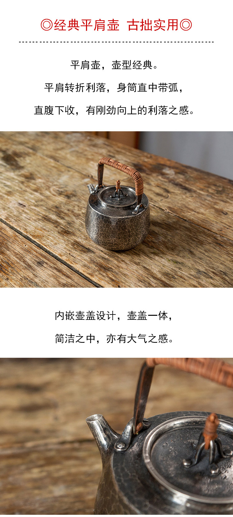 茶香记 纯手工 手打一体银壶 小平肩银壶 手打锤纹 平肩器型 藤编提梁