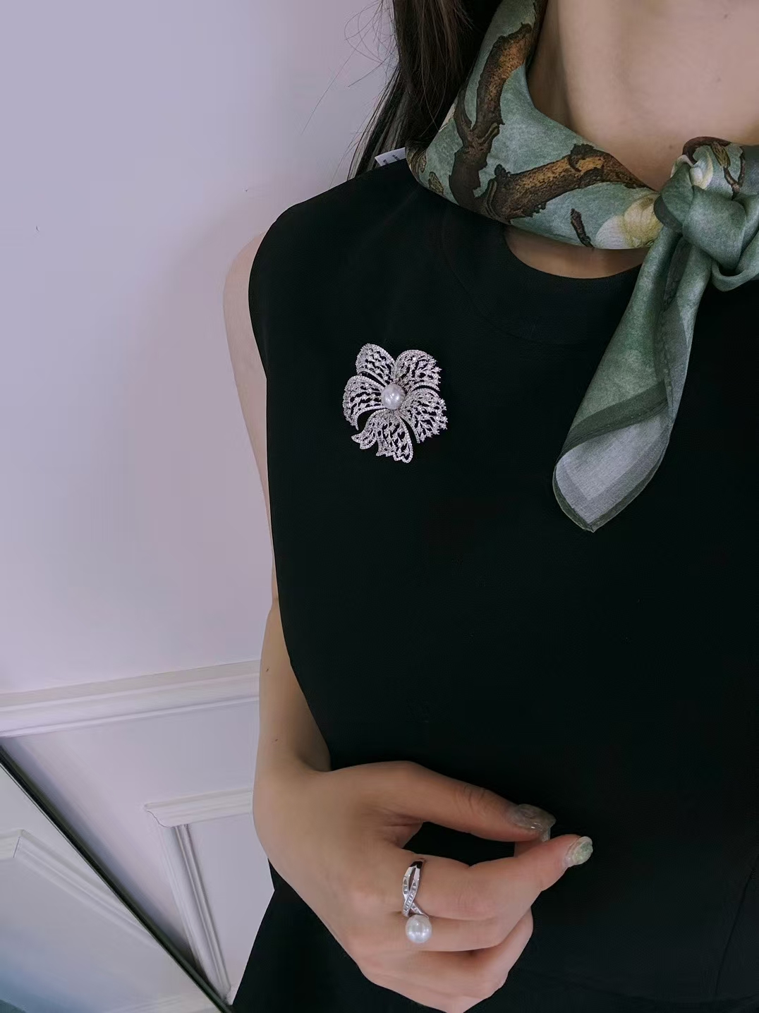 【甄珠贝·国风系列】70*70cm玉兰花丝巾和杏花天然淡水珍珠胸针丝巾礼盒套装