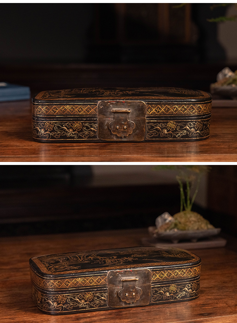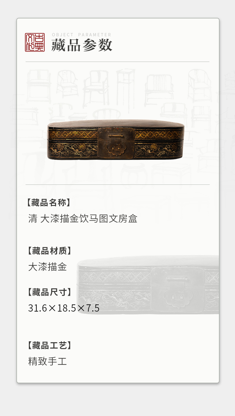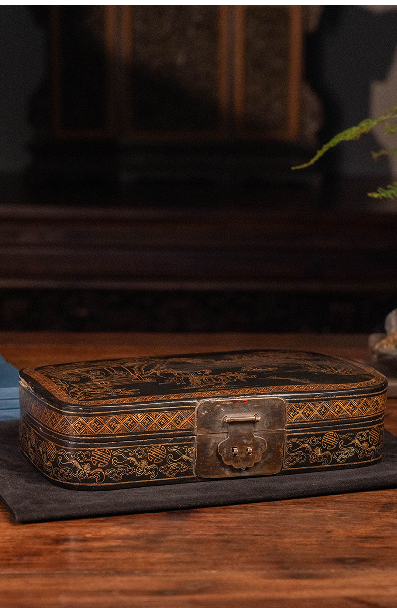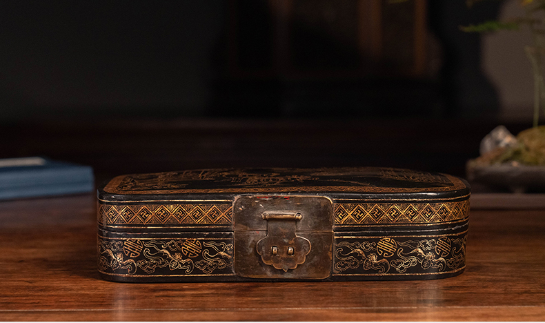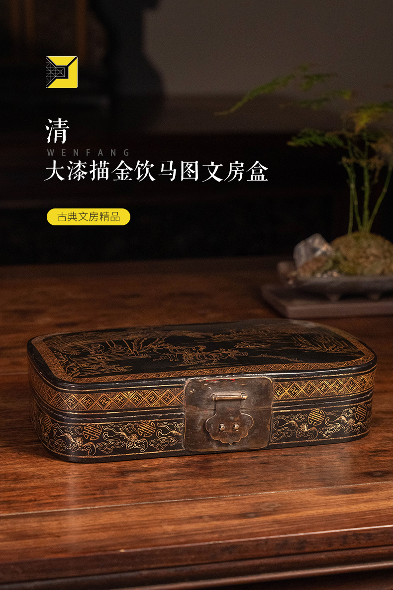 清 大漆描金饮马图文房盒