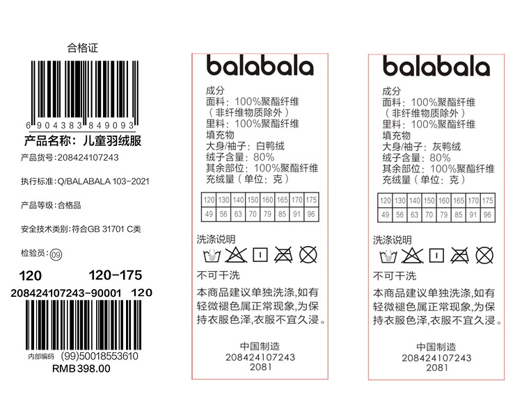 巴拉巴拉童装儿童轻薄羽绒服男童女童冬季新款中大童短款外套
