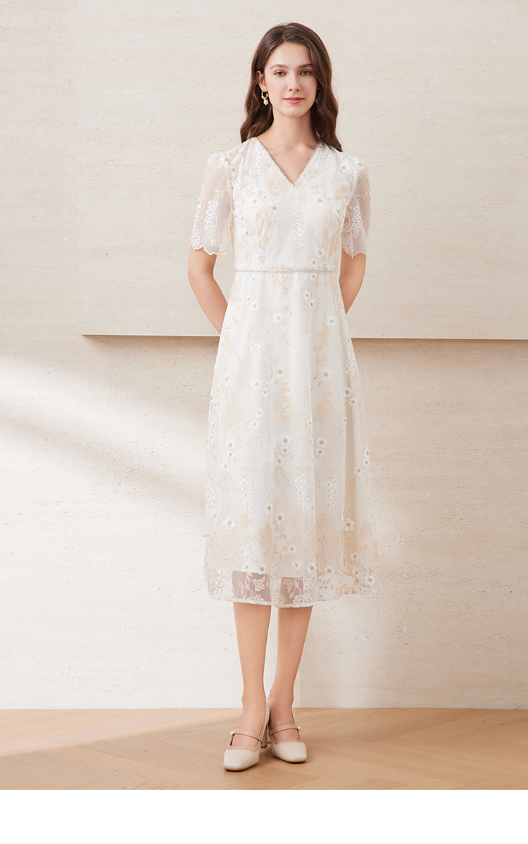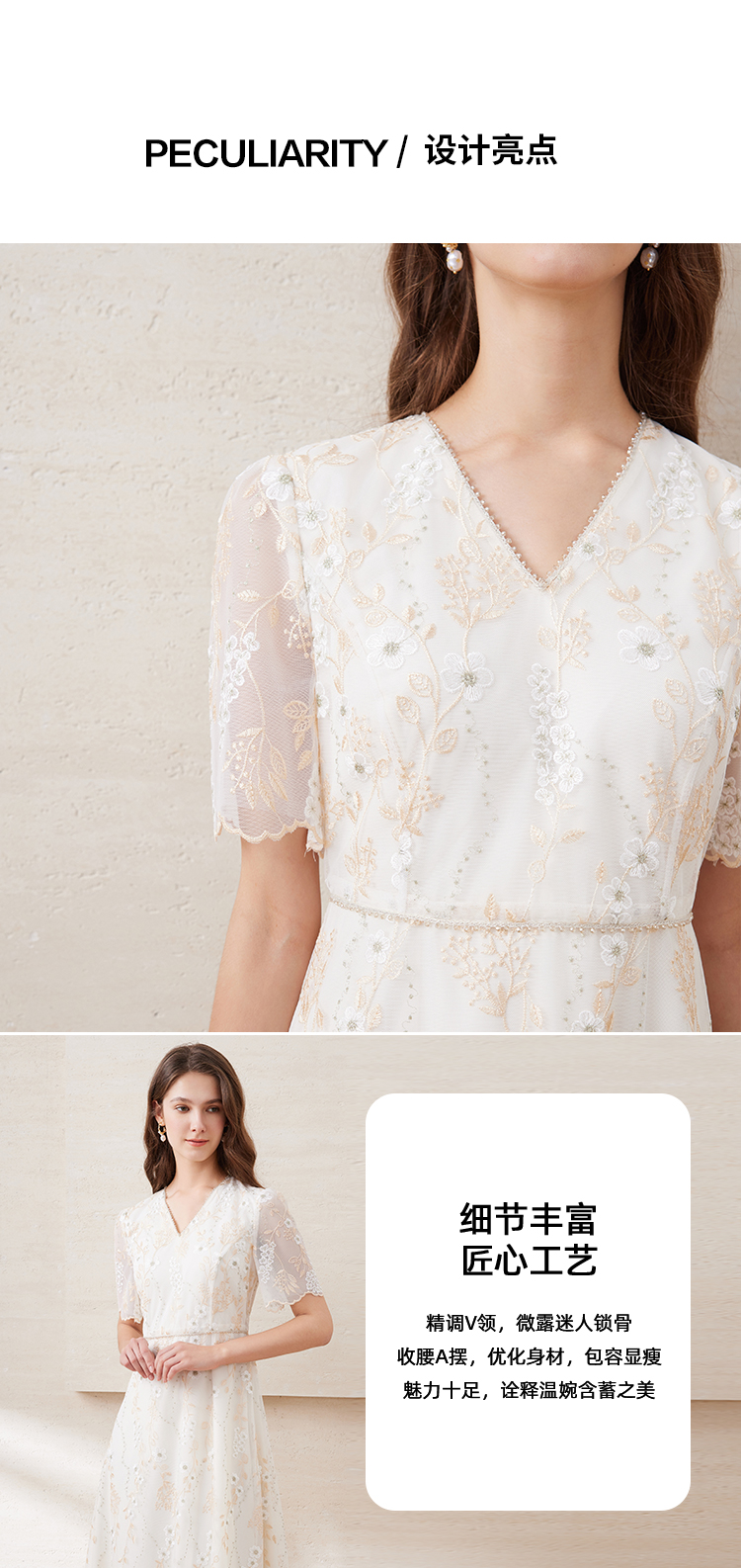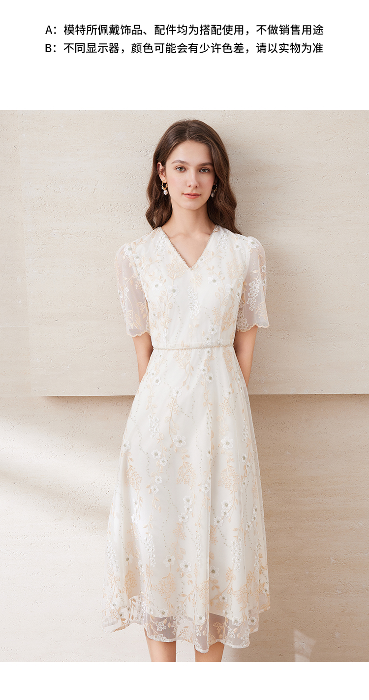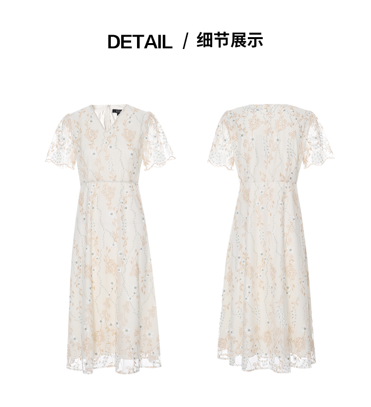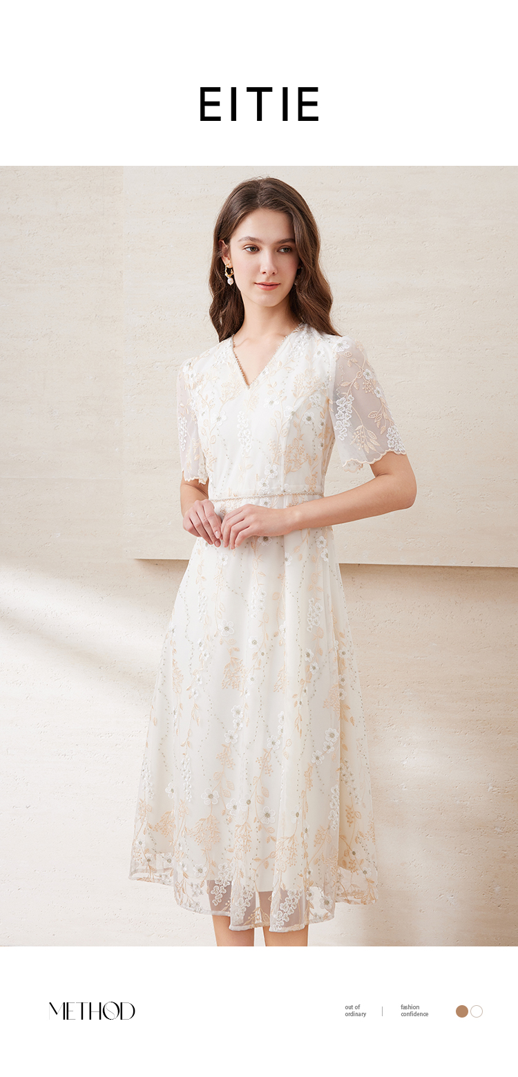 【温柔奶油色重工蕾丝连衣裙】EITIE爱特爱显瘦V领网纱2025夏新款B2507606