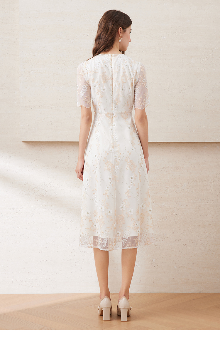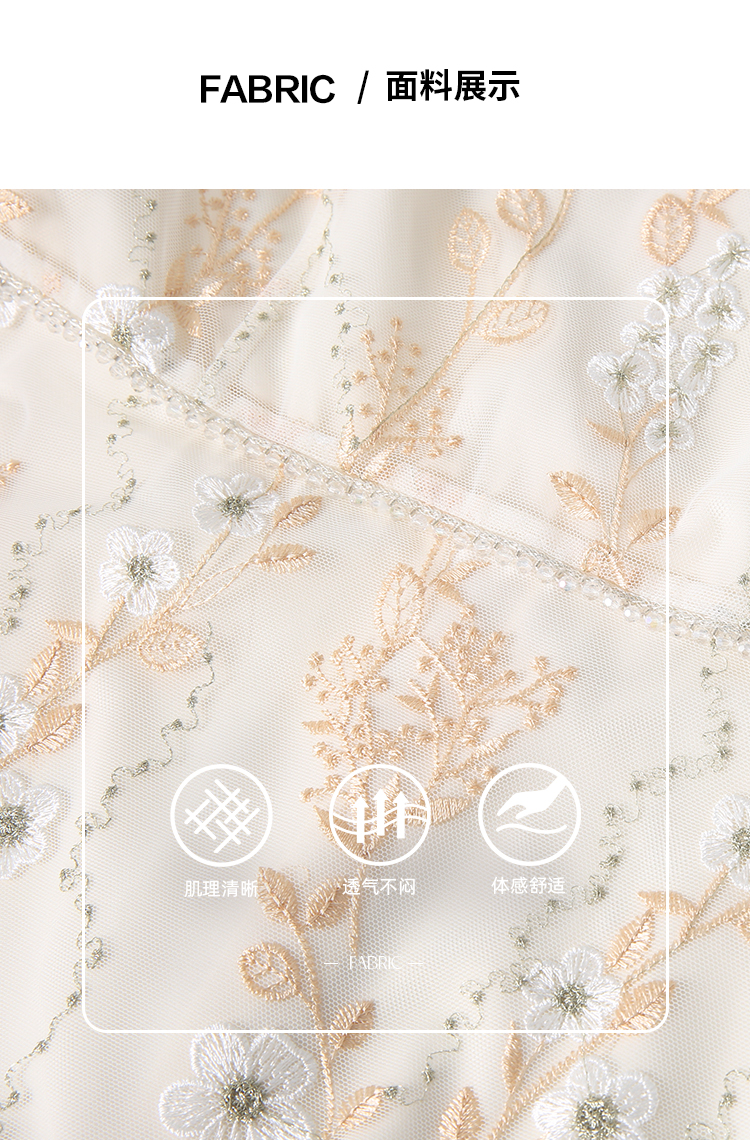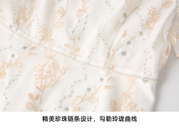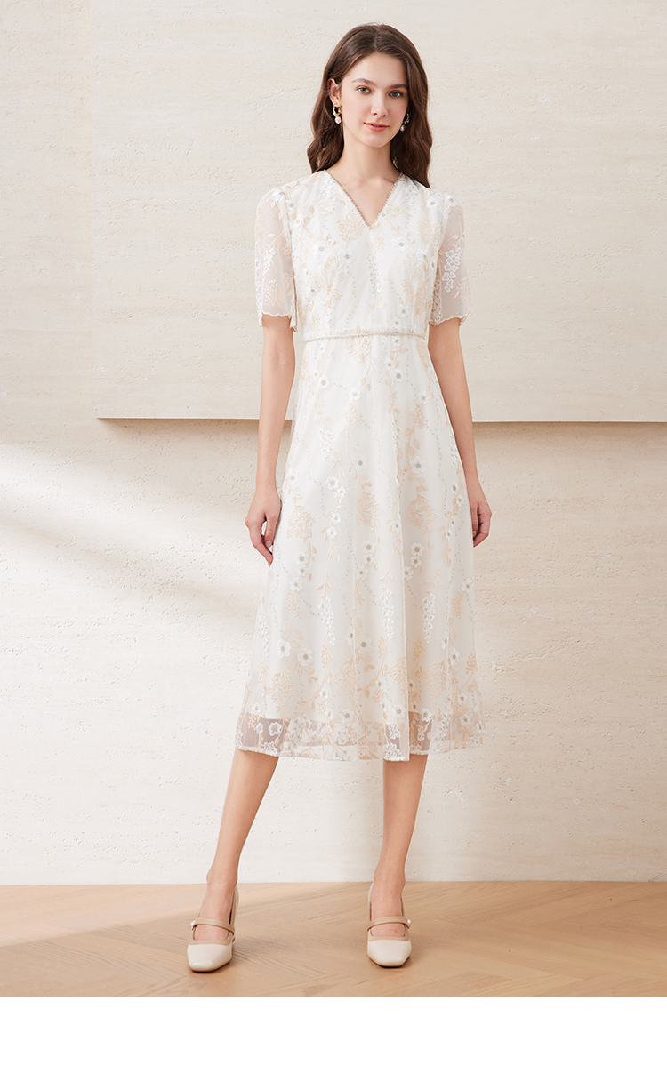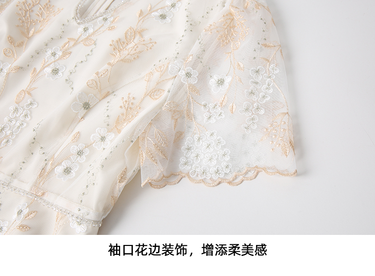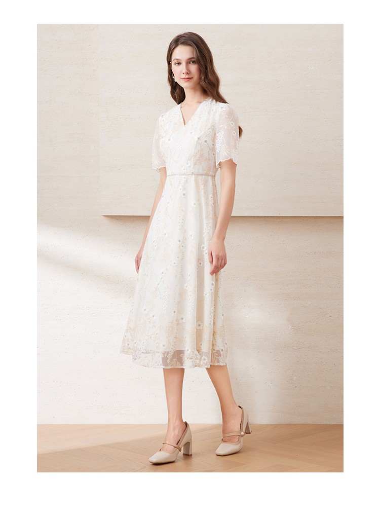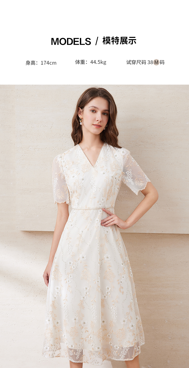 【温柔奶油色重工蕾丝连衣裙】EITIE爱特爱显瘦V领网纱2025夏新款B2507606