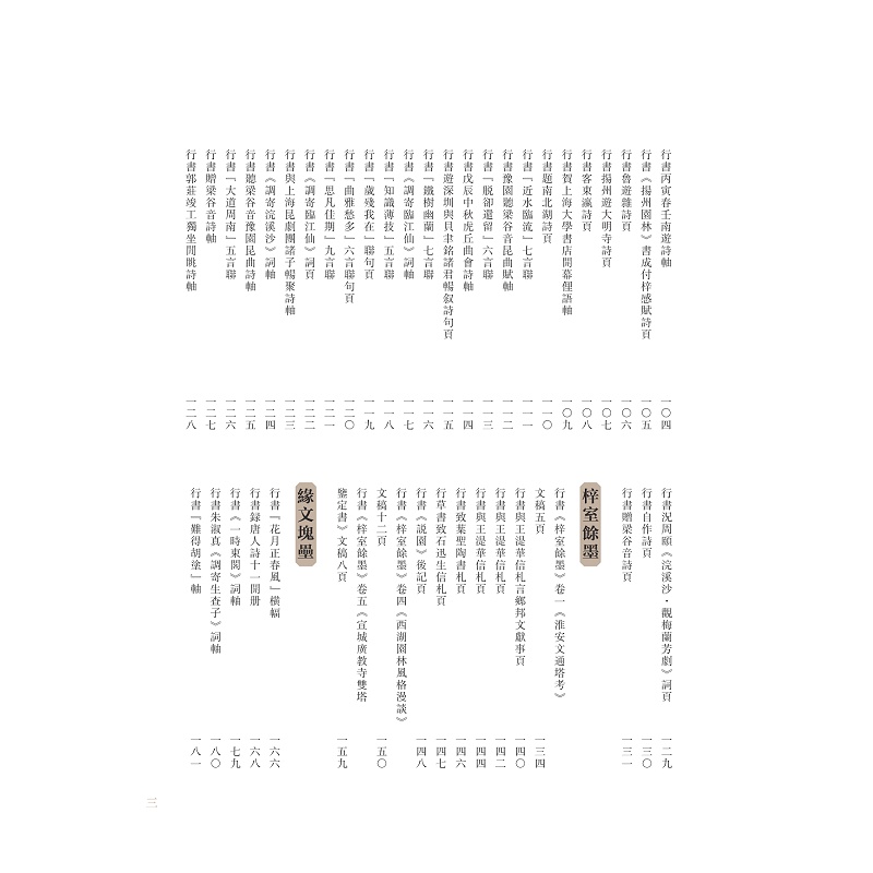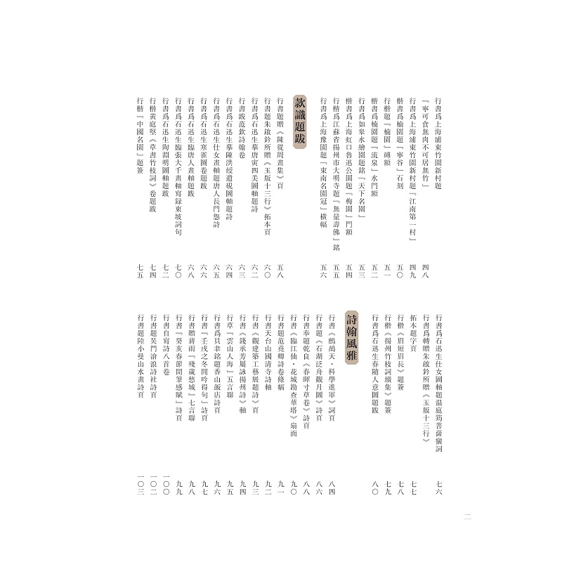 此二书为《陈从周全集》的补遗,从搜集的数百幅陈从周书画作品中精选具有代表性的,汇成二册。《绘画集》按画作时间排序,《书法集》则先分类再按时序次。二书都有序跋卷首,简介陈从周学书画经历、艺术成就与特点,并讲述二书编纂情况。每幅作品都附有尺幅、释文、款识、钤印、作年等基本情况,便于读者赏玩。