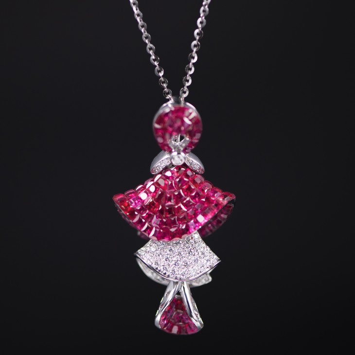 这枚吊坠由红宝石和钻石分层坠下,形成一个身着红的舞者,每一段可自由晃动,热情起舞,光彩照人,灵动而闪烁。