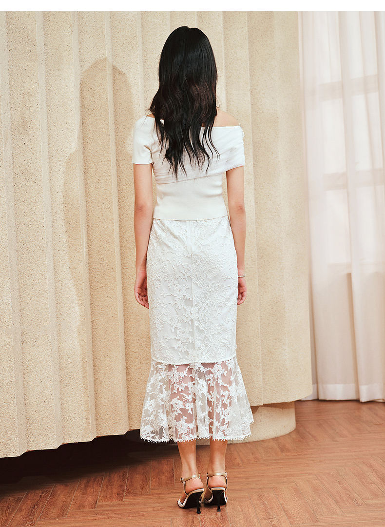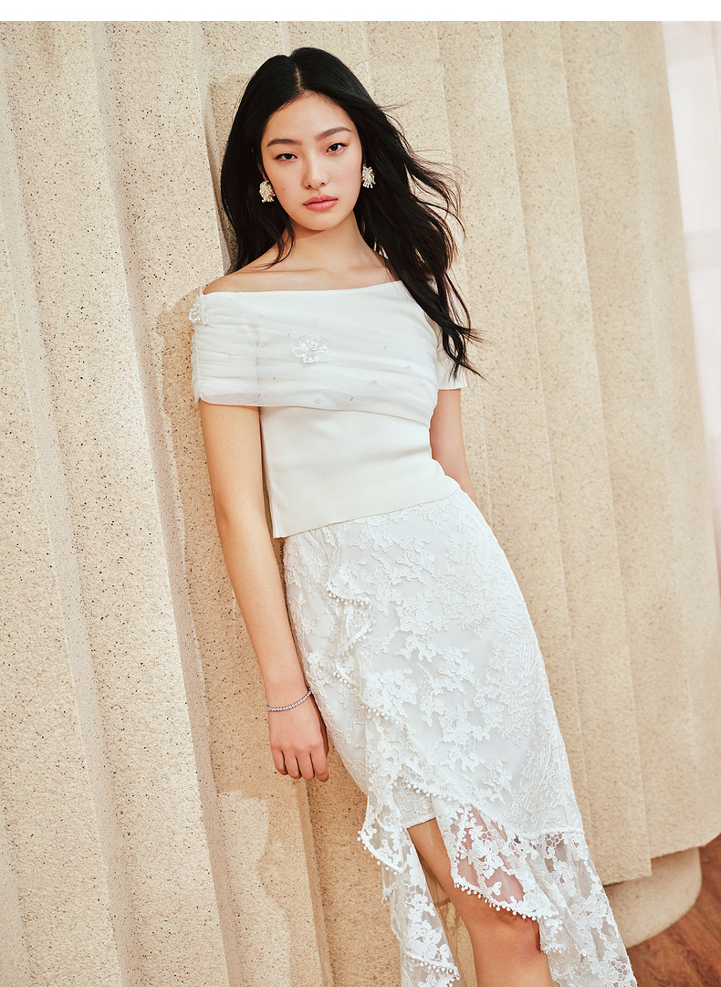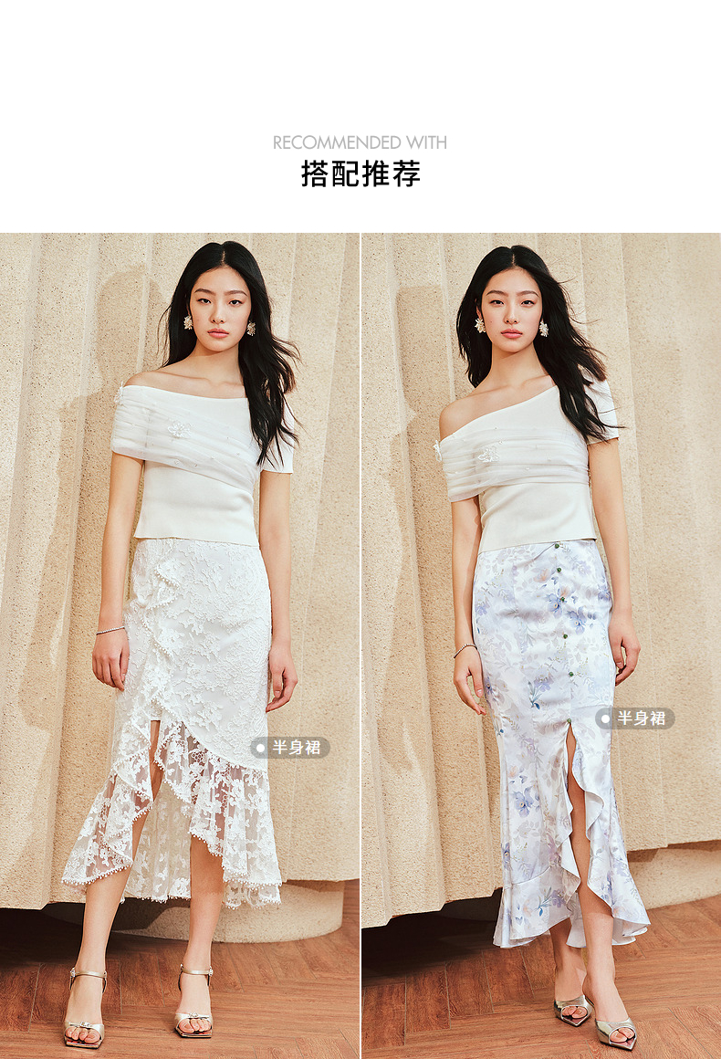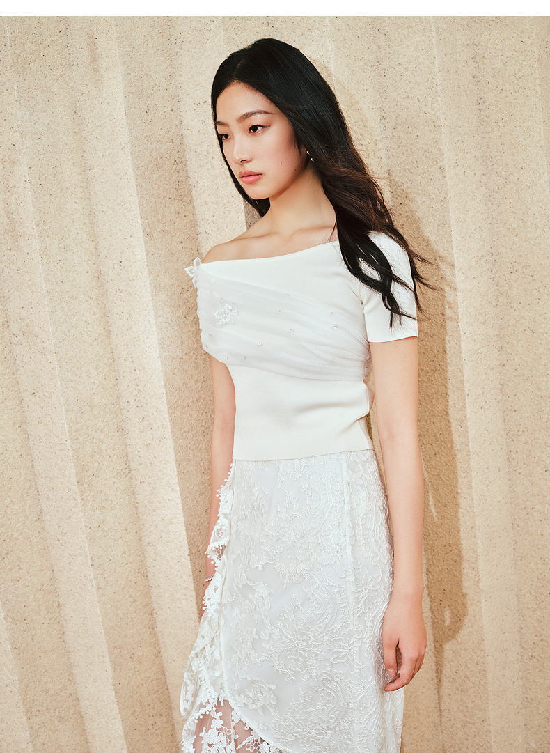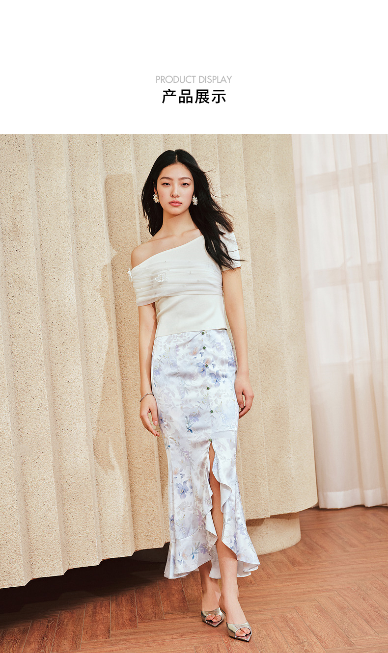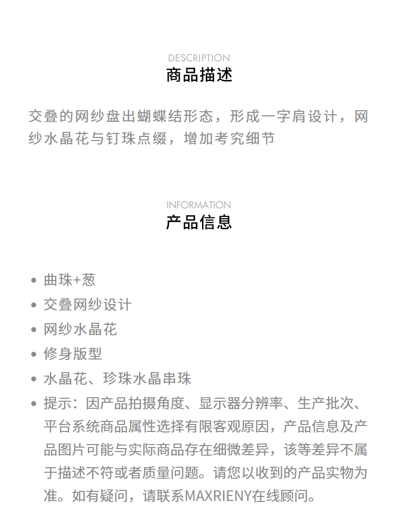 MAXRIENY浪漫复古风网纱上衣2024夏季新款水晶吊珠一字肩套头针织(货号:MS85SW033)