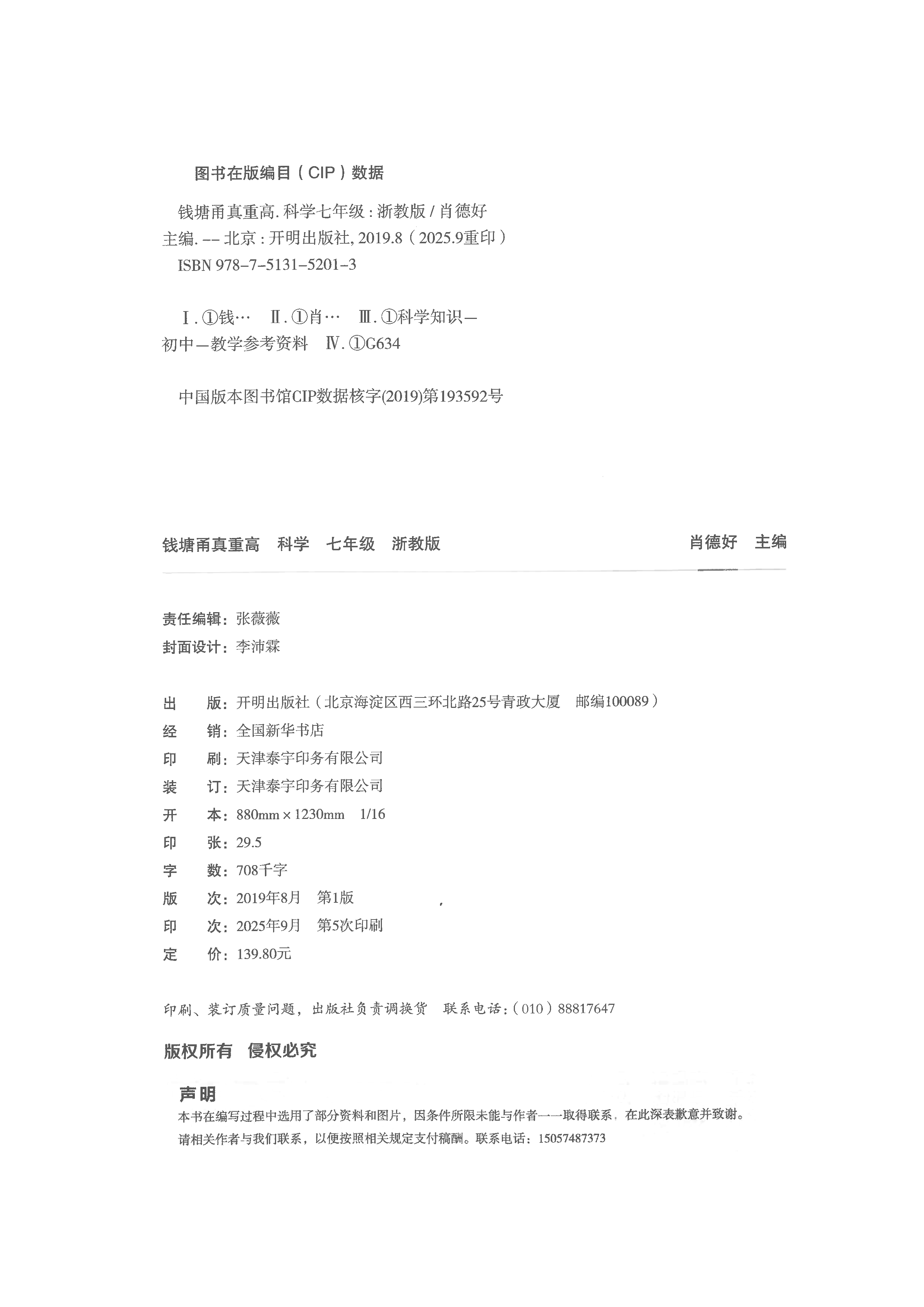 2025新版 钱塘甬真重高 科学 七年级全一册 ZJ浙教版