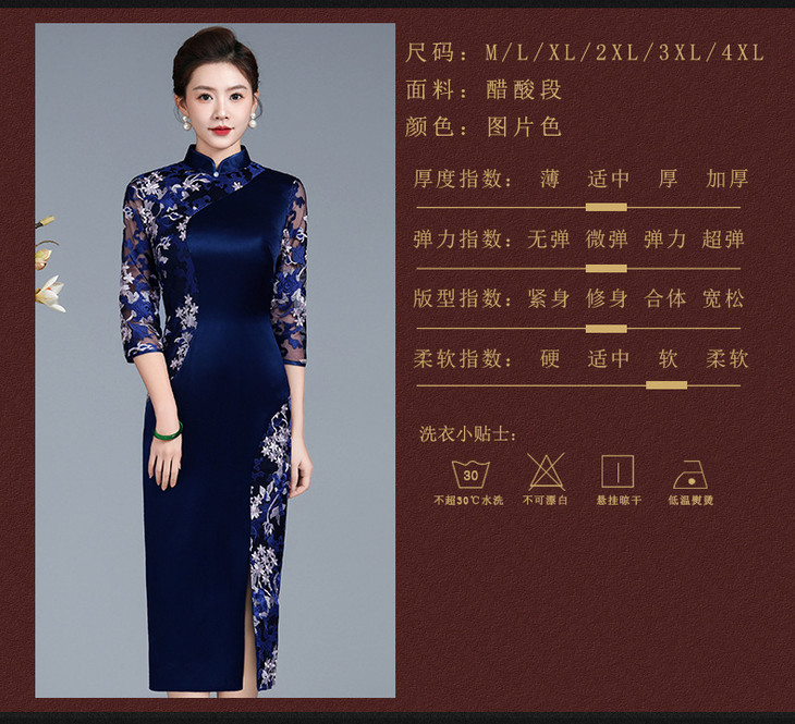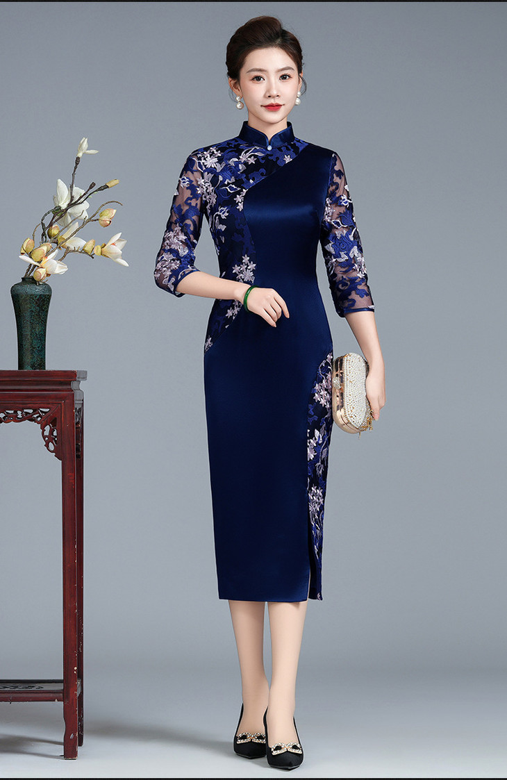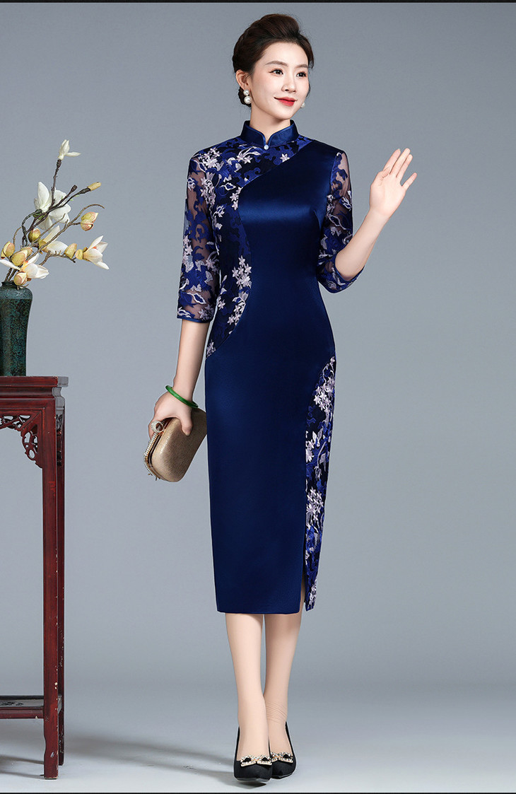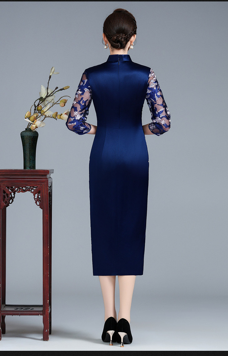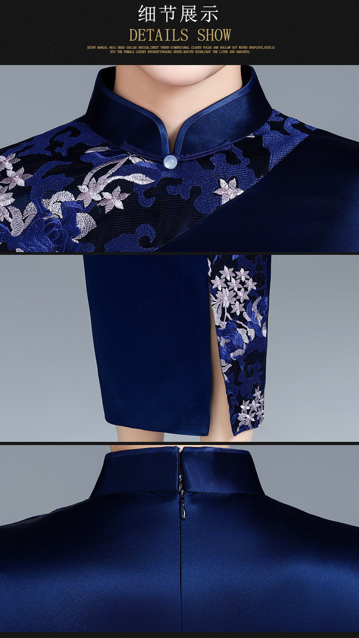 LHS-B111高端喜婆婆婚宴显瘦旗袍醋酸新款婚礼妈妈礼服修身蓝色双拼改良裙