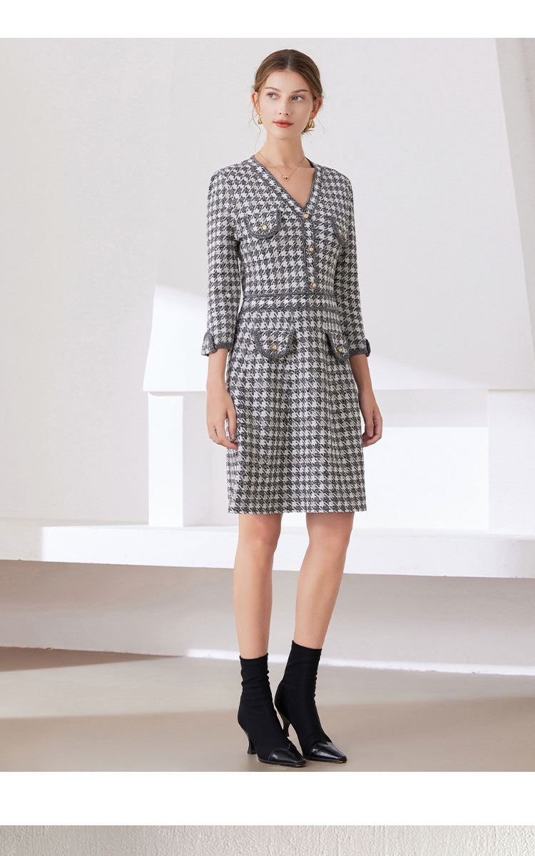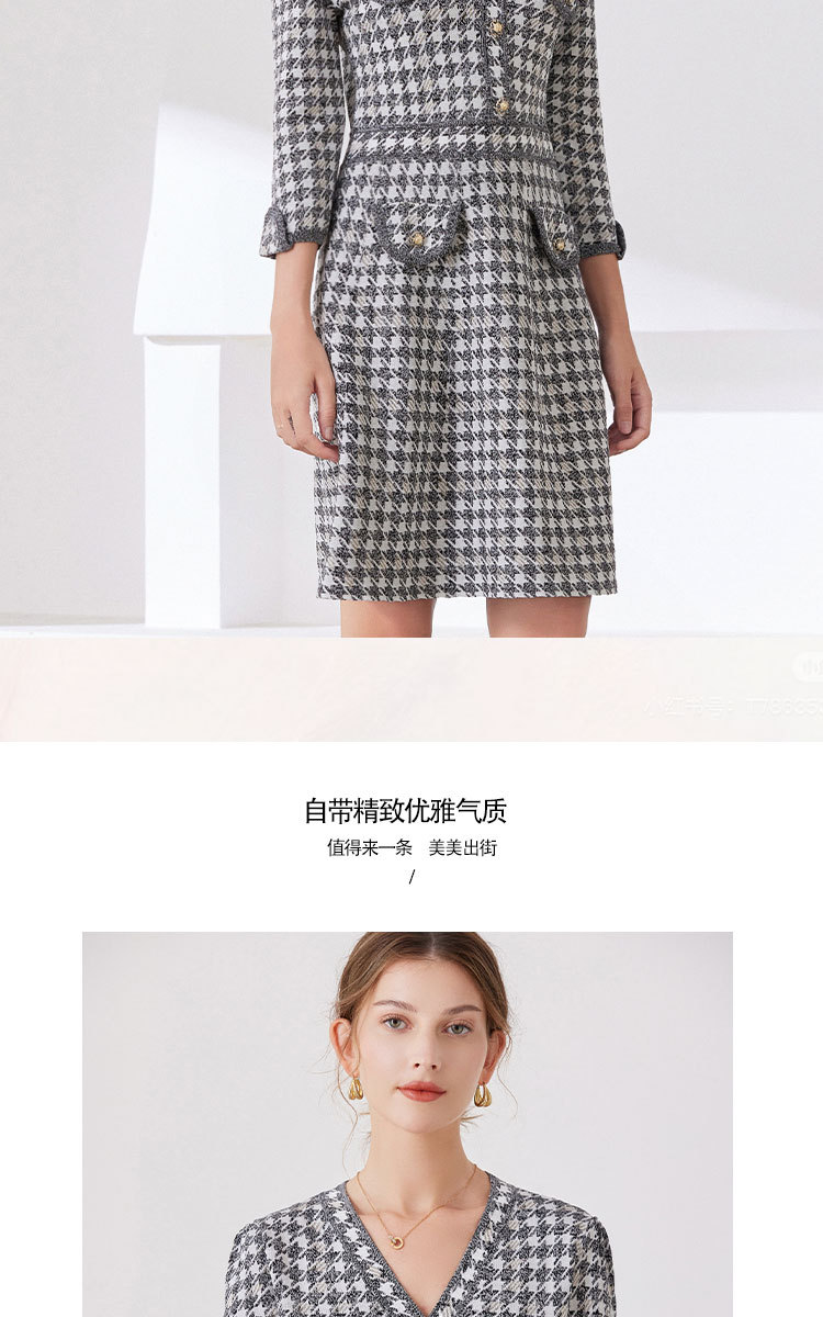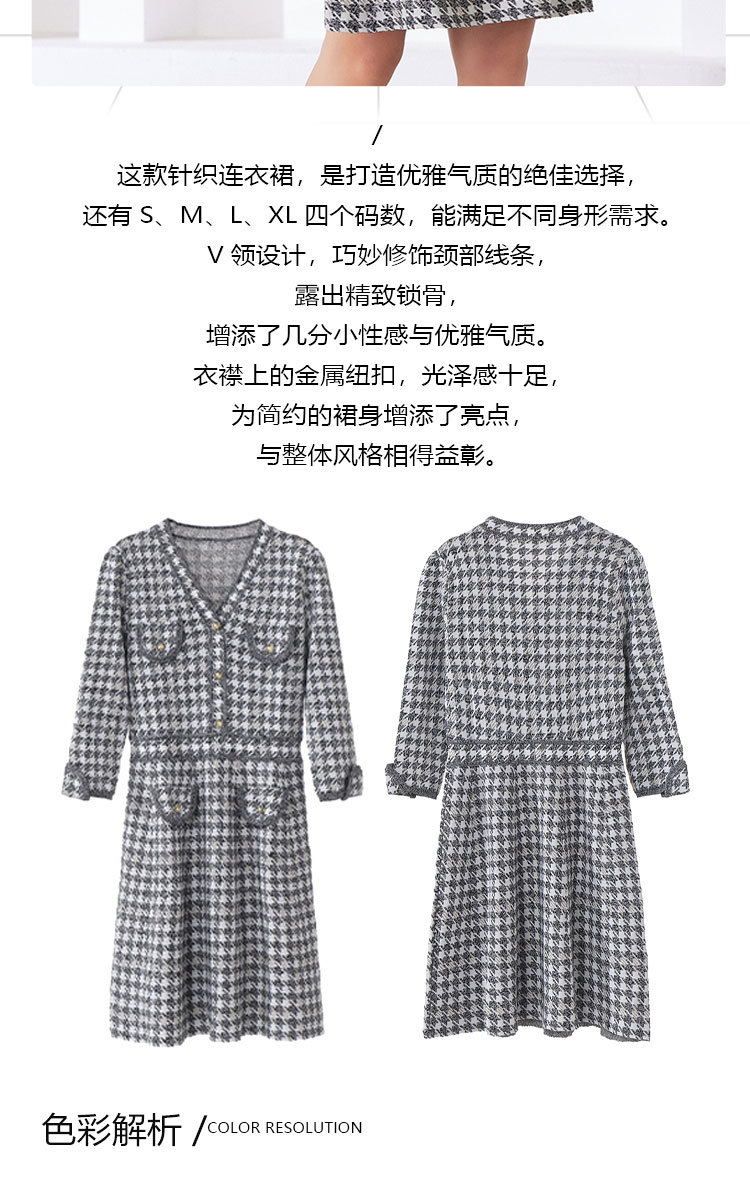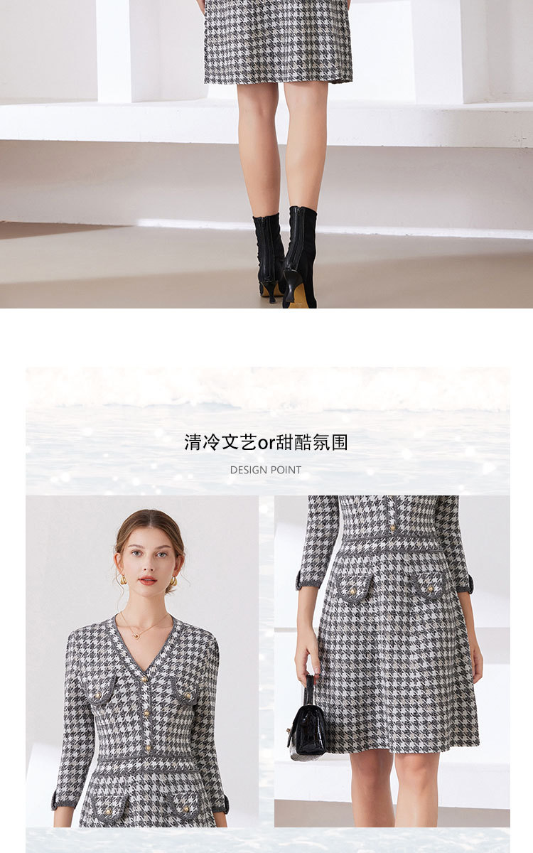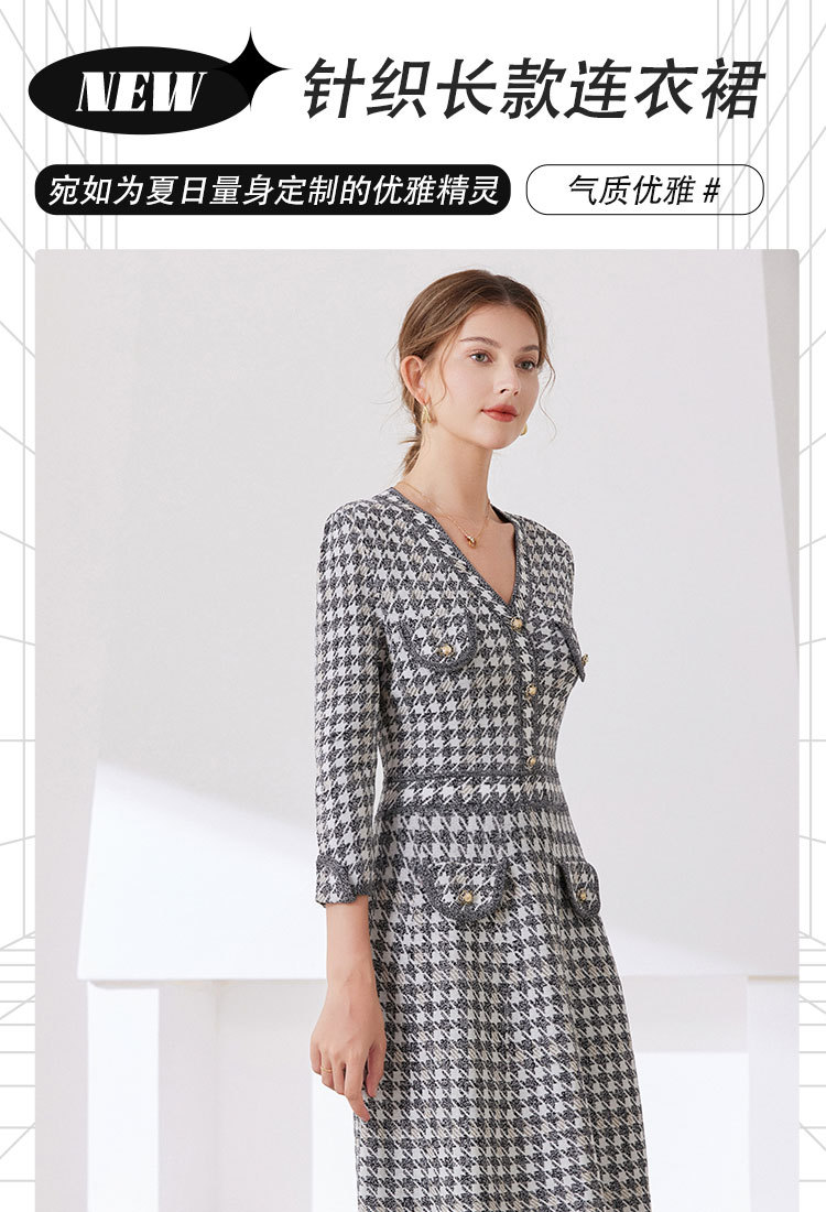 「自」全新升级【铂金会员441/天猫589/差价148】(53857)洛诗琳新款小香风千鸟格连衣裙2025秋季气质V领七分袖针织裙