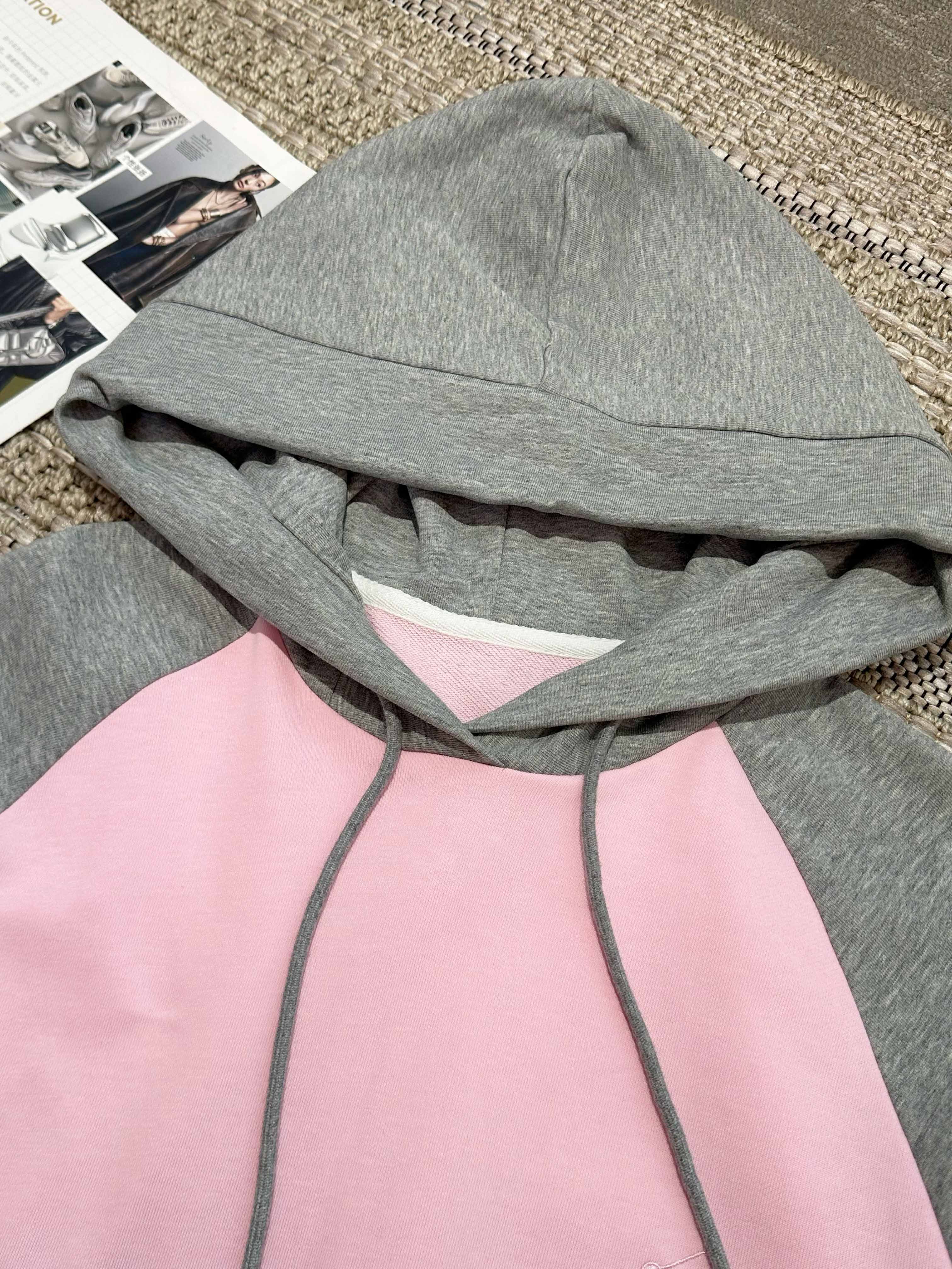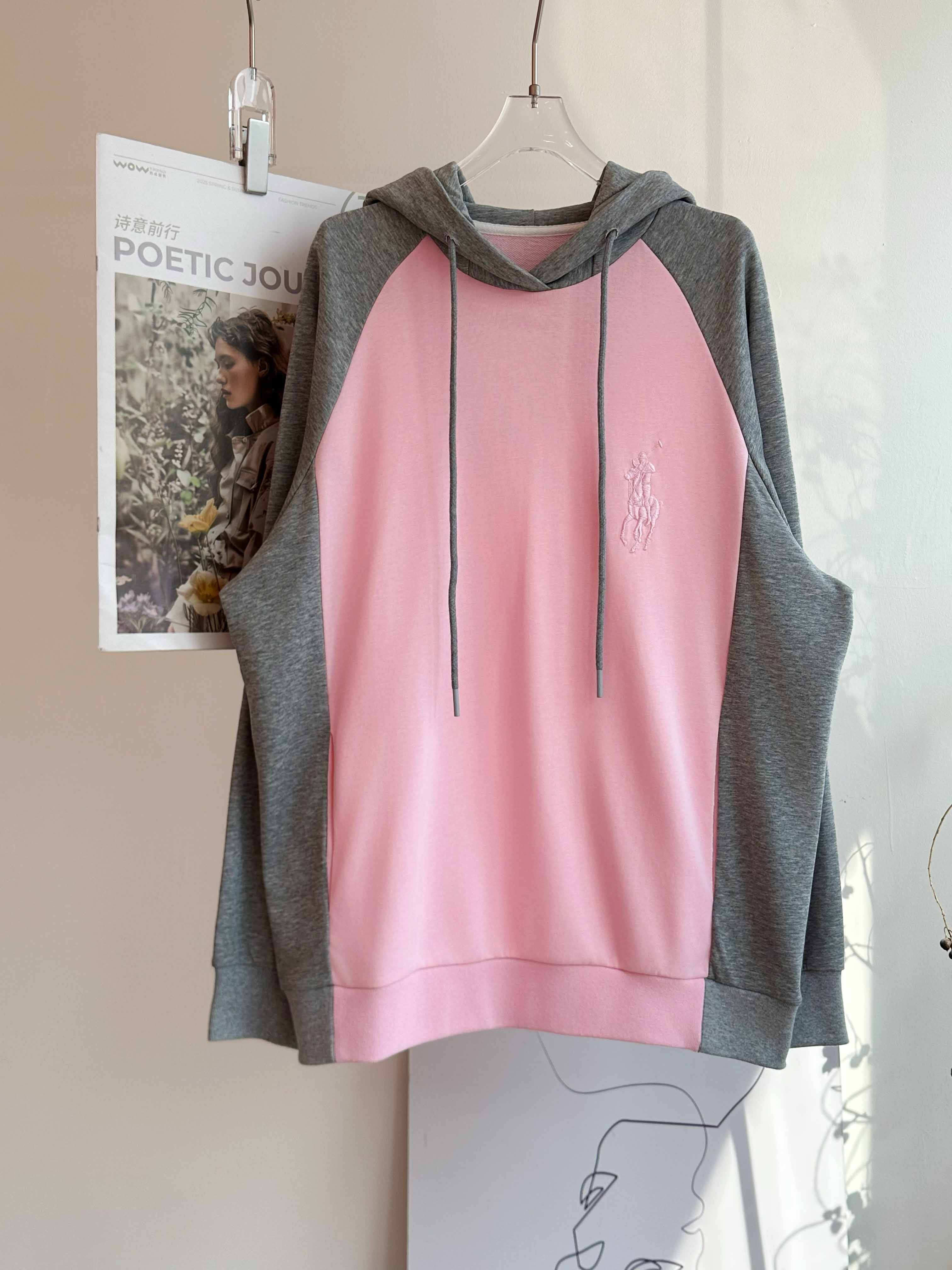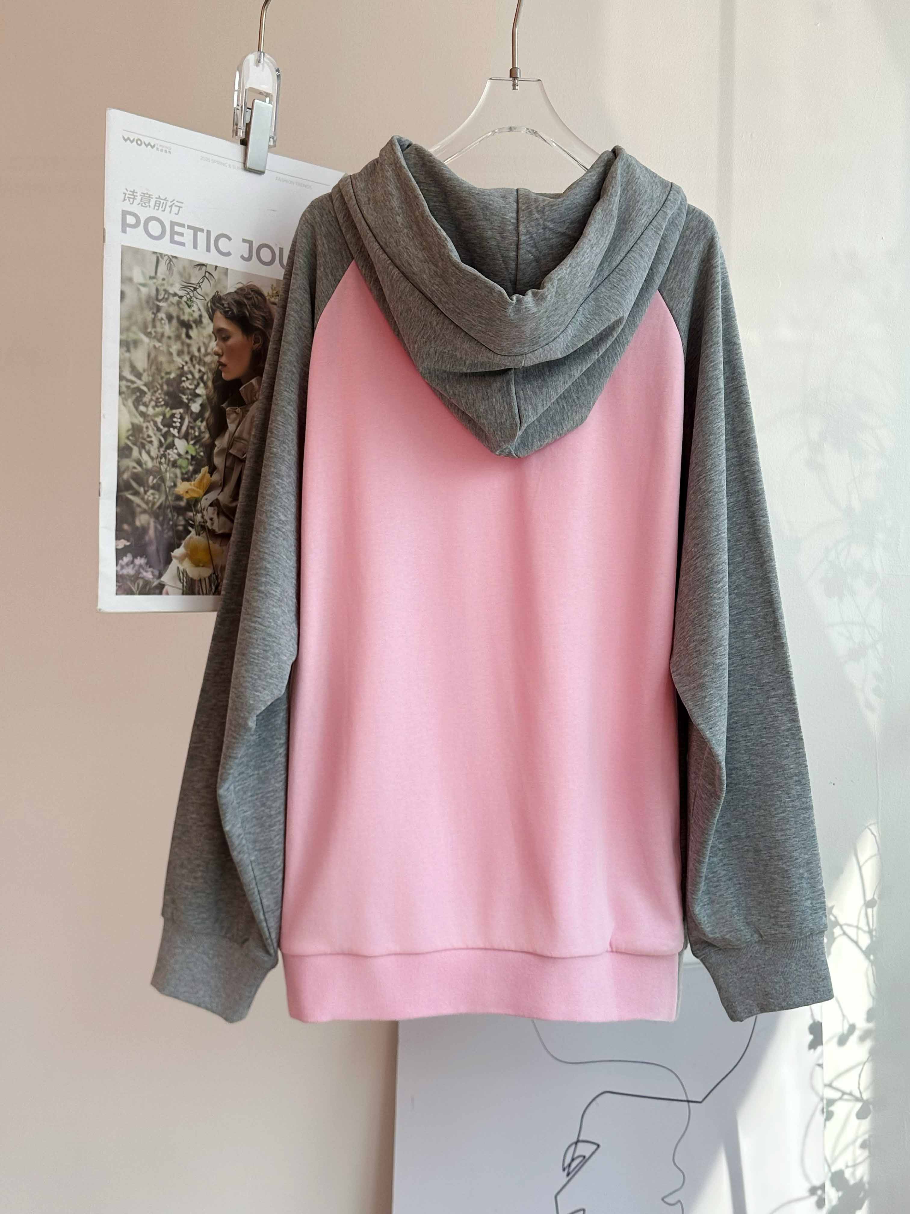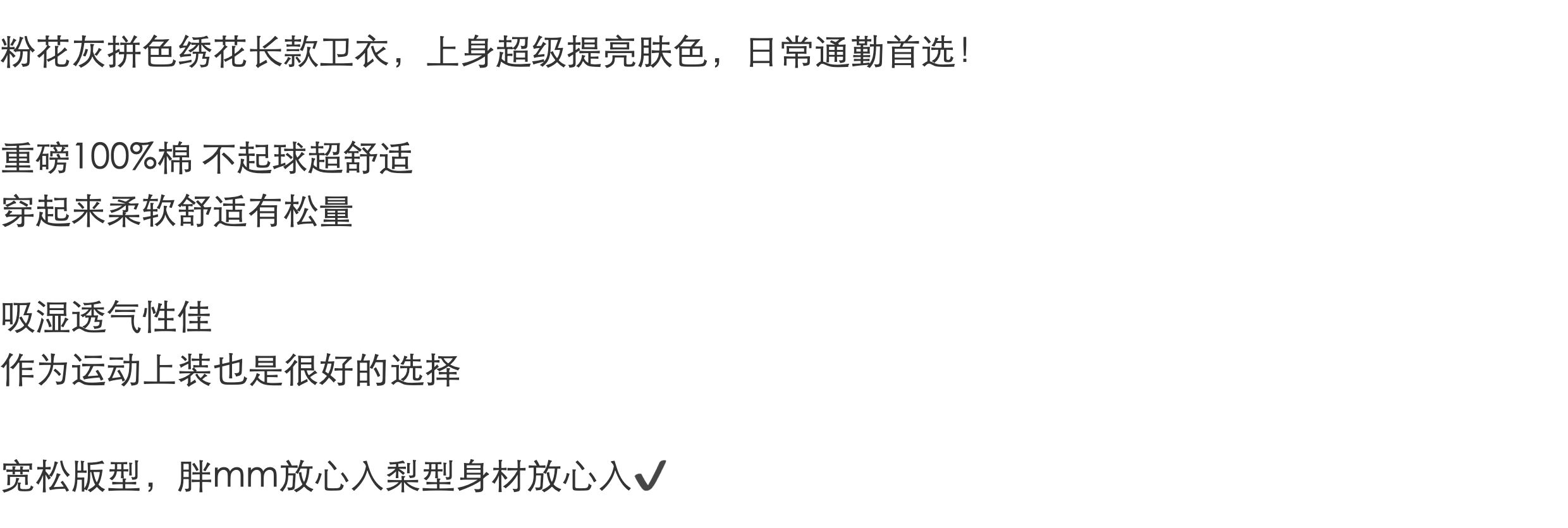 顺丰包邮33202洛诗琳粉花灰拼色绣花长款纯棉连帽卫衣女150278