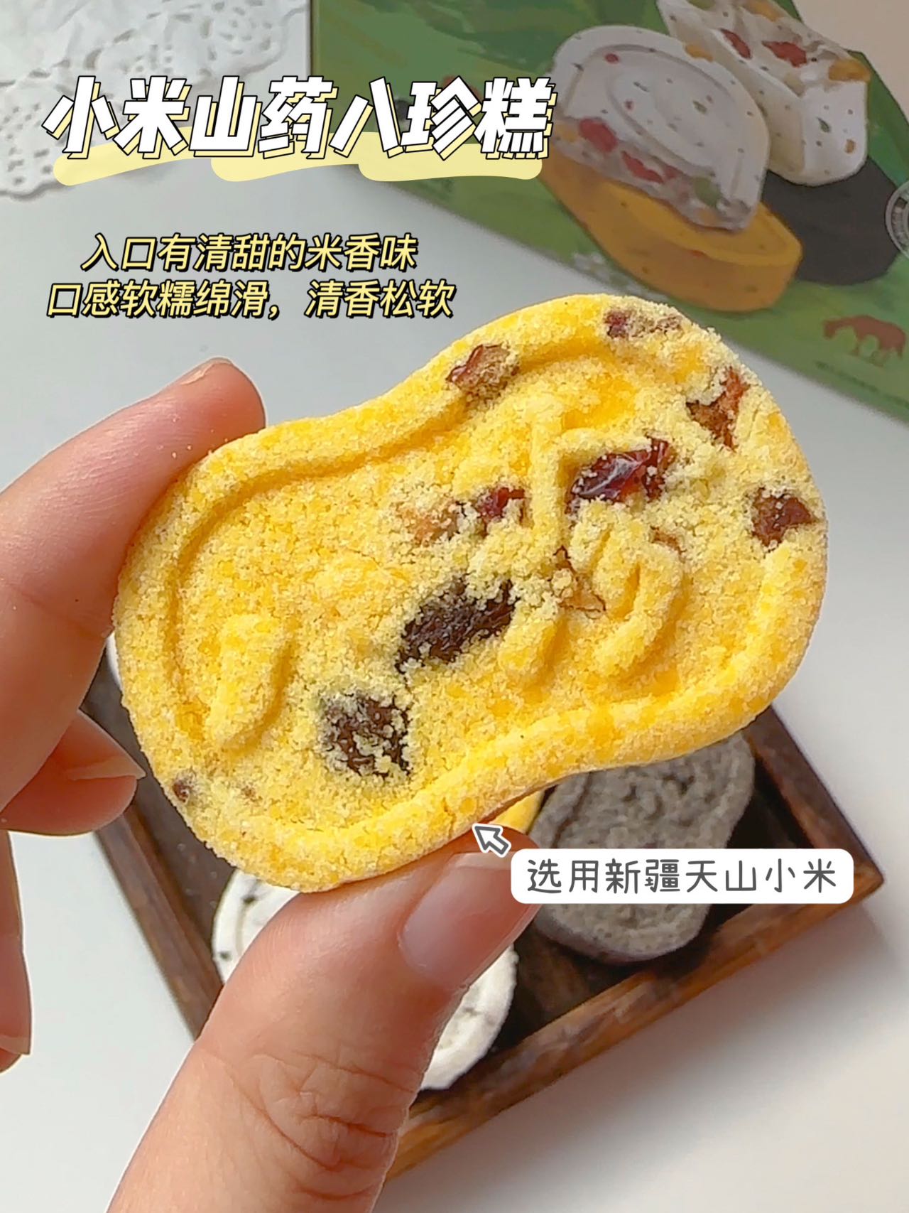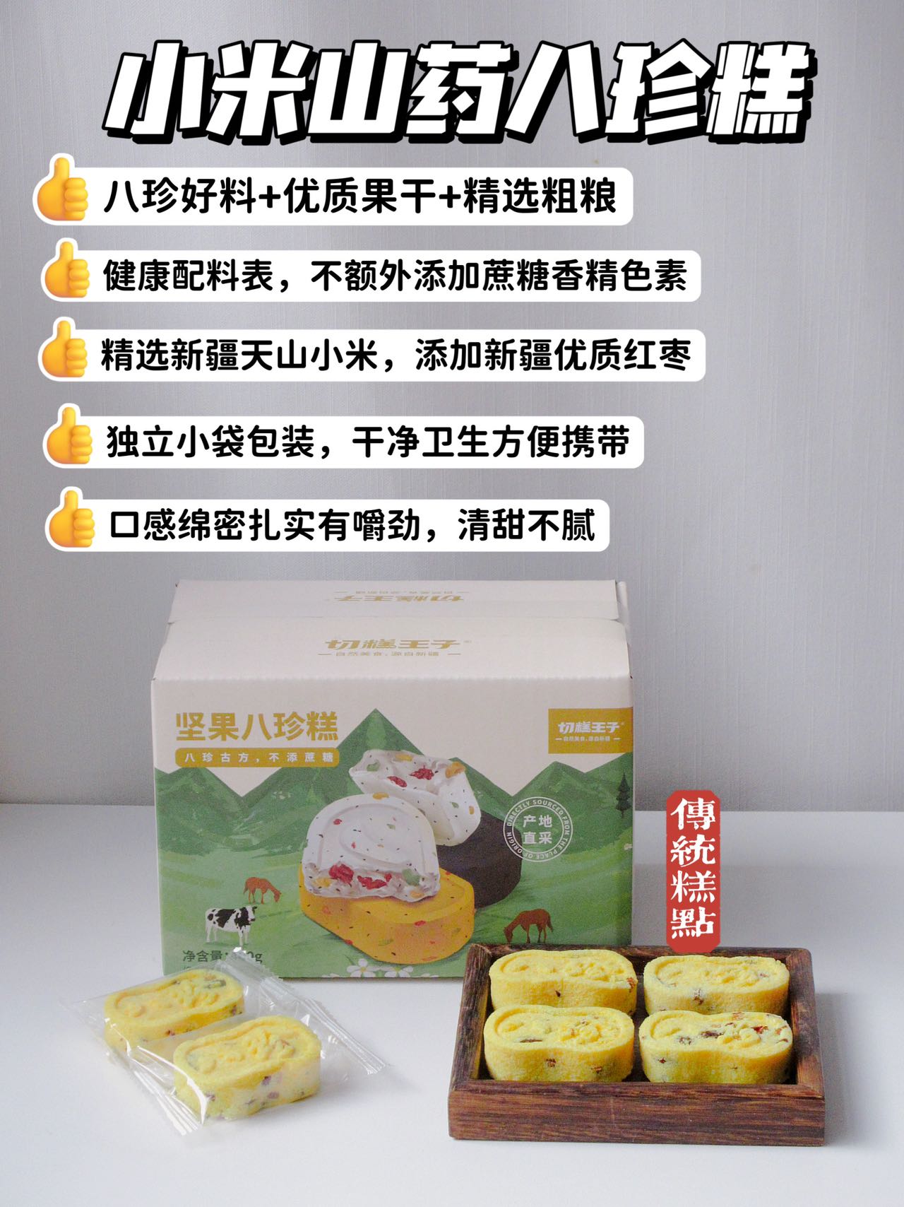 健康粗粮,饱腹感特别强,口感软糯香甜,营养丰富巨好吃😋全家人每天都建议来点💫早餐来不及吃的带上一块放包里,或是办公室零食、追剧小零食、加班充饥、野餐小甜品、甜品台摆盘都很不错哦。无蔗糖添加的八珍糕,食养同源一步到胃,健康轻生活,粗粮高饱腹美味,减轻身体负担~