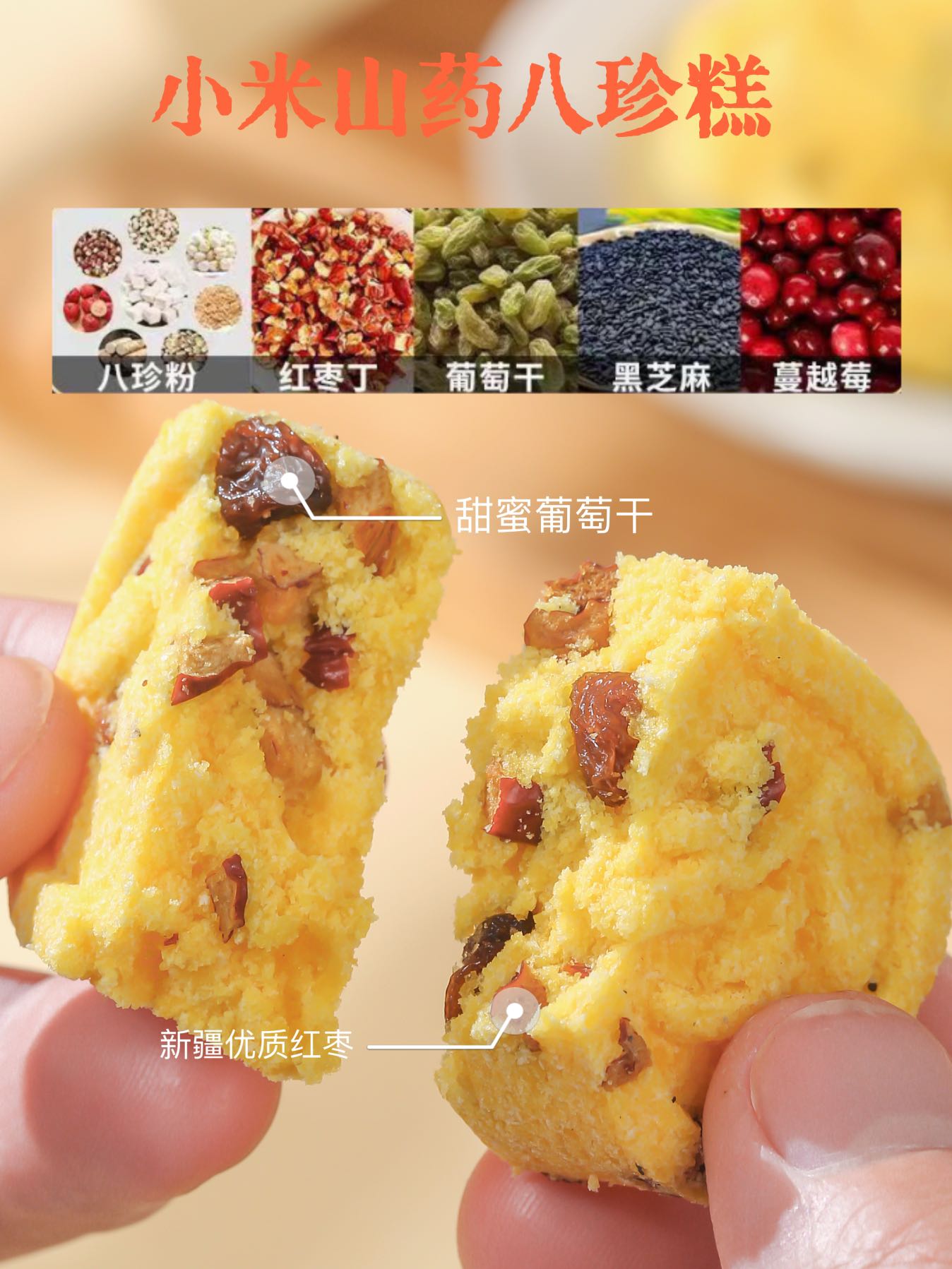 【配料】小米山药八珍糕:糯米粉、茯苓、芡实、小米粉、大米粉、大黄米粉、薏苡仁粉、红枣、葡萄干、黑芝麻、蔓越莓、山药、木糖醇、麦芽糖醇液