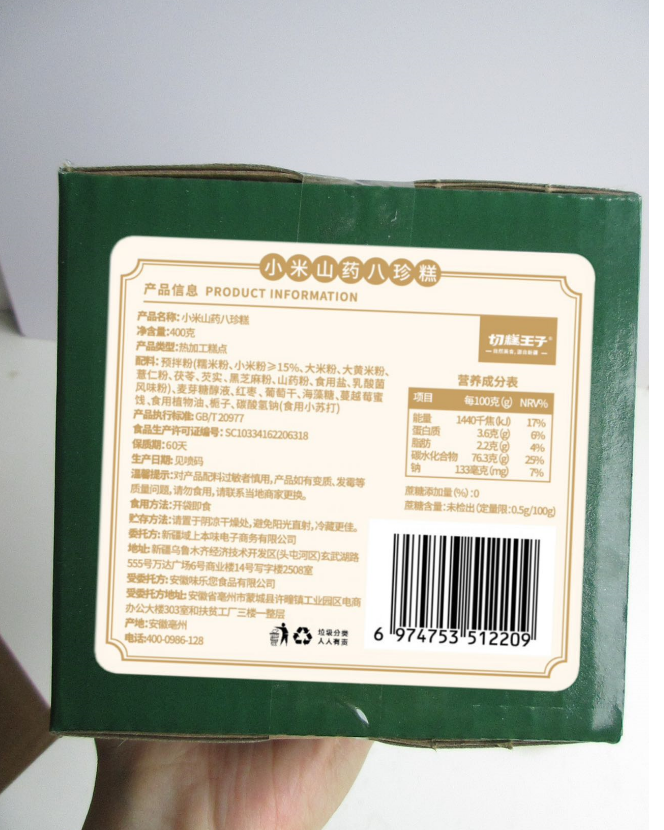 红枣山药八珍糕:糯米粉、茯苓、芡实、大米粉、莲子、薏苡仁粉、红枣、黑芝麻、山楂、山药、白扁豆、麦芽、葵花籽仁、南瓜籽仁、葡萄干、蔓越莓、陈皮、腰果仁、木糖醇、麦芽糖醇液