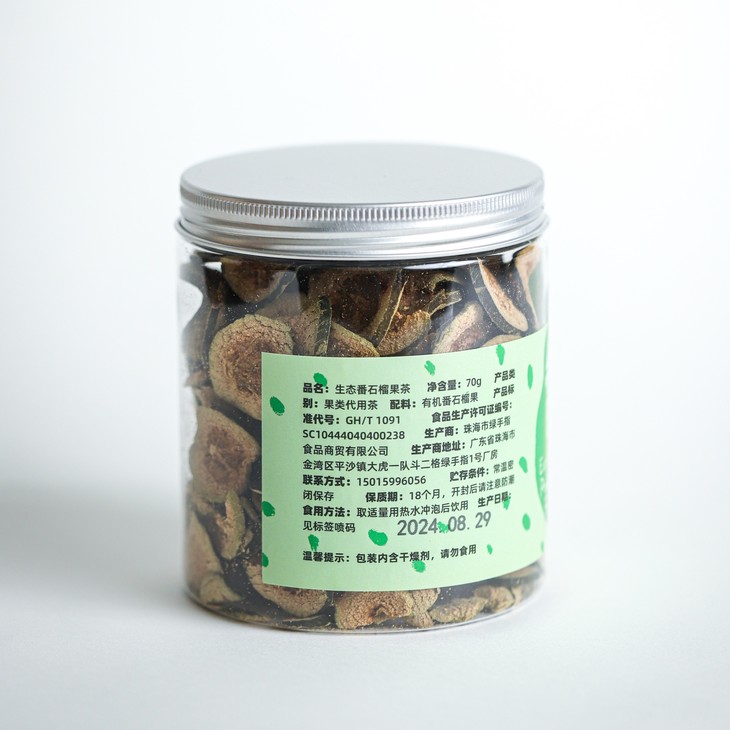 绿家在2022年的时候就建了属于自己的加工厂,加工出来的食材品质可以由自己把关,番石榴幼果经过人工挑拣、清洗、切片、烘干,制作成番石榴果茶,加工过程不添加其它的东西。