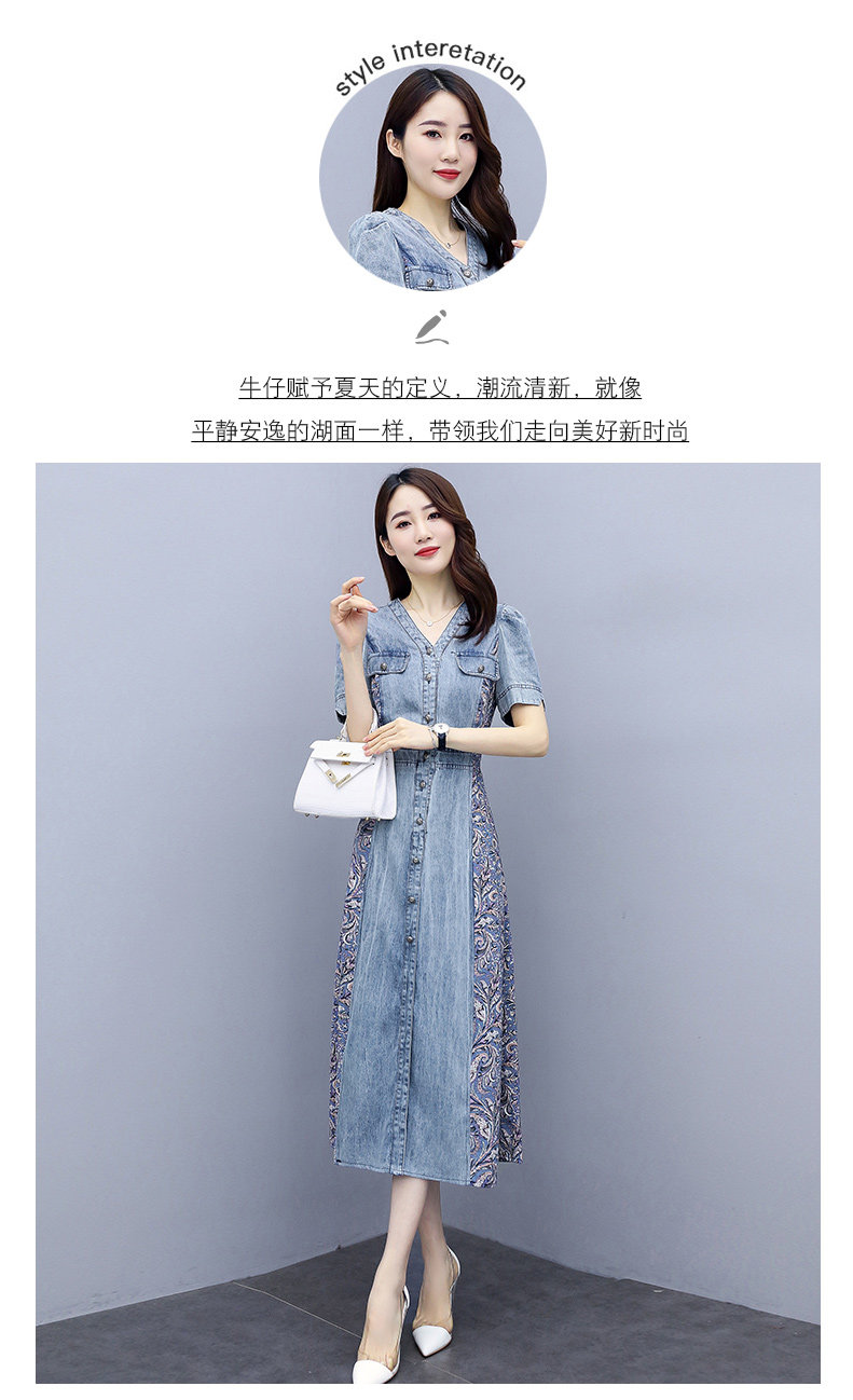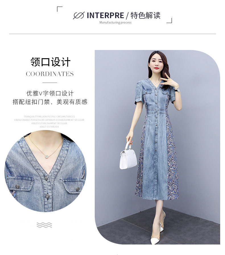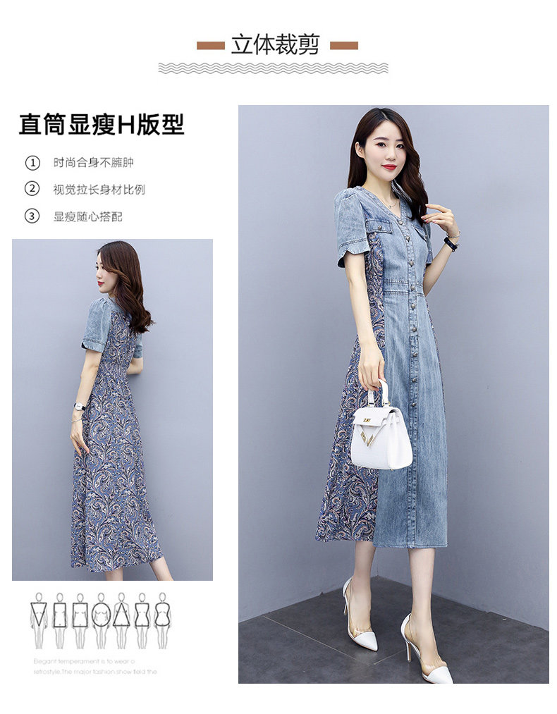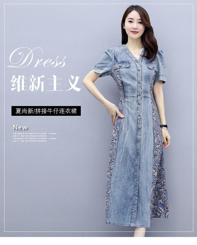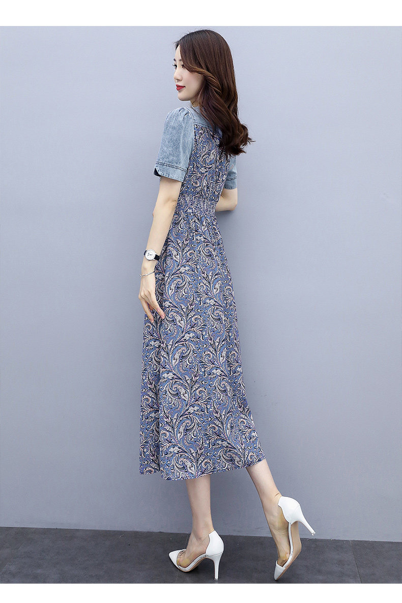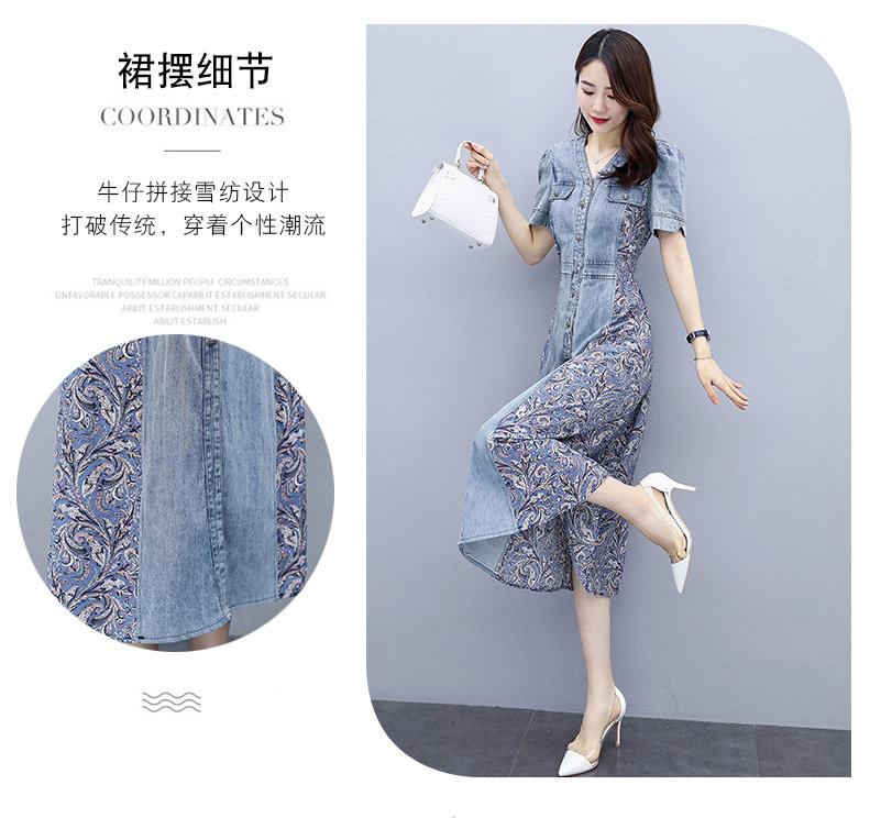 WZNH-SUN2057新款雪纺拼接碎花牛仔长款薄V领风衣印花长裙