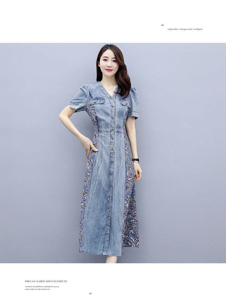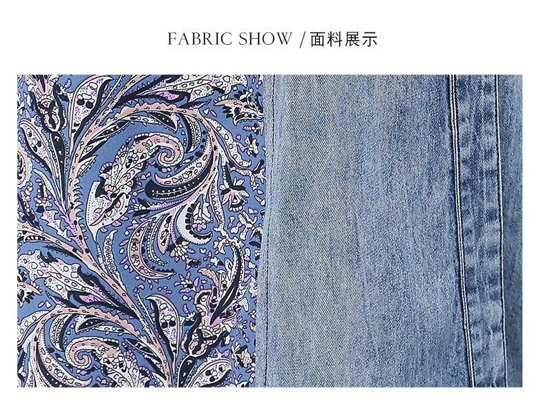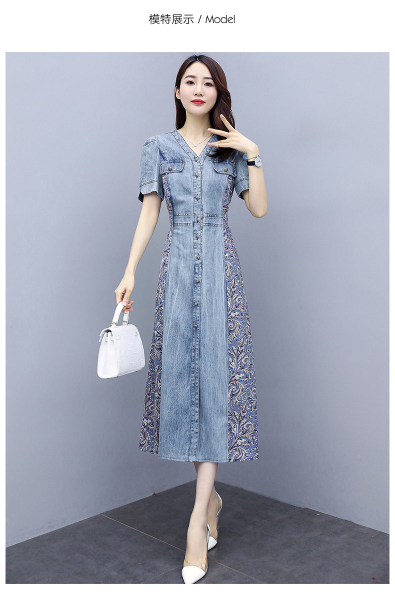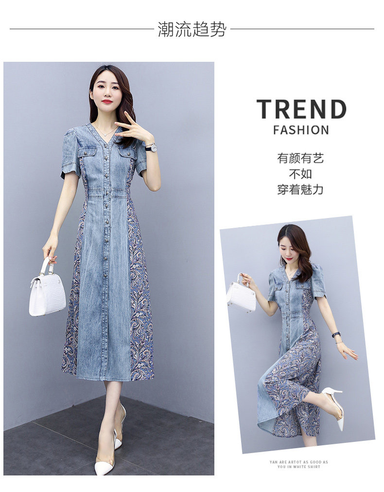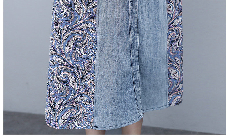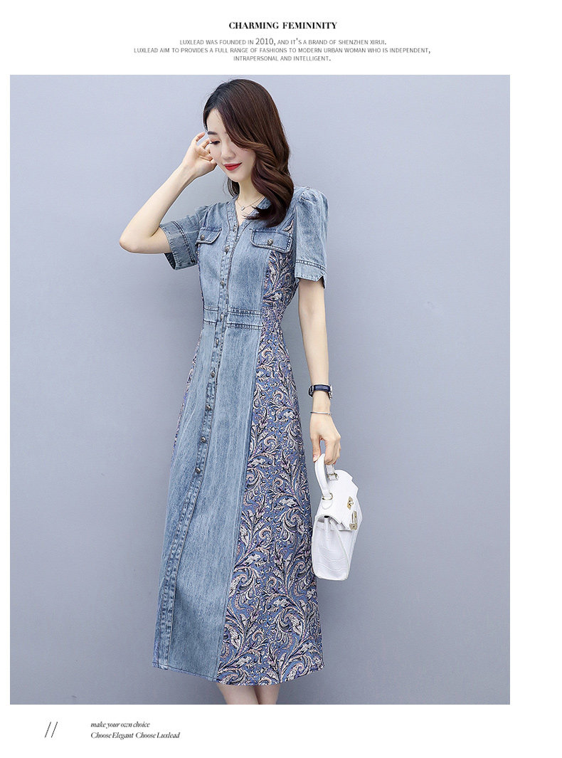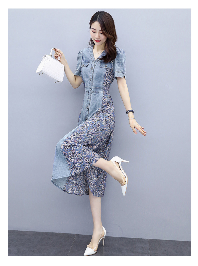WZNH-SUN2057新款雪纺拼接碎花牛仔长款薄V领风衣印花长裙
