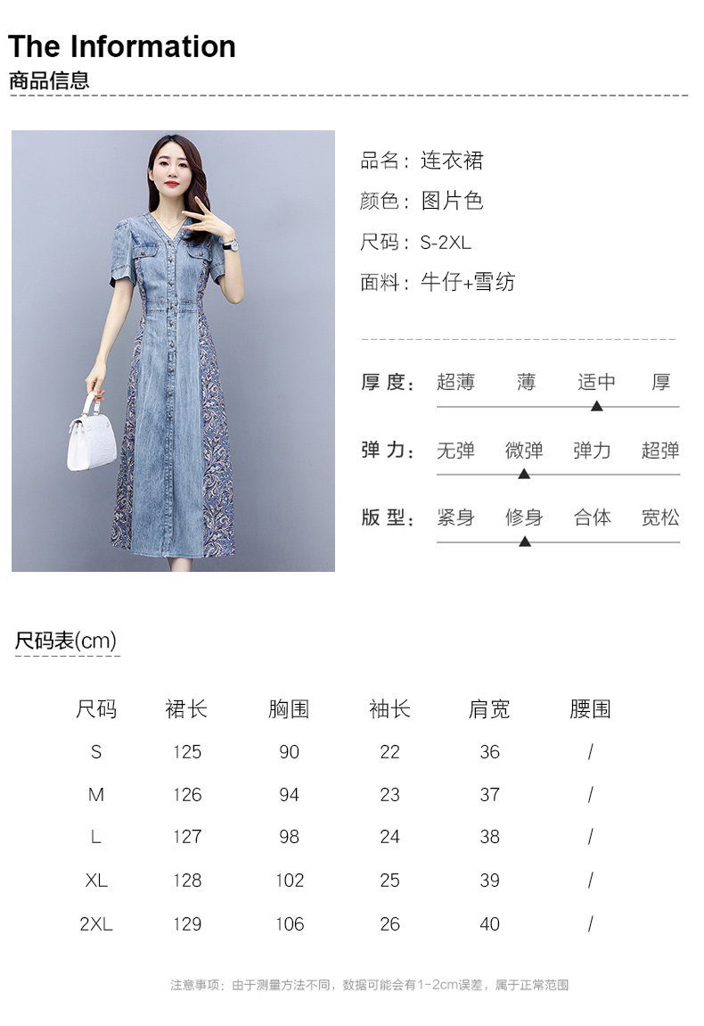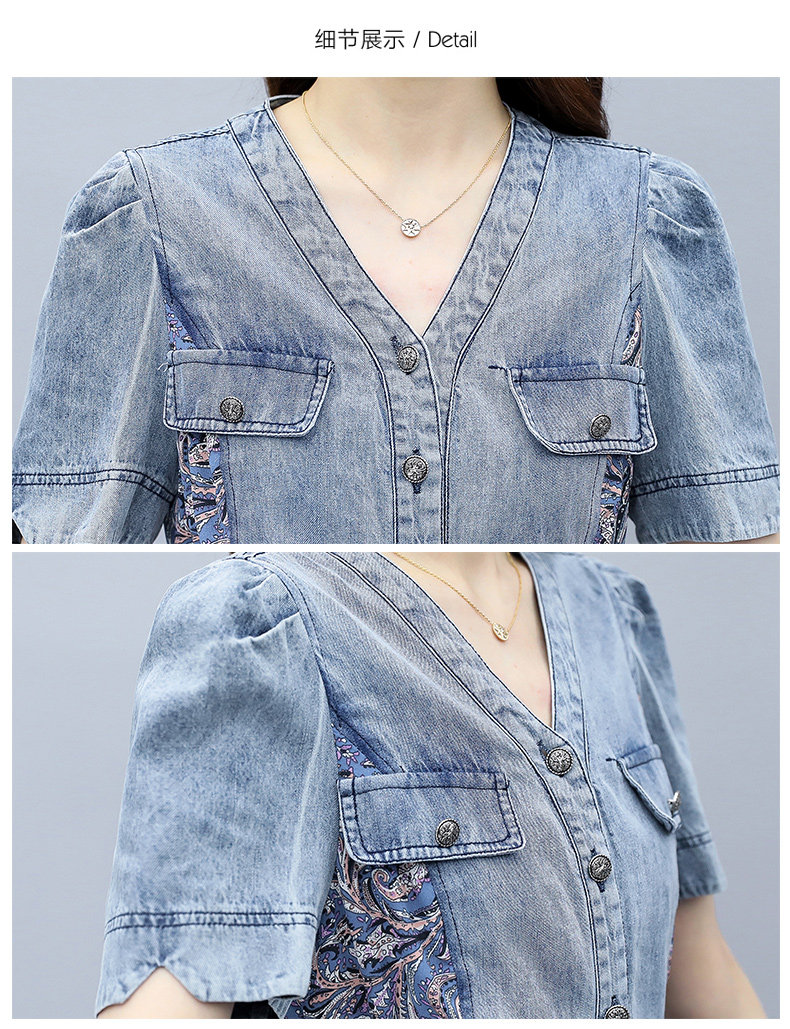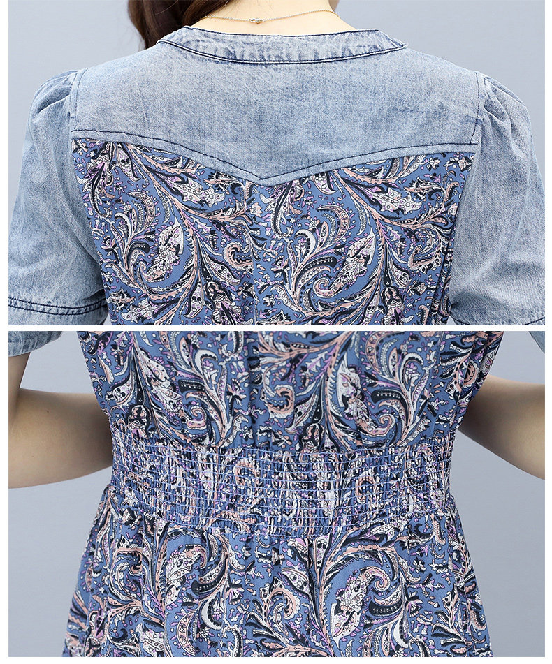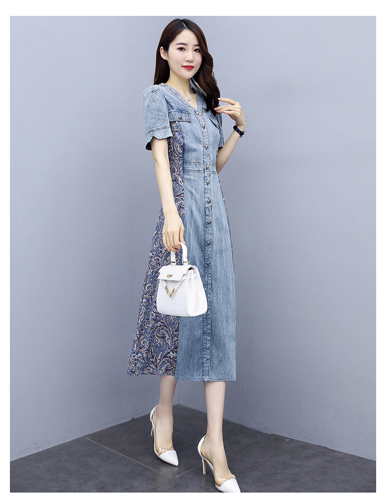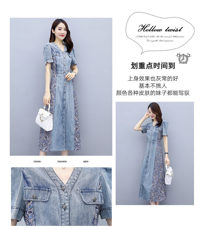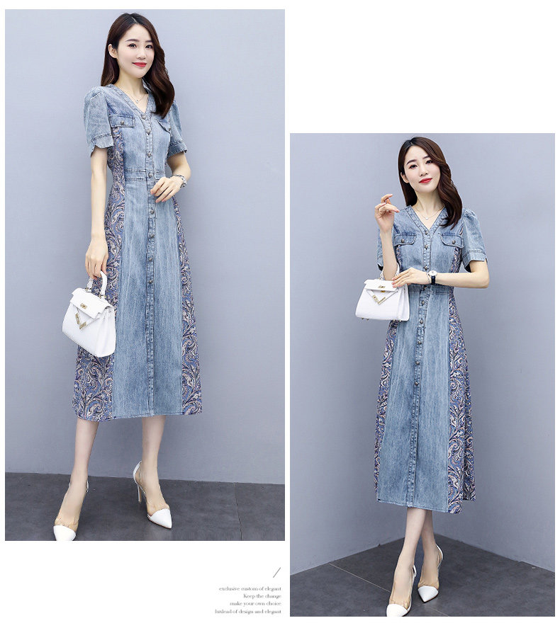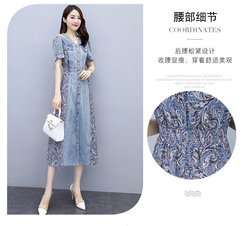 WZNH-SUN2057新款雪纺拼接碎花牛仔长款薄V领风衣印花长裙
