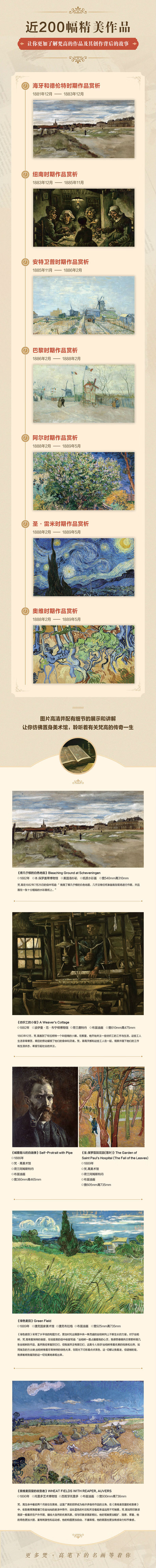 1.收录近200幅精美作品,了解梵高梵·高一生中的画作及创作背后的故事;2.图片高清并配有细节展示和讲解,让你仿佛置身美术馆,聆听有关梵高的传奇一生