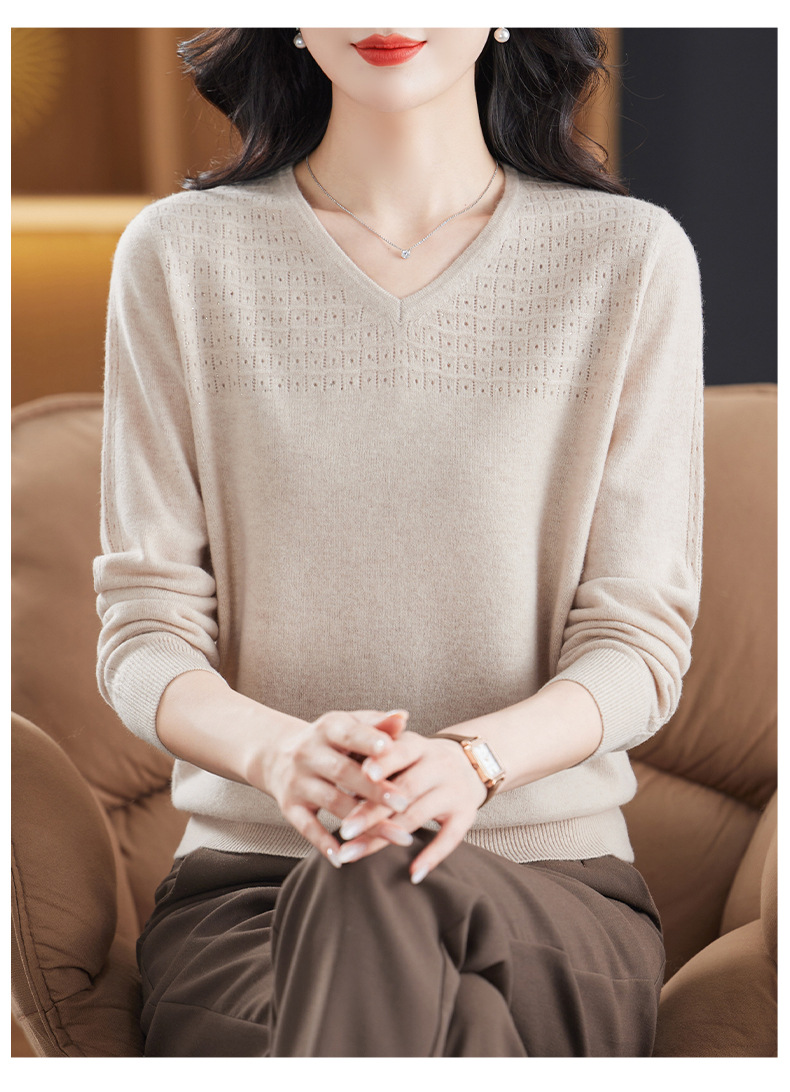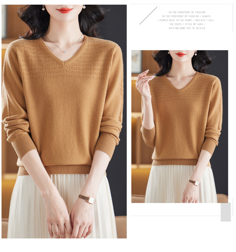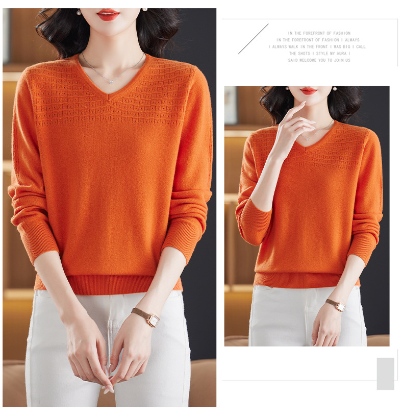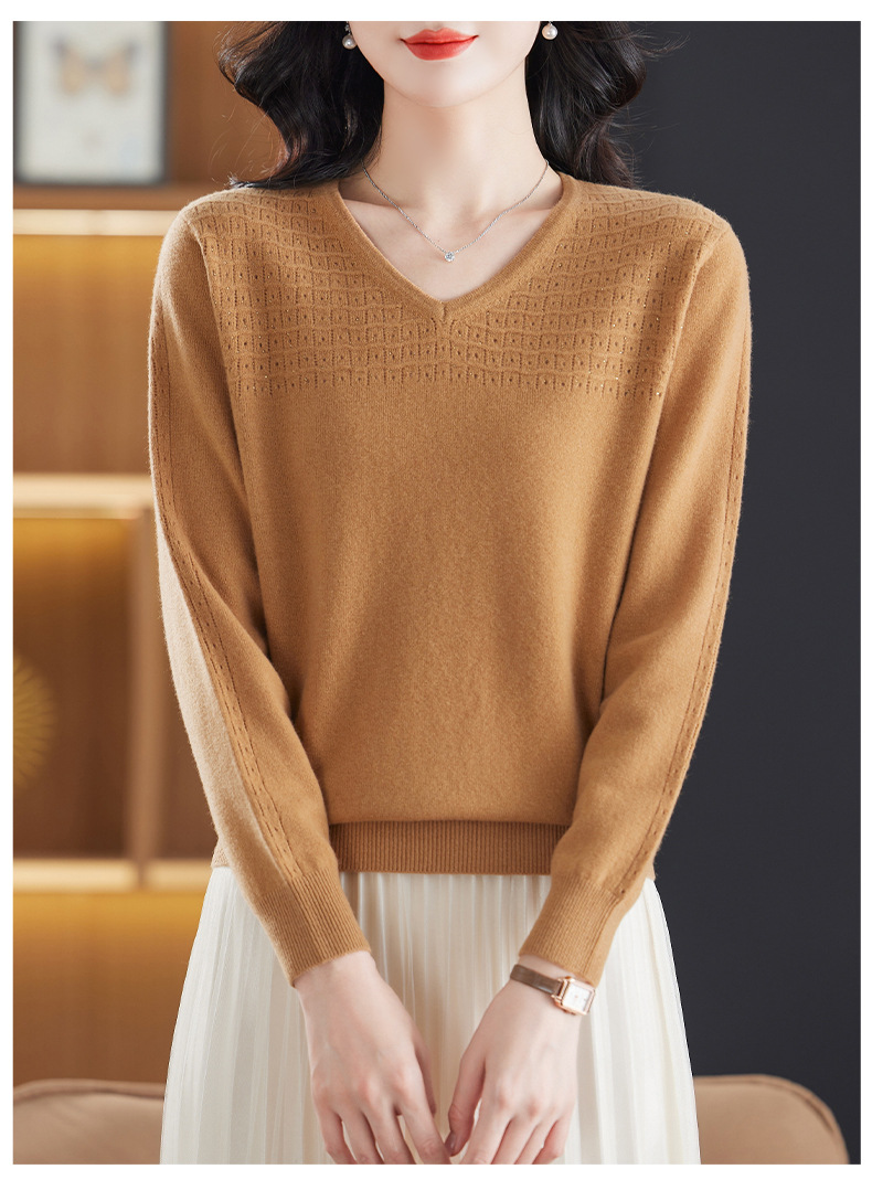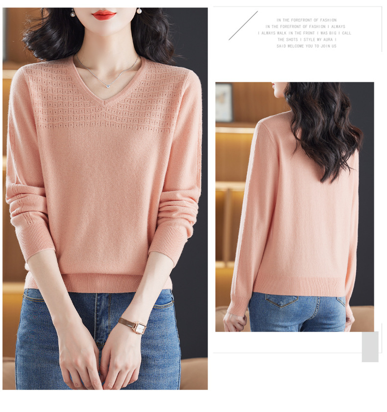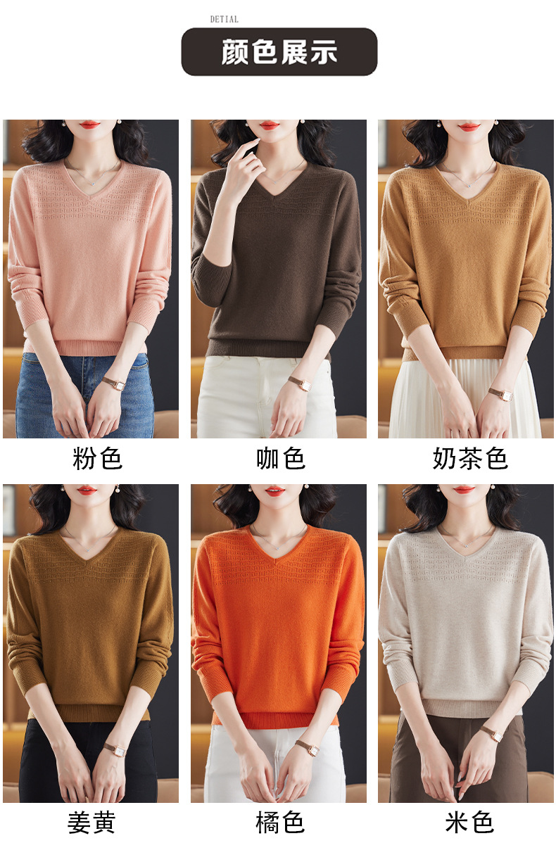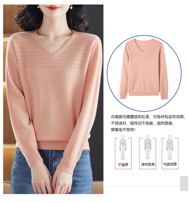 CC-13-6911时尚纯羊毛衫女秋季V领镂空软糯针织打底衫圆领宽松毛衣女