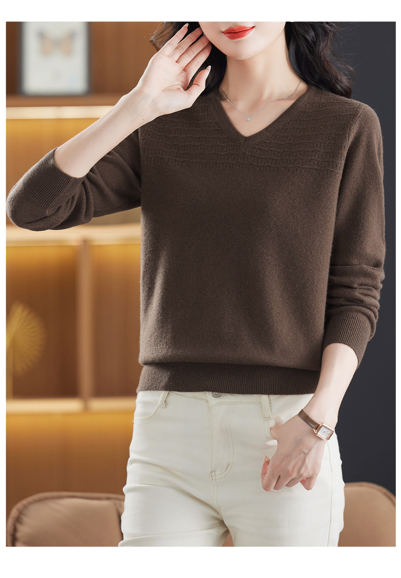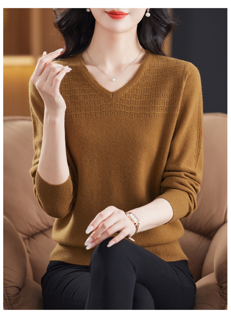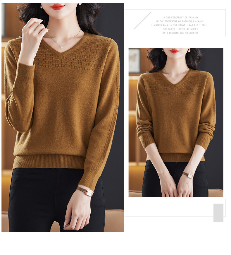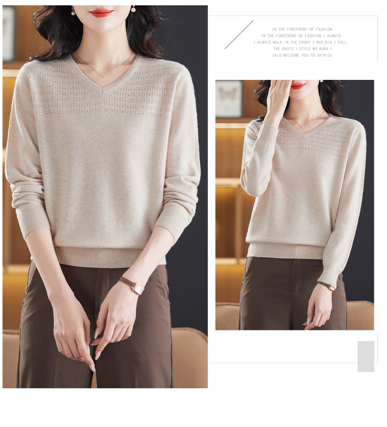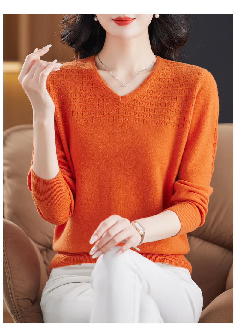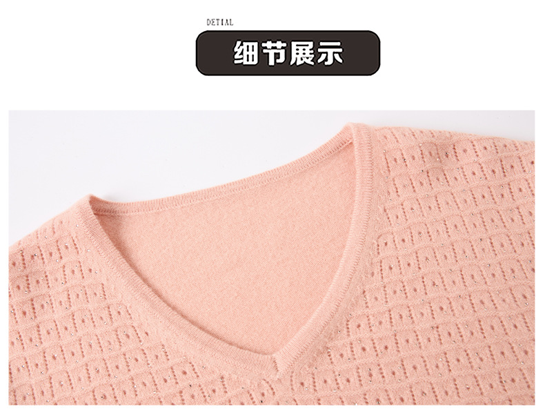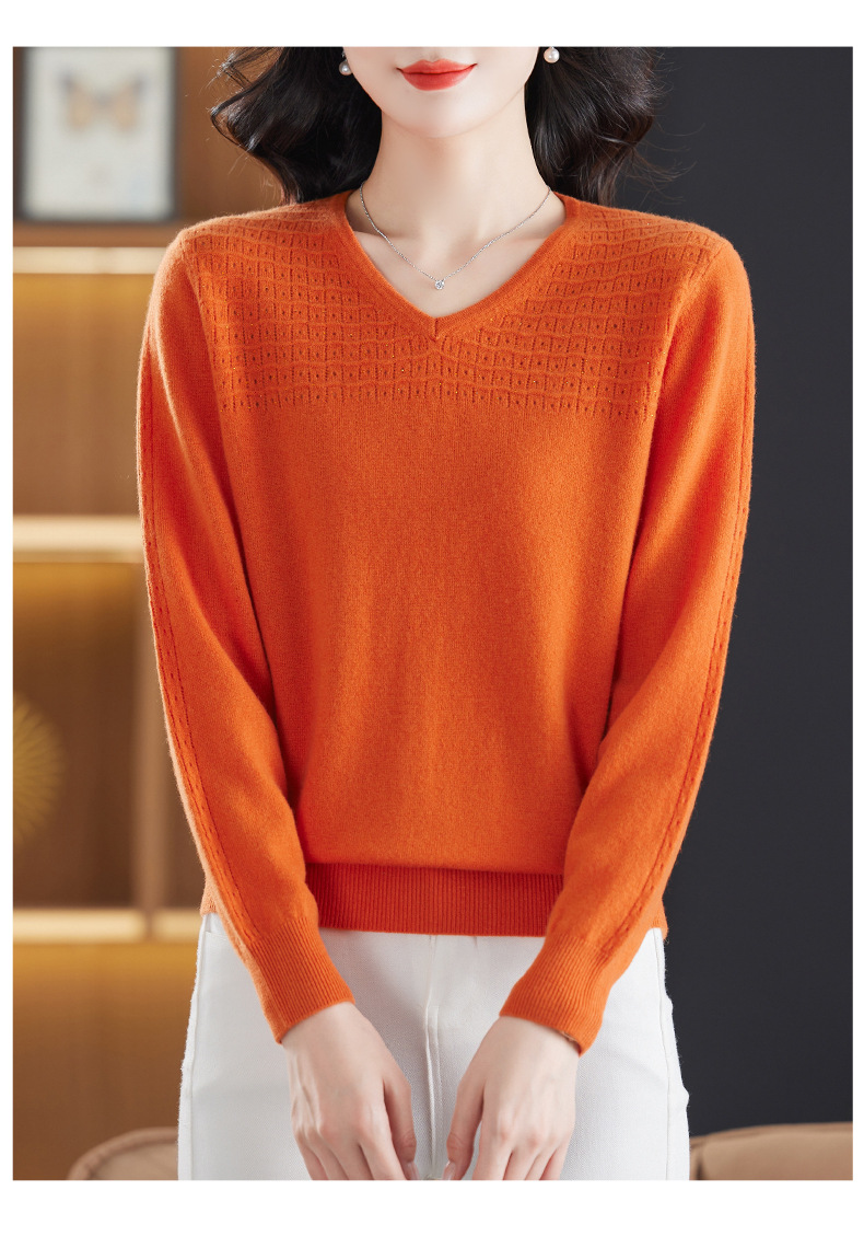 CC-13-6911时尚纯羊毛衫女秋季V领镂空软糯针织打底衫圆领宽松毛衣女