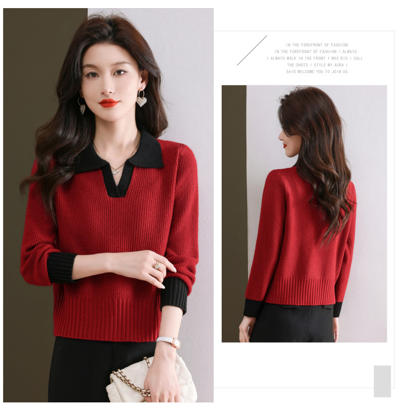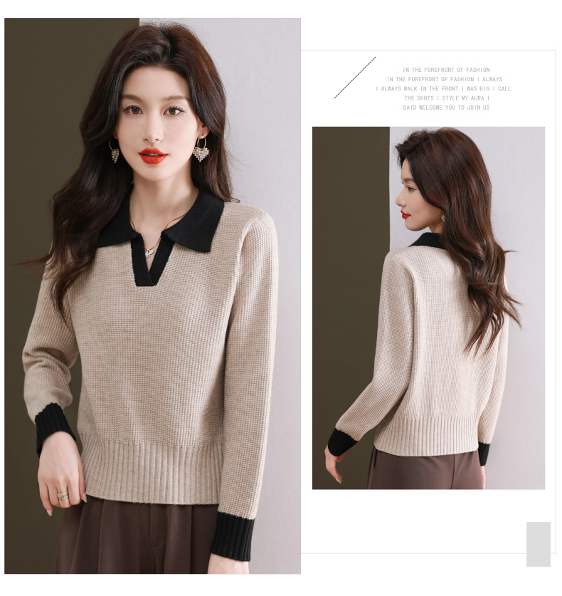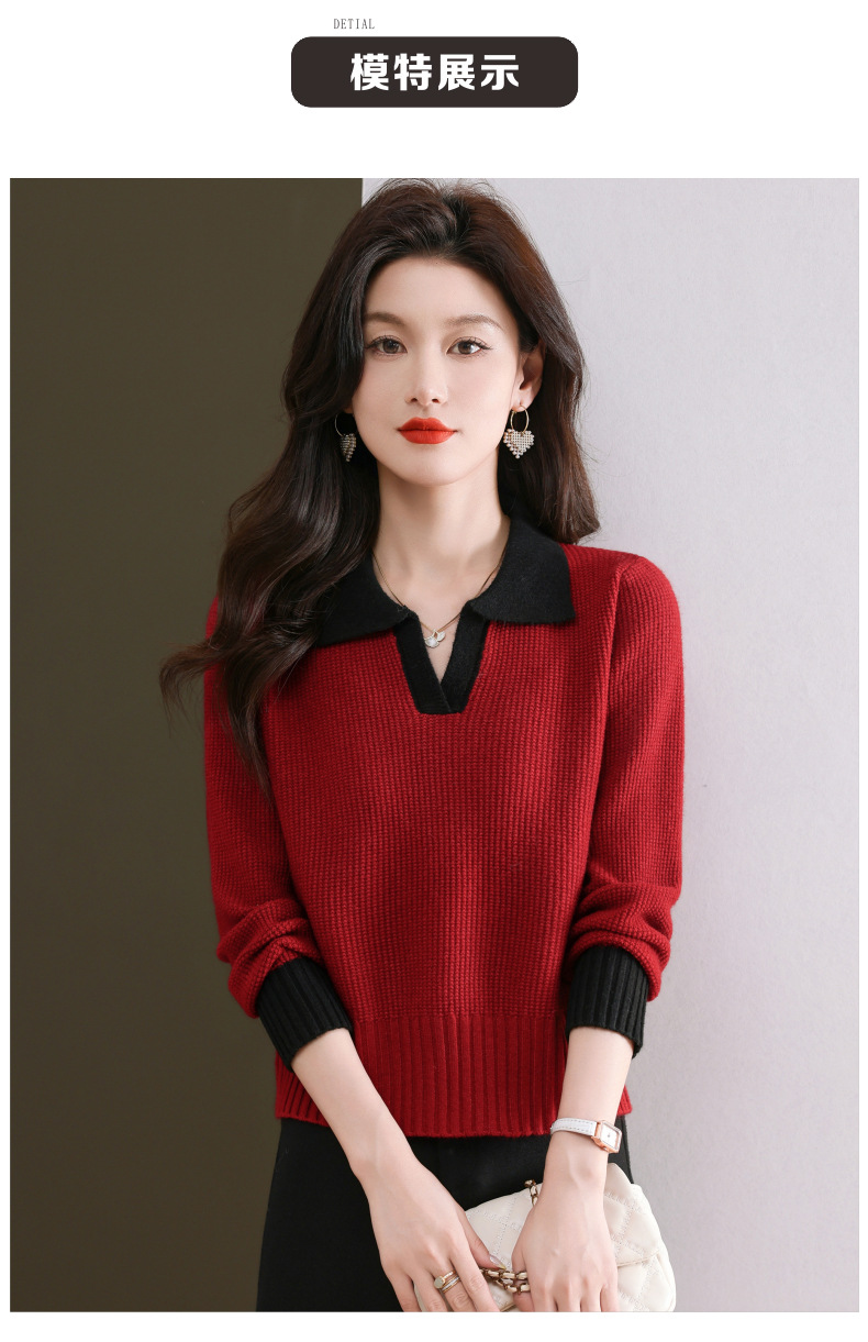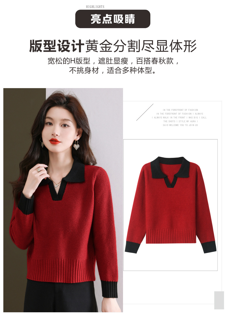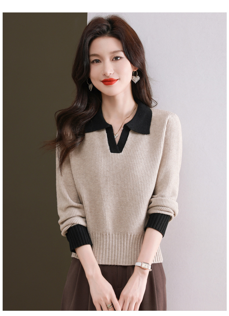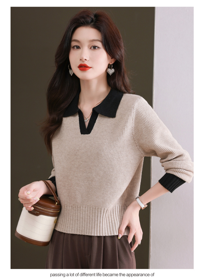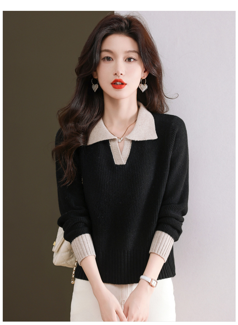 CC-103-6126春秋新款撞色polo领长袖针织衫女宽松显瘦翻领打底衫内搭上衣