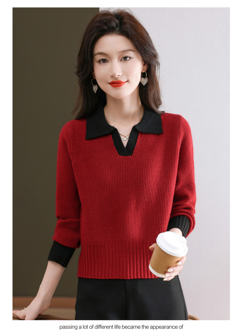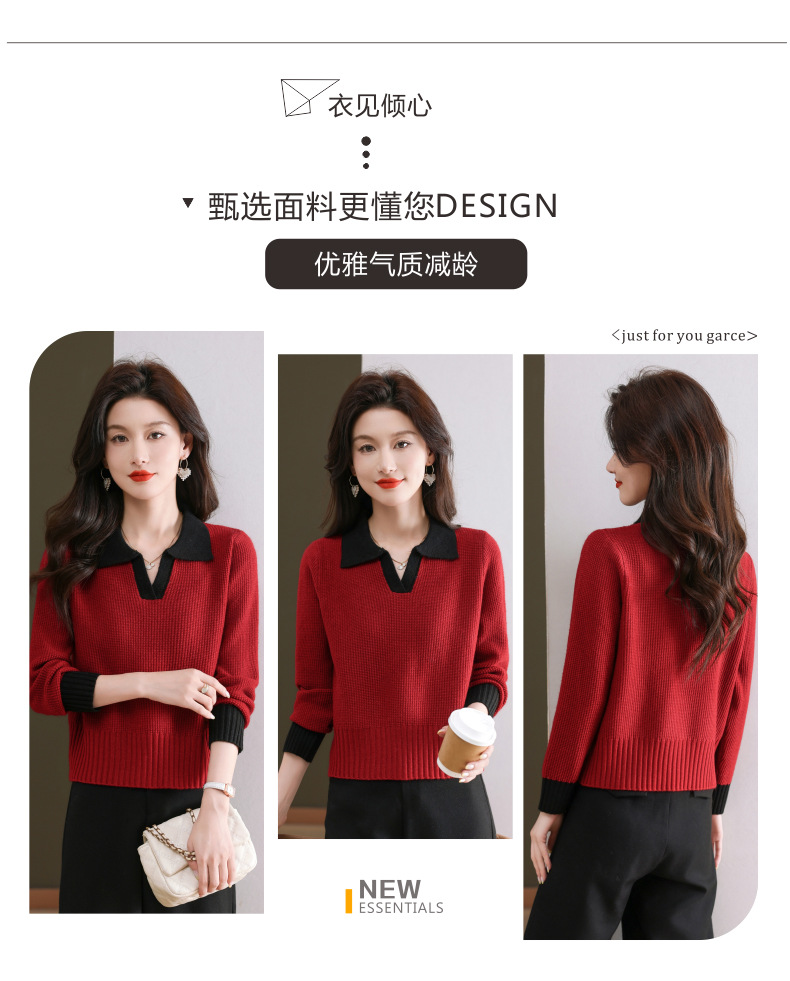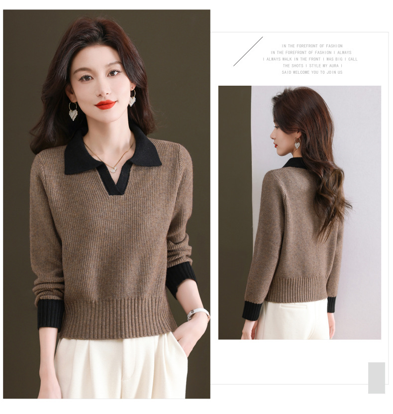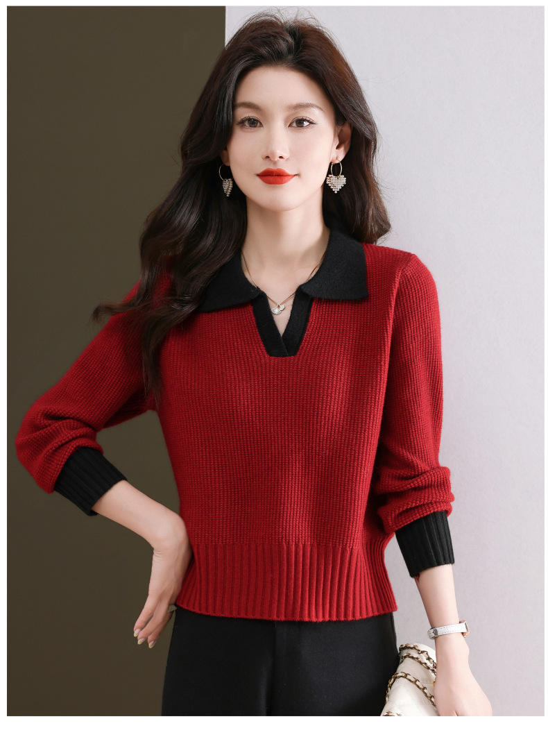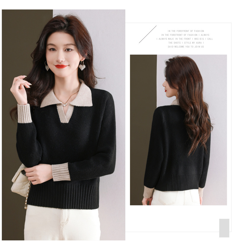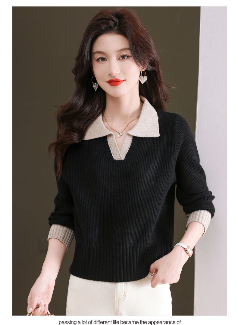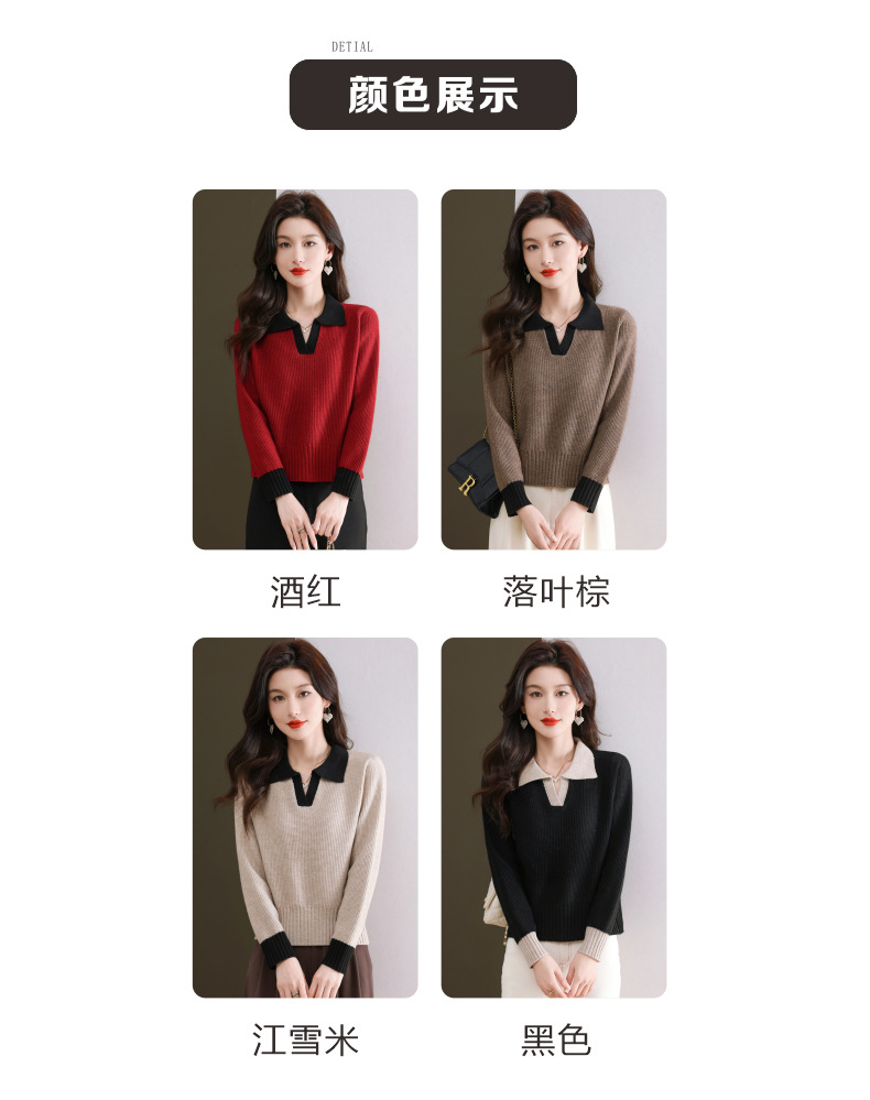 CC-103-6126春秋新款撞色polo领长袖针织衫女宽松显瘦翻领打底衫内搭上衣