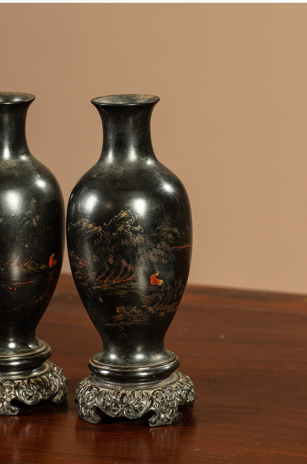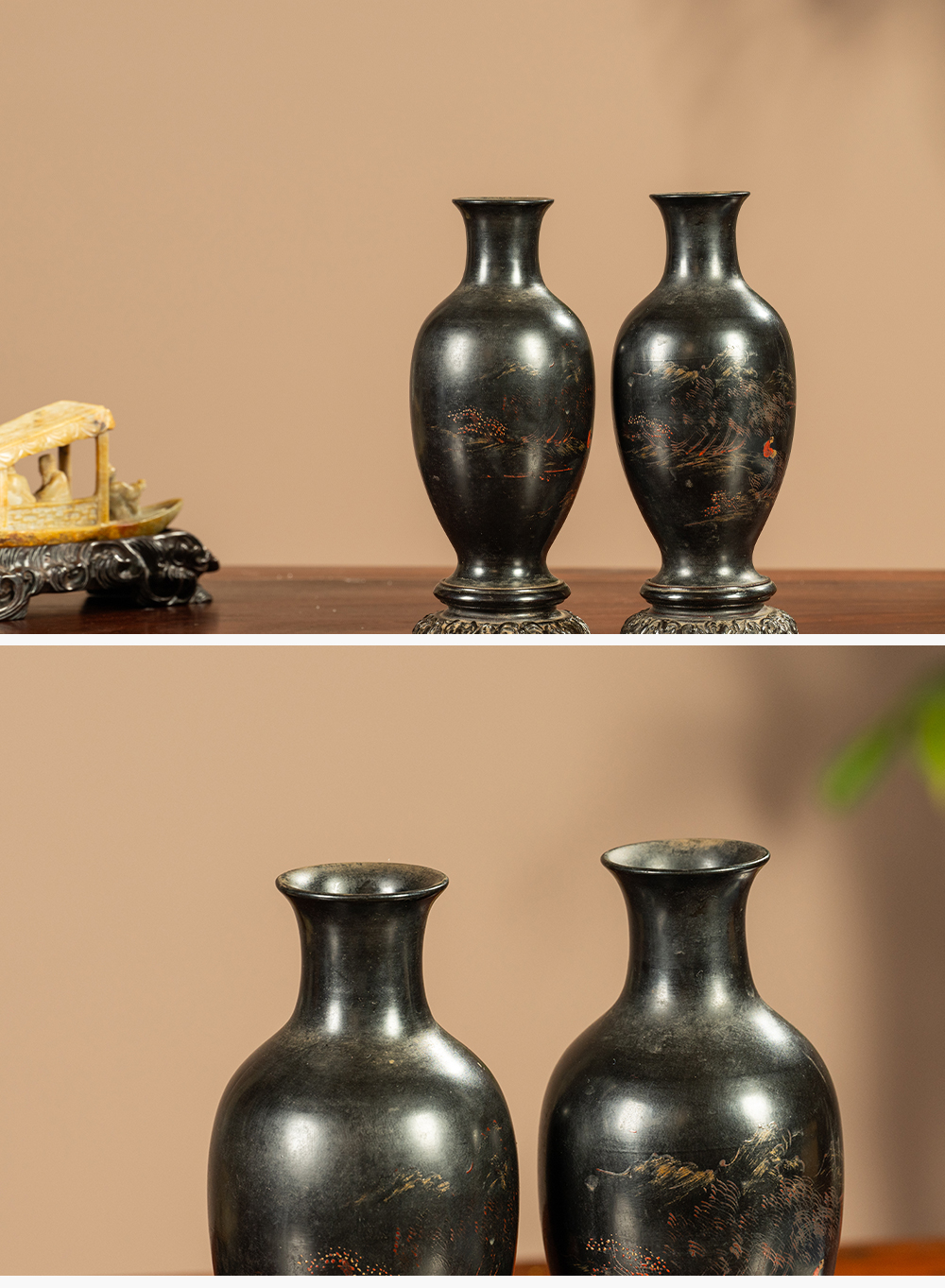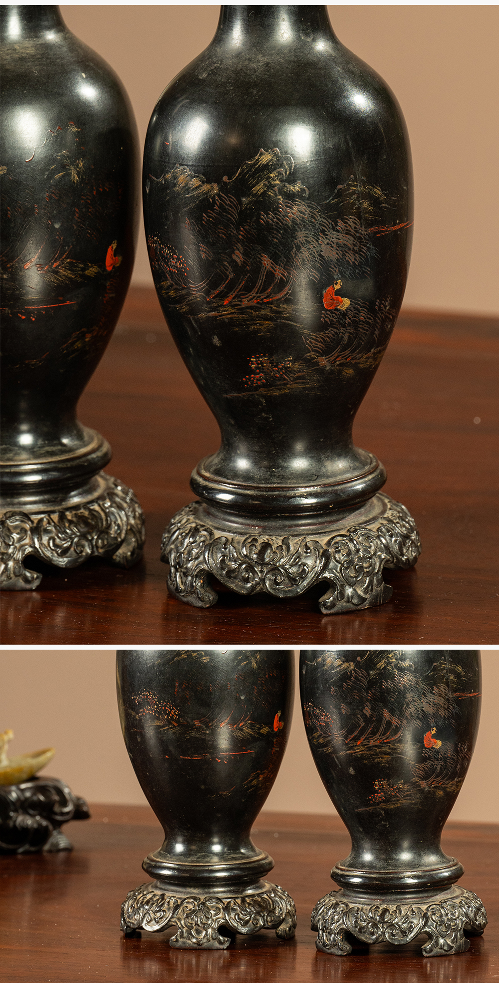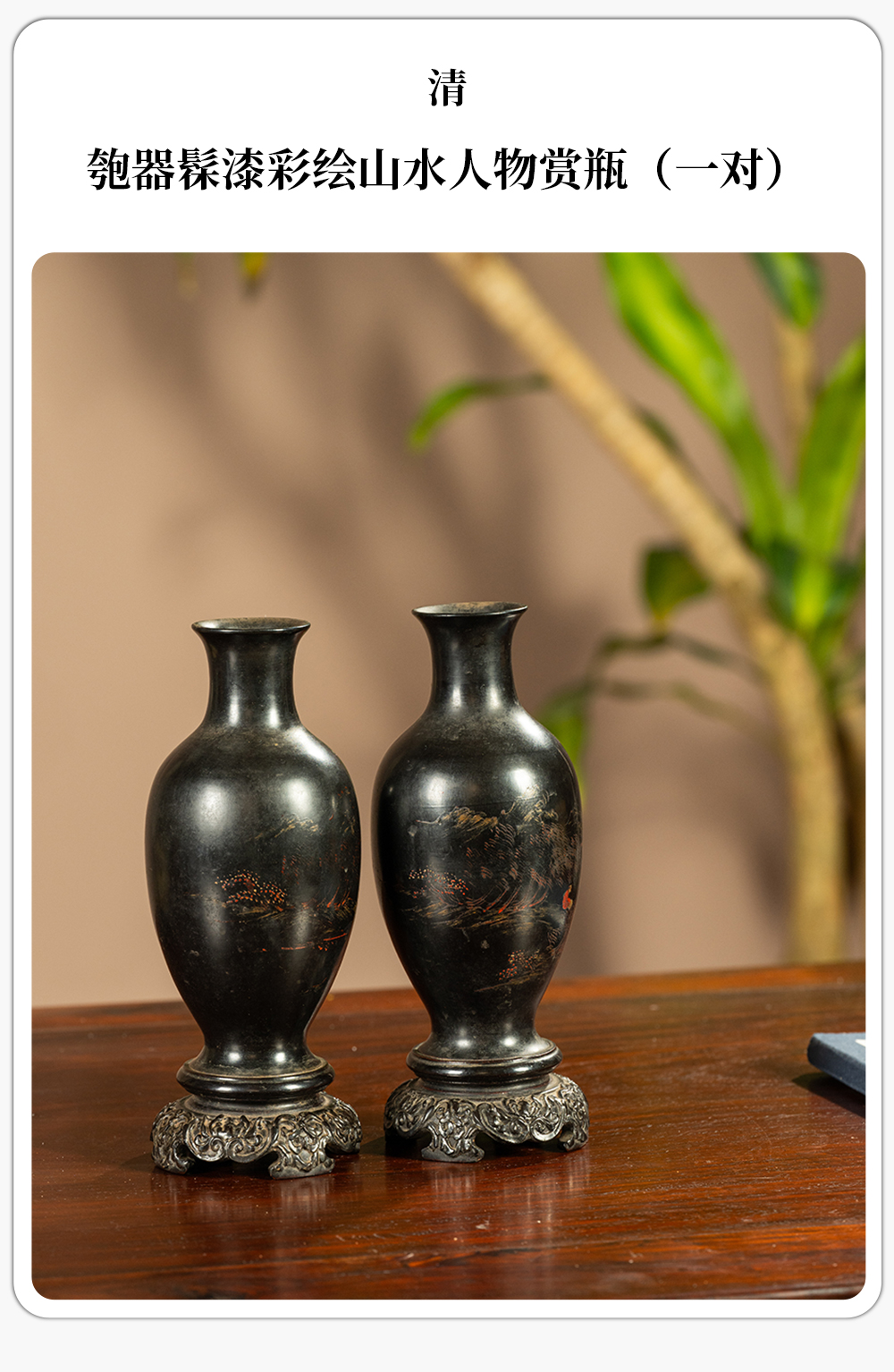 清 匏器髹漆彩绘山水人物赏瓶(一对)