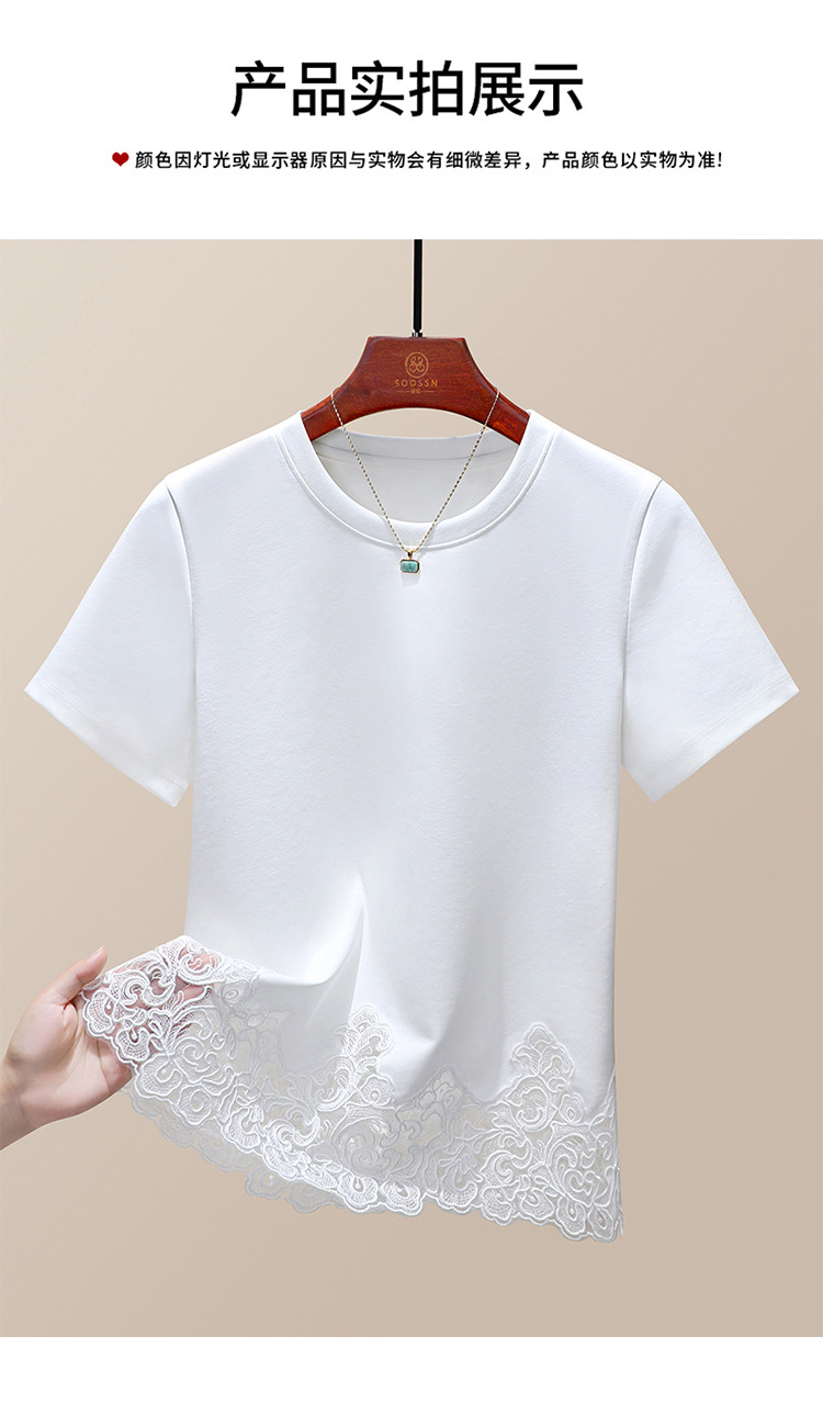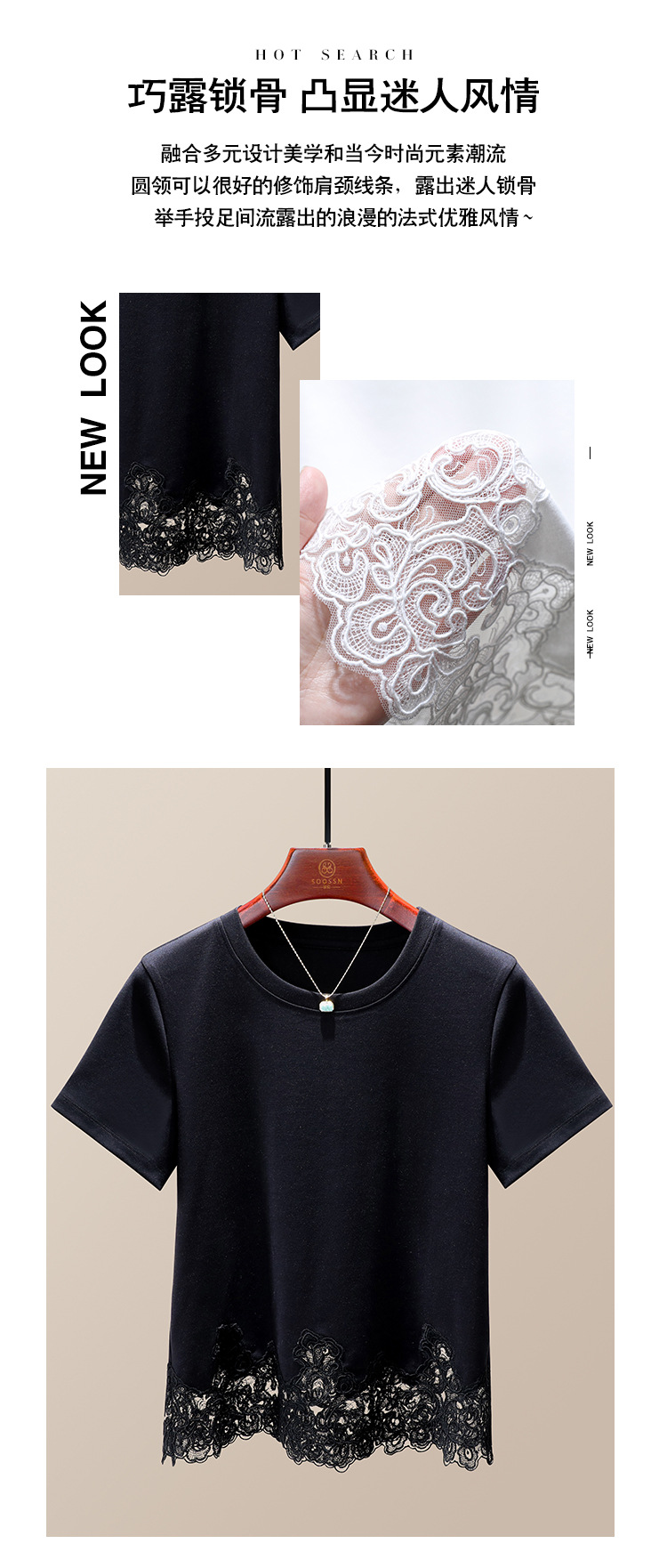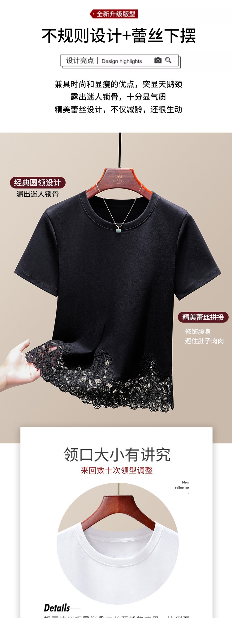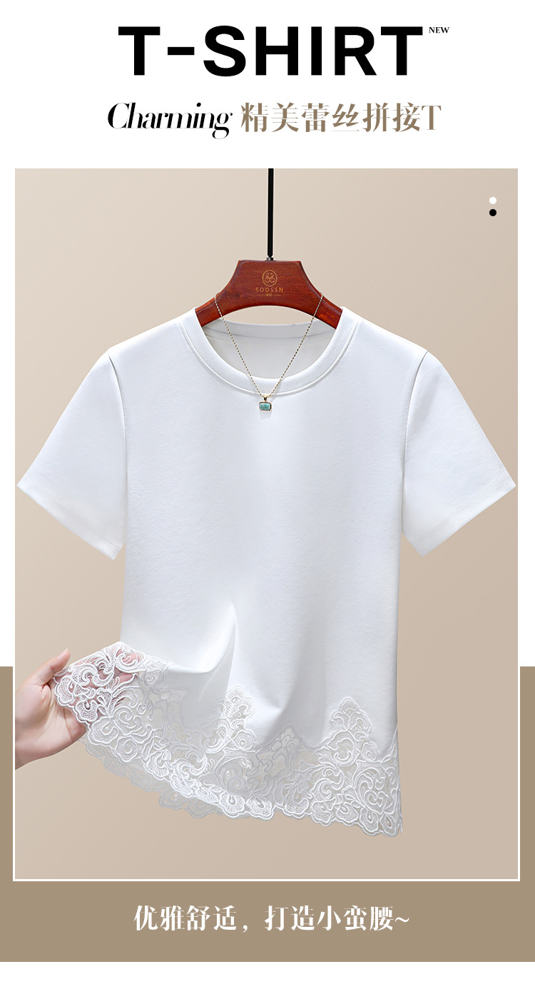 「自j」全新升级【铂金会员109/天猫149/差价40】(05924)洛诗琳新款气质蕾丝拼接T恤2025夏季百搭证件显瘦圆领上衣女