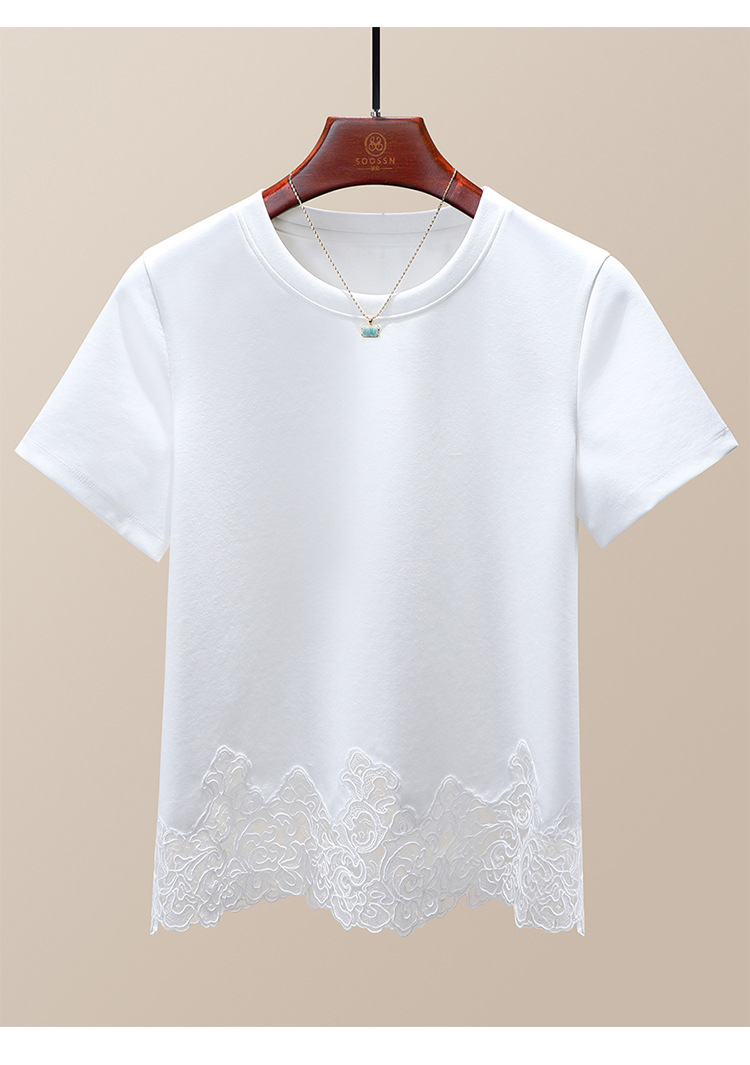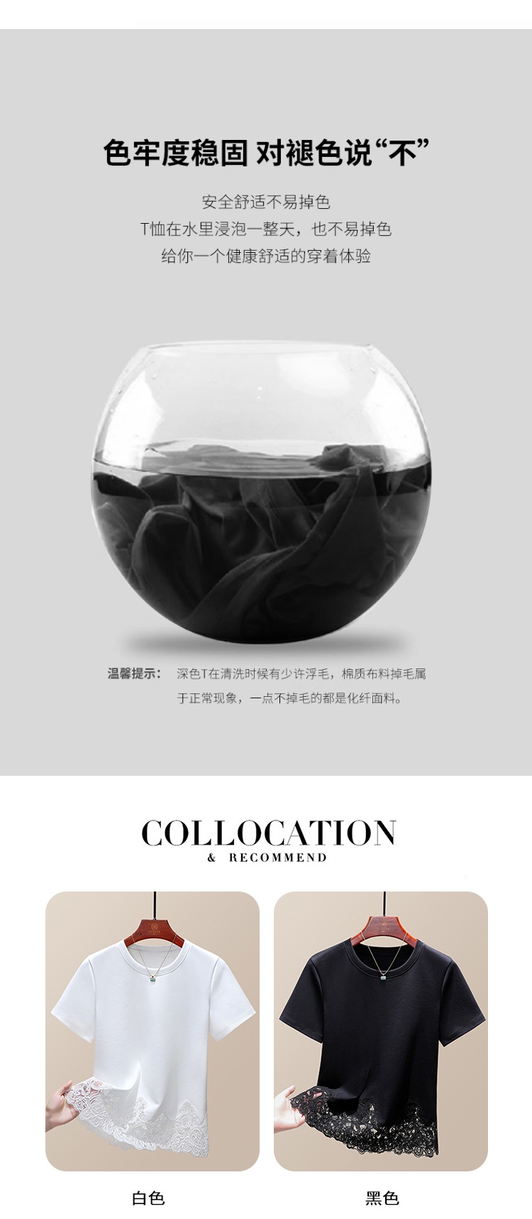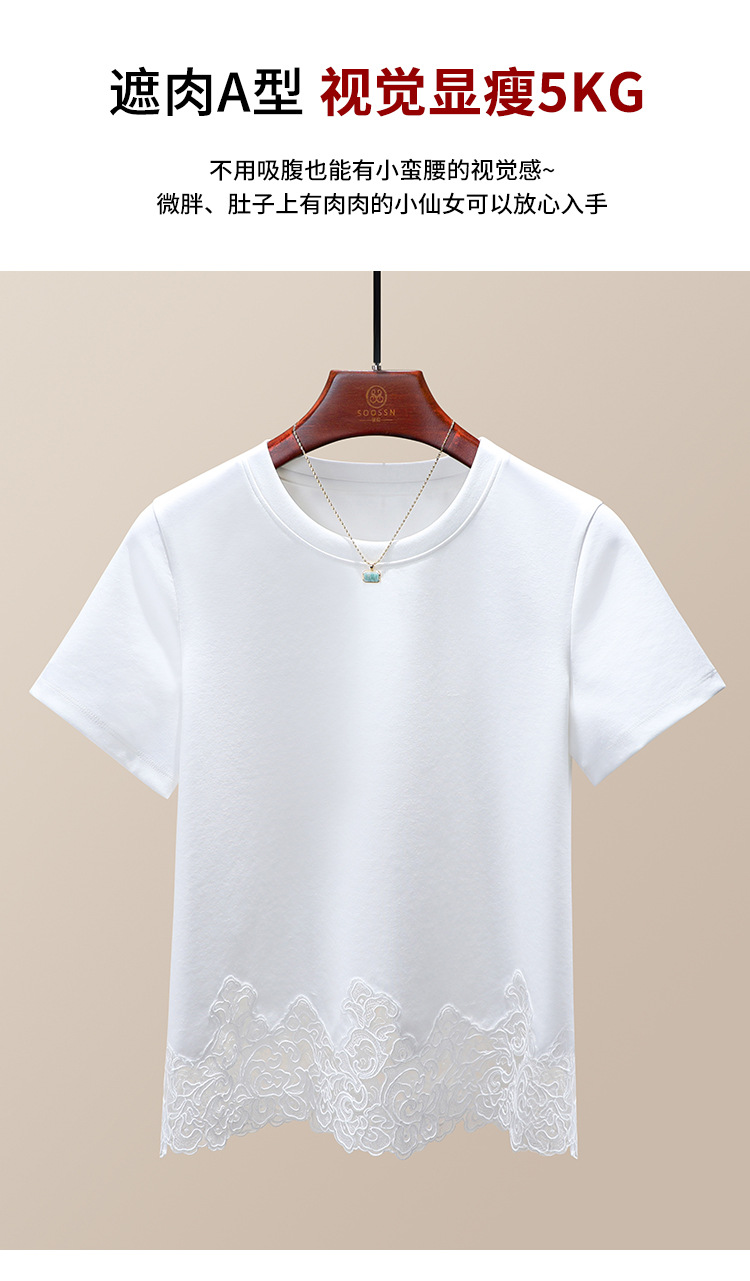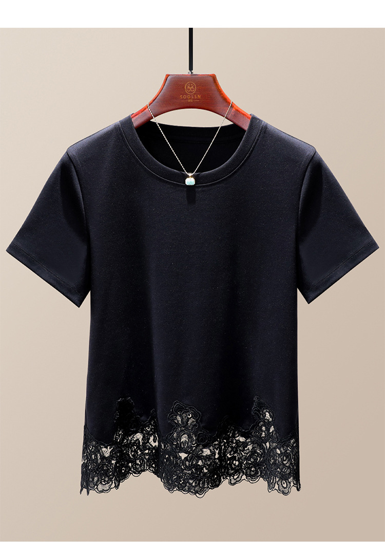 「自j」全新升级【铂金会员109/天猫149/差价40】(05924)洛诗琳新款气质蕾丝拼接T恤2025夏季百搭证件显瘦圆领上衣女