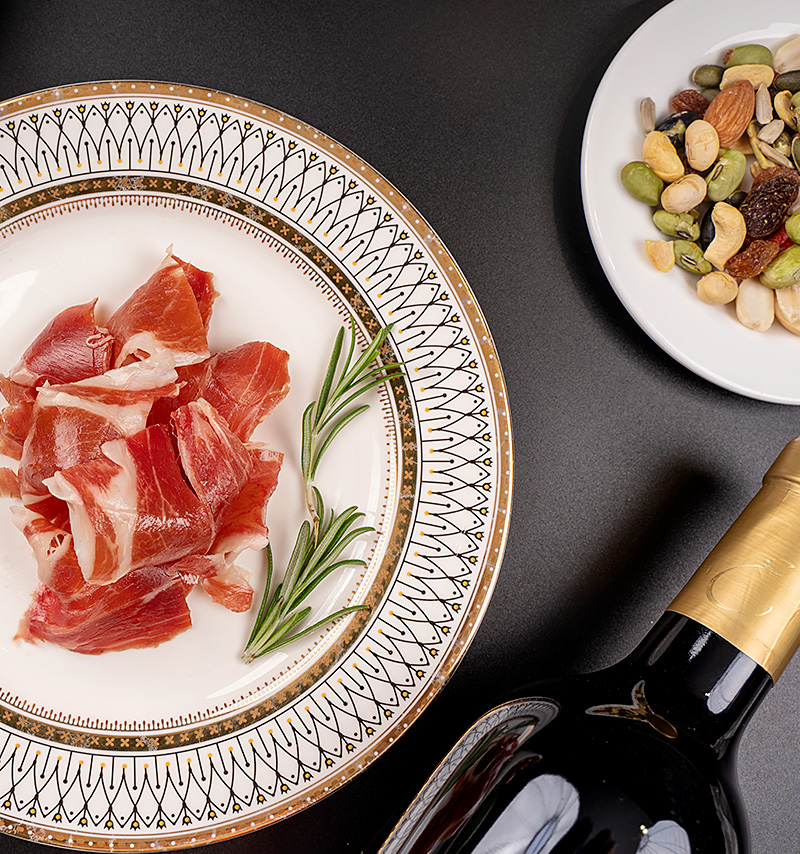 火腿配合偏果香味的红酒,或者起泡酒,佐以芝士碟和各式tapas,美味不可挡