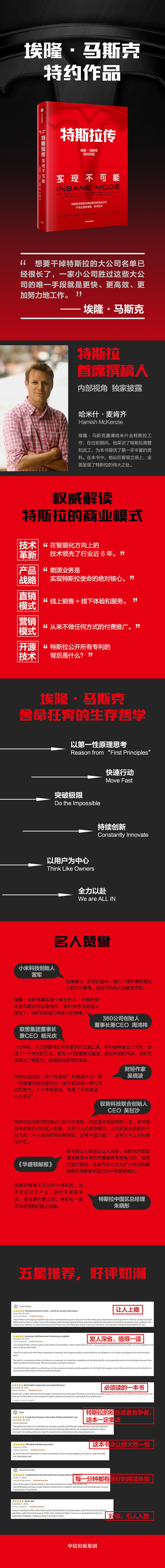 本书以引人入胜的文字讲述了埃隆·马斯克凭借天分和韧性克服重重艰巨挑战并变革汽车行业的经过。哈米什·麦肯齐具备的独特优势使他能够将特斯拉以及加州和中国等地一批追随特斯拉的公司而有说服力地呈现给读者。不管你是还是普通人,都应该读读这本书。