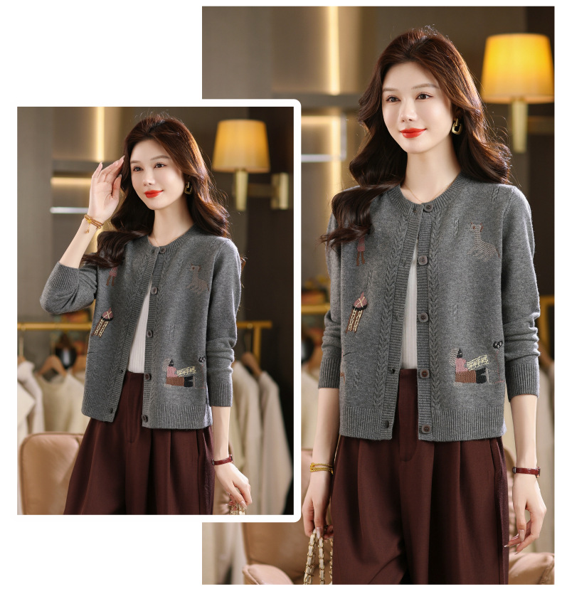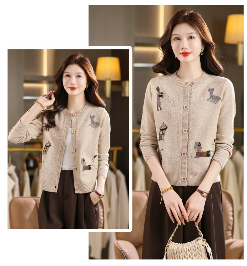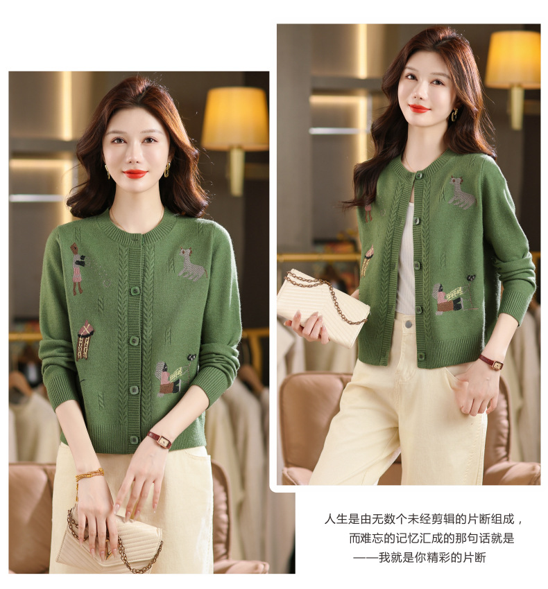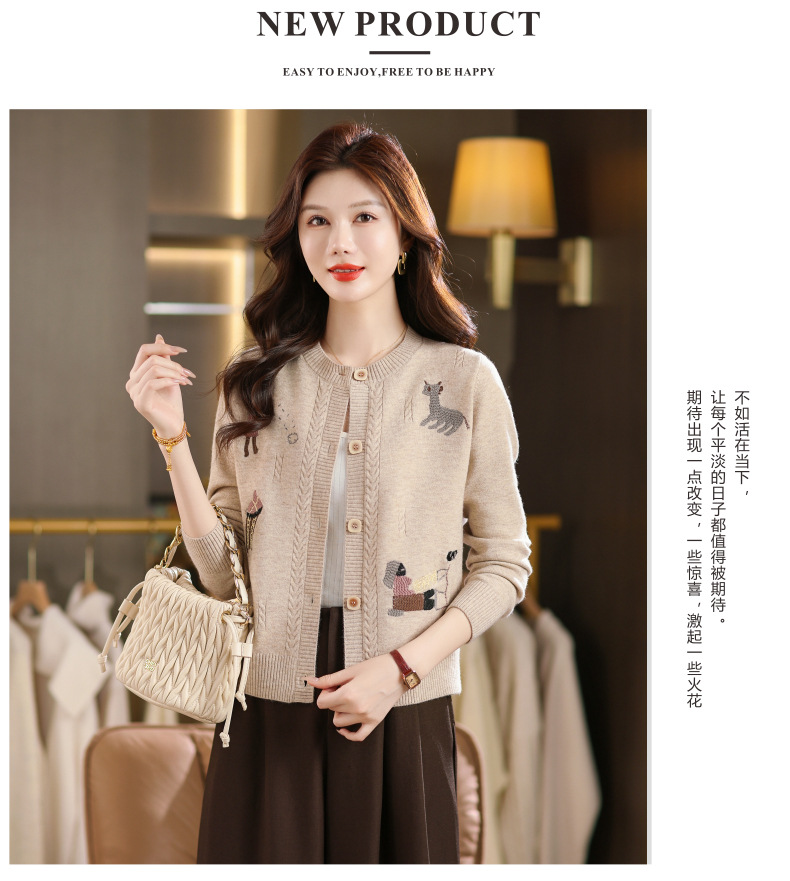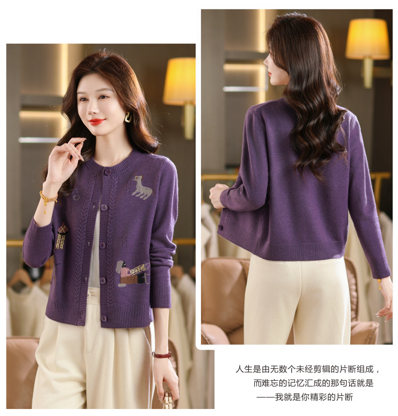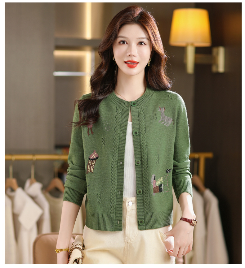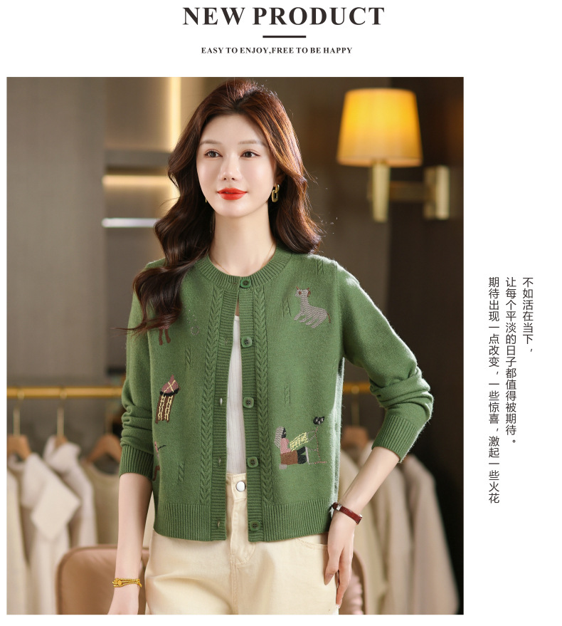 CC高腰短款刺绣针织开衫女士长袖外搭秋装2025新款圆领毛衣外套