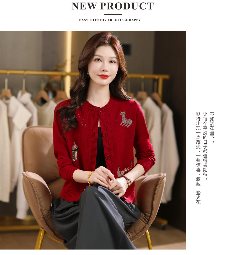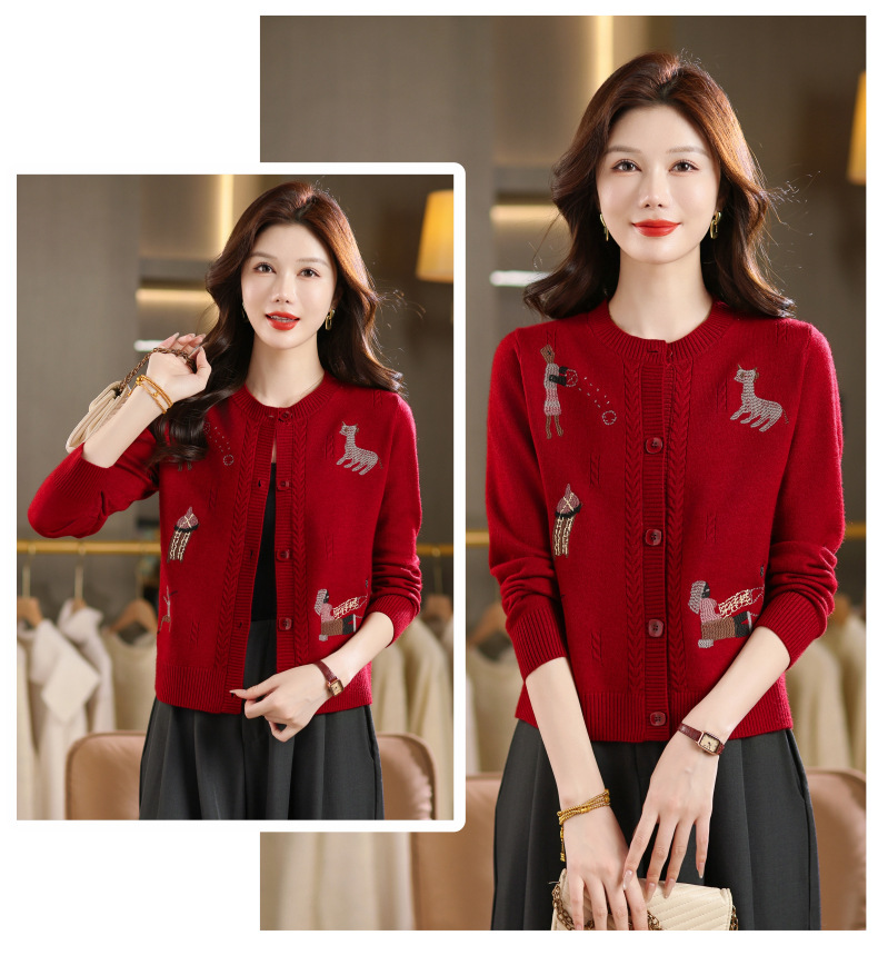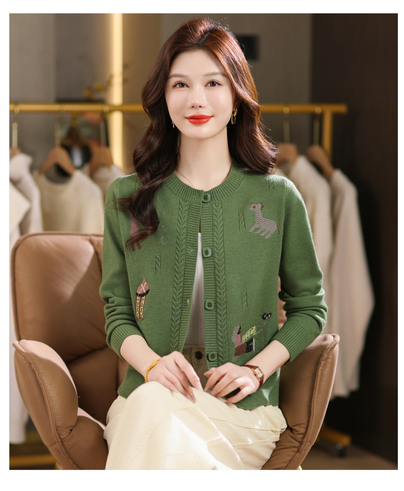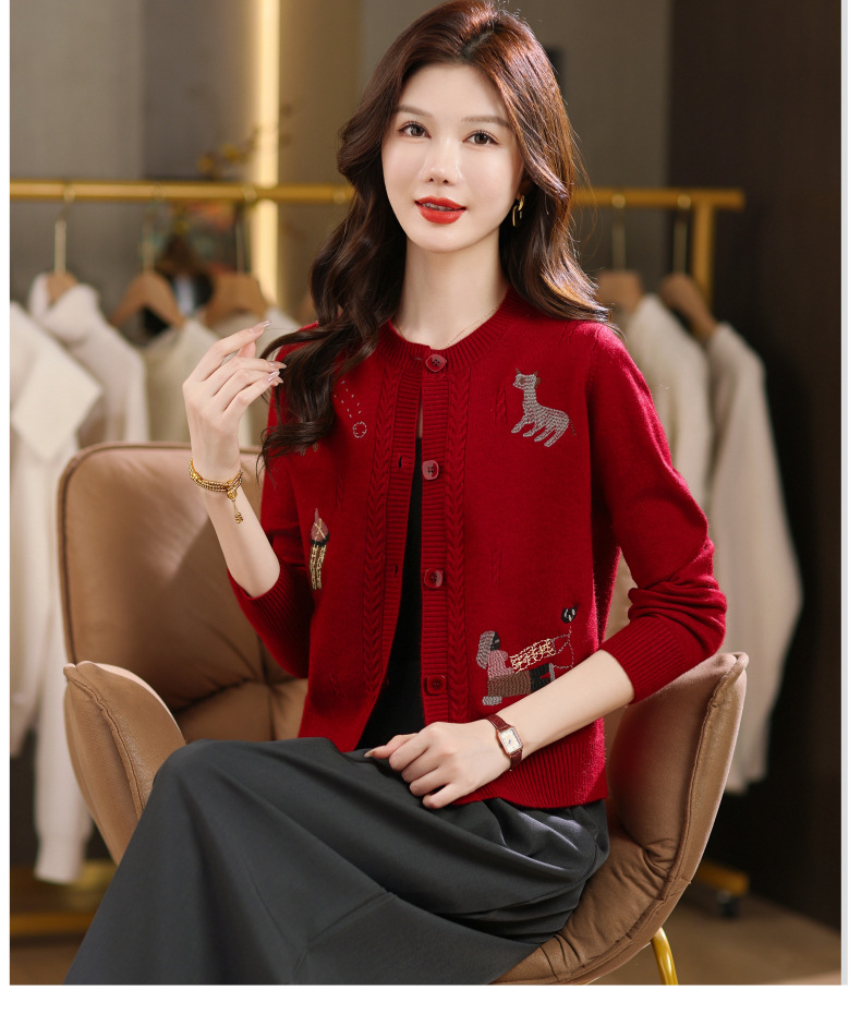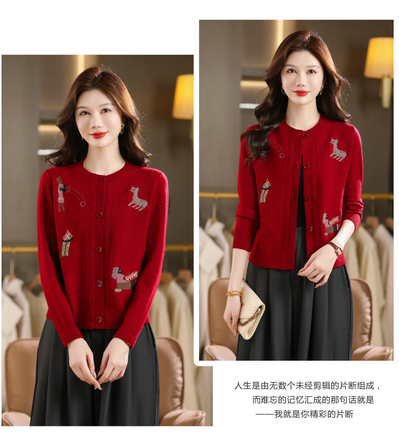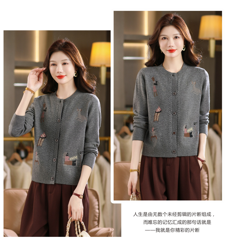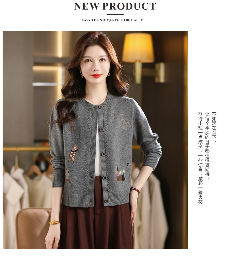 CC高腰短款刺绣针织开衫女士长袖外搭秋装2025新款圆领毛衣外套