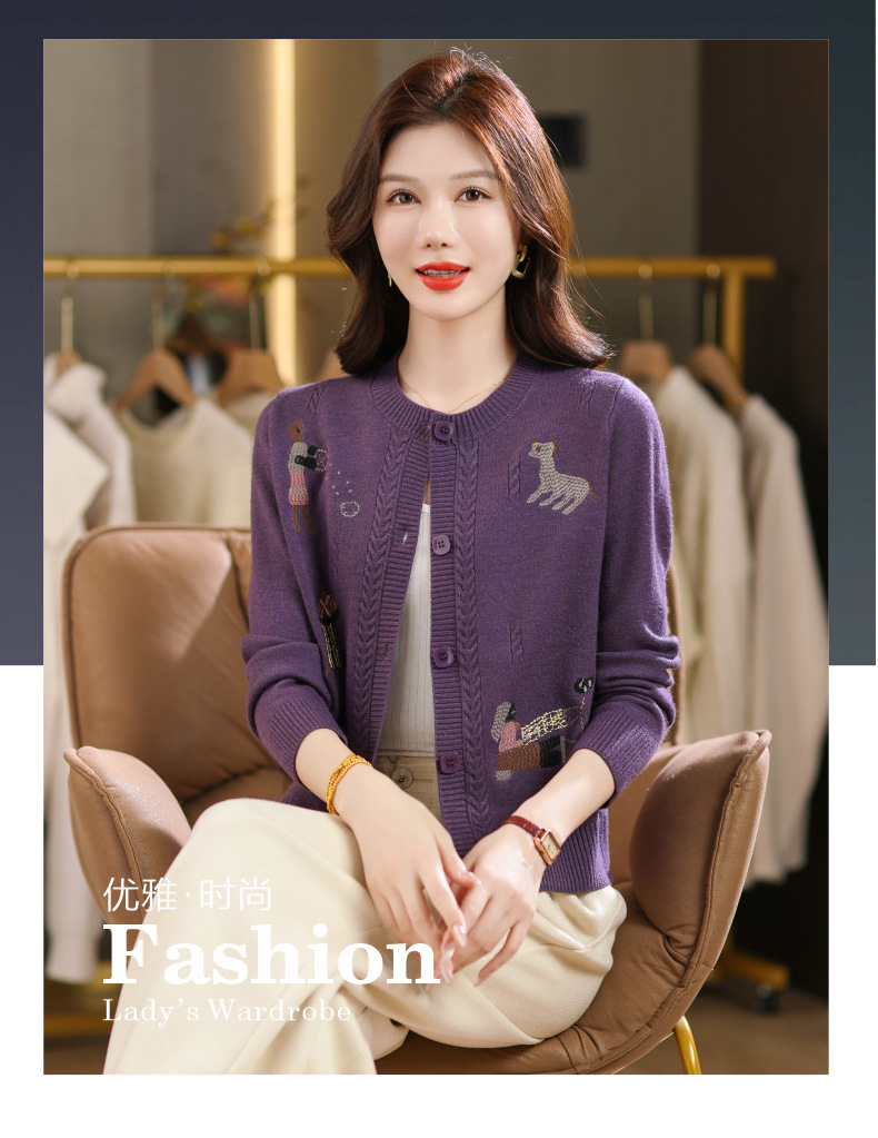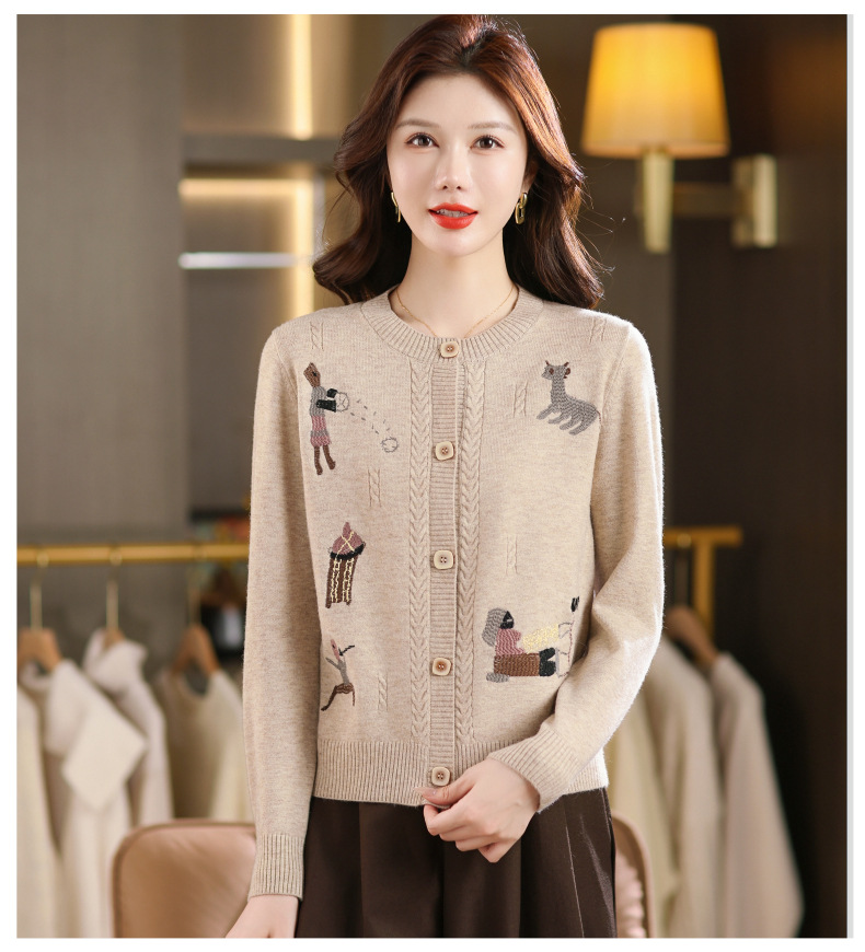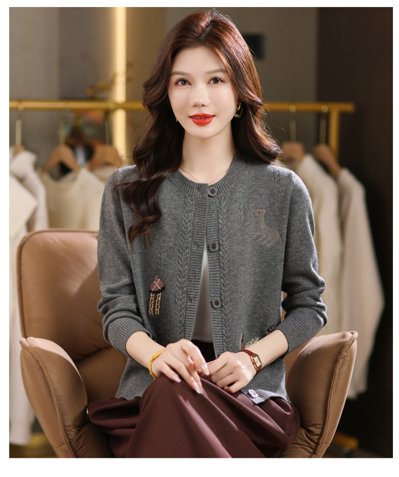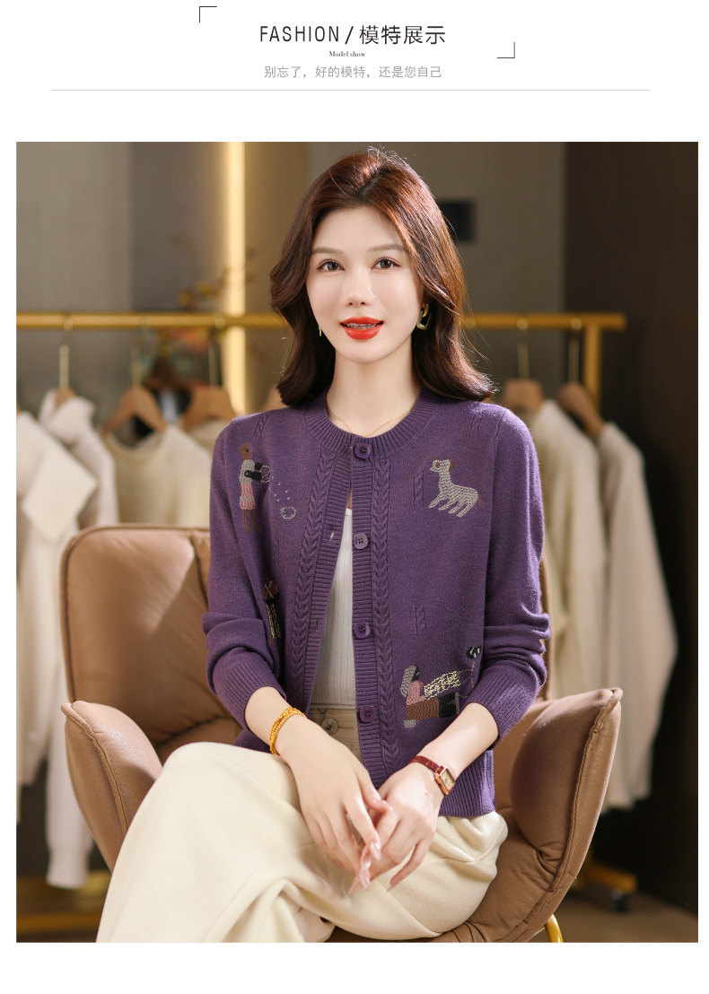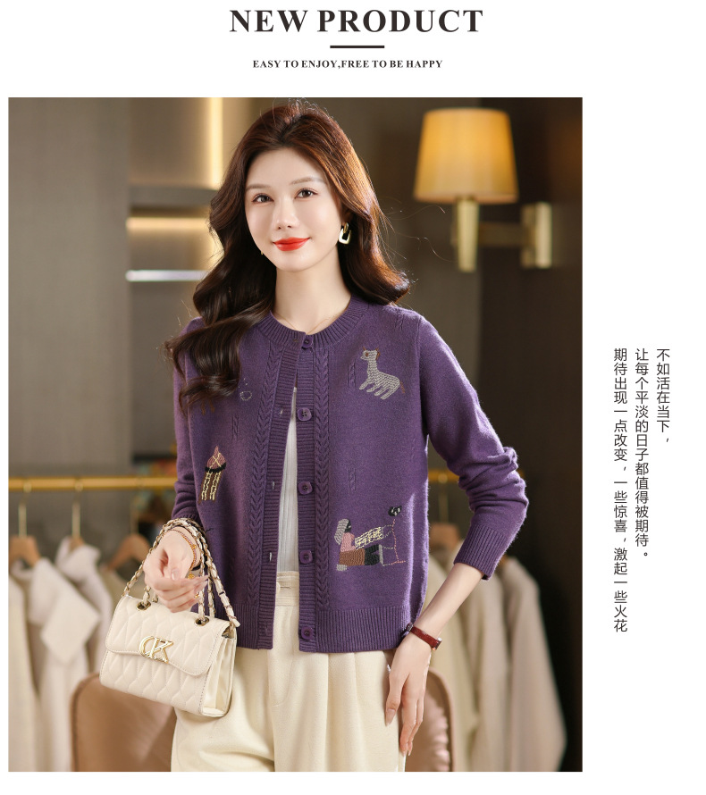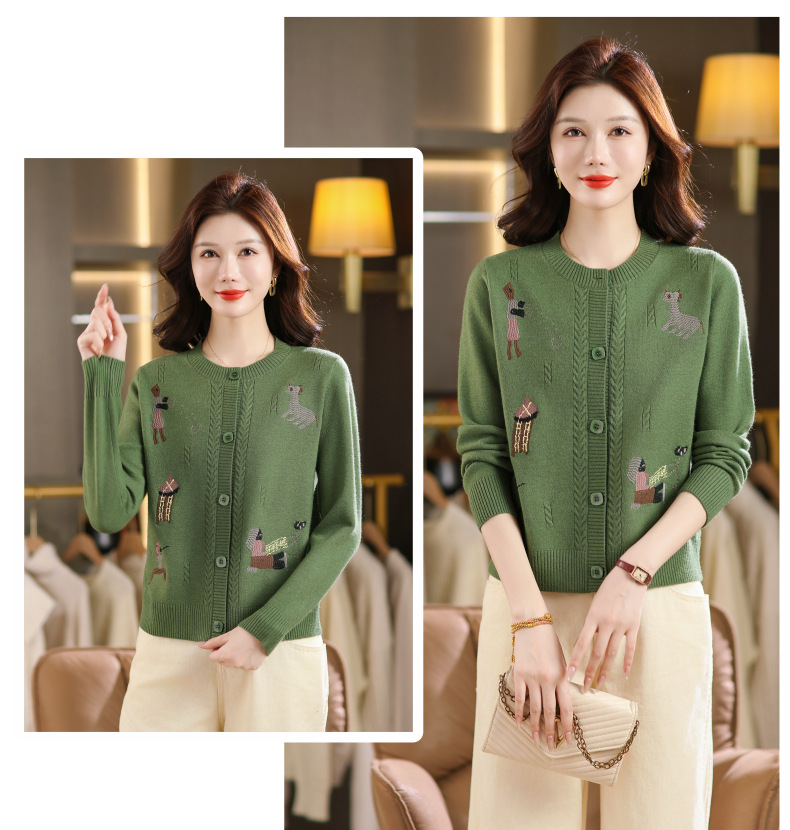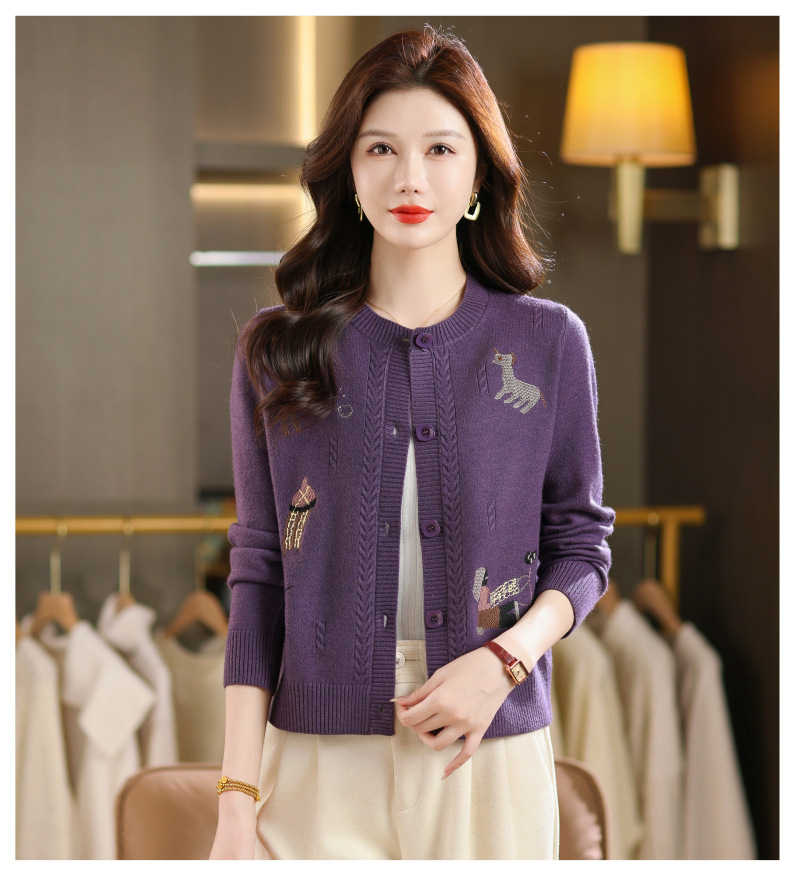 CC高腰短款刺绣针织开衫女士长袖外搭秋装2025新款圆领毛衣外套