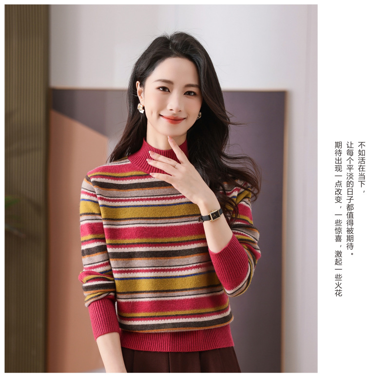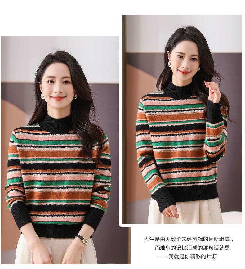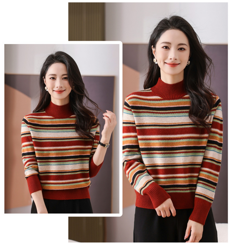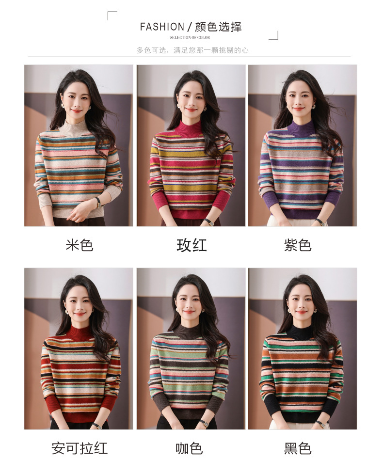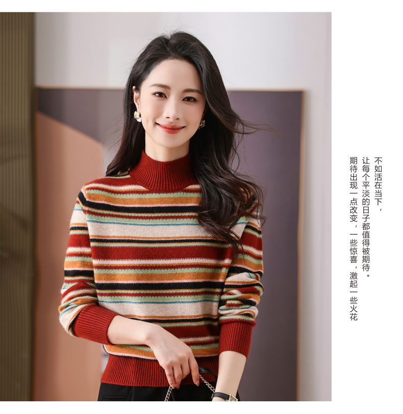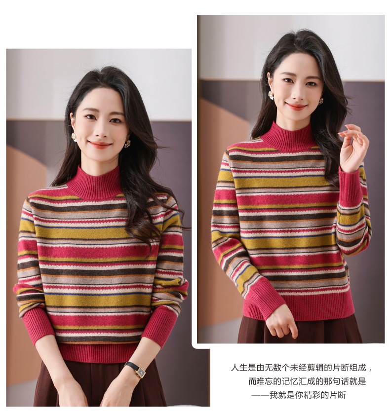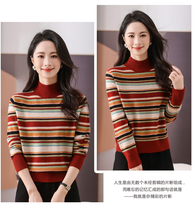 CC-101-35464秋冬新款羊毛针织衫复古洋气条纹显瘦毛衣女半高领打底衫厚