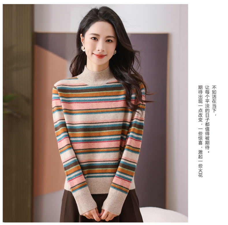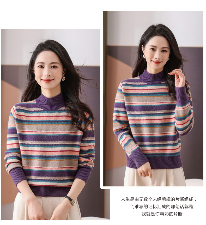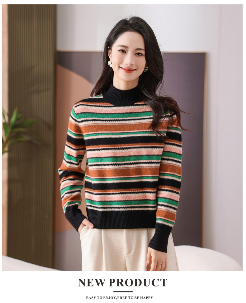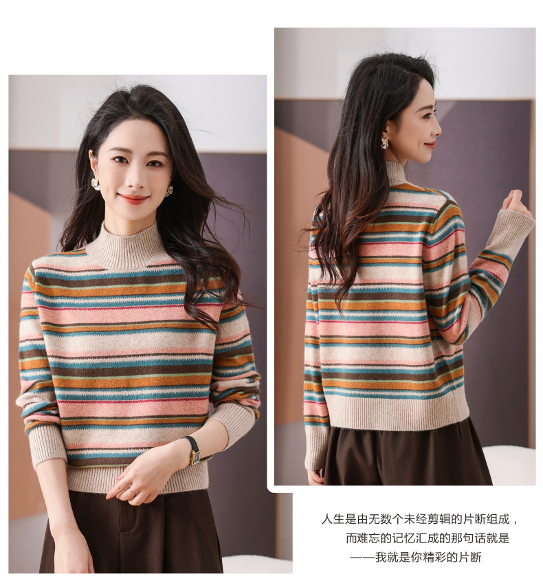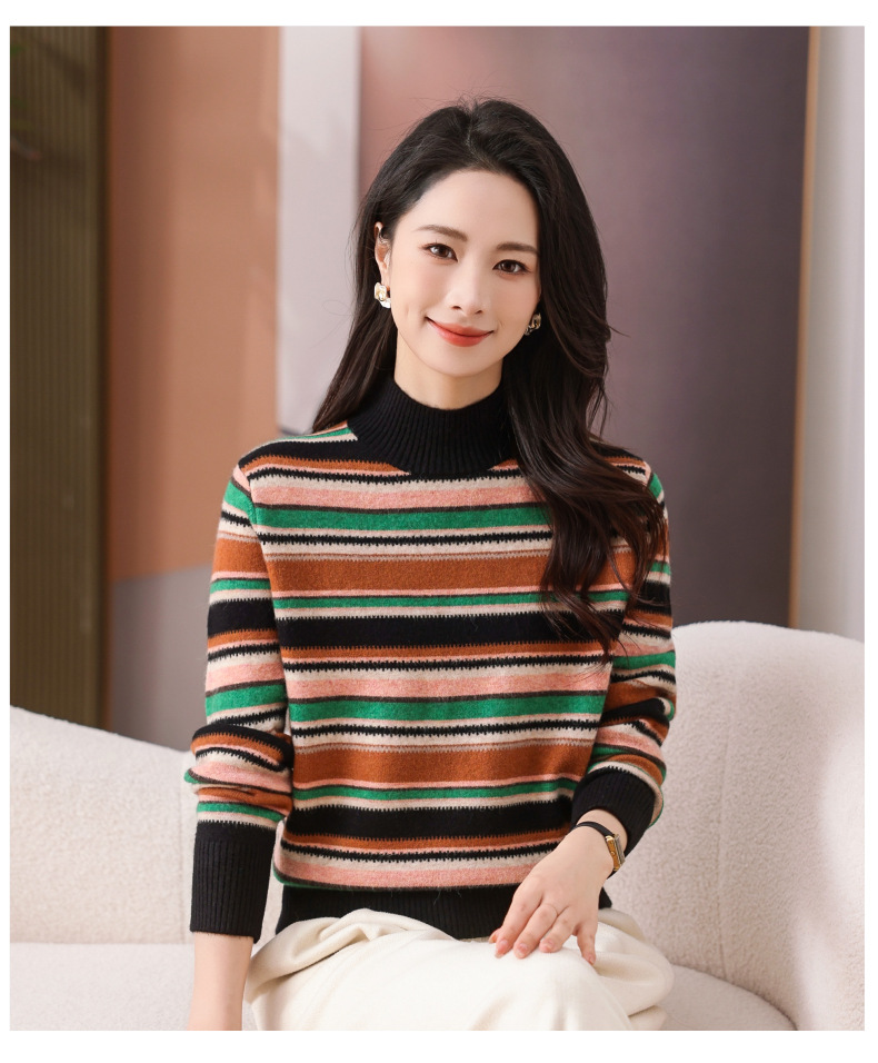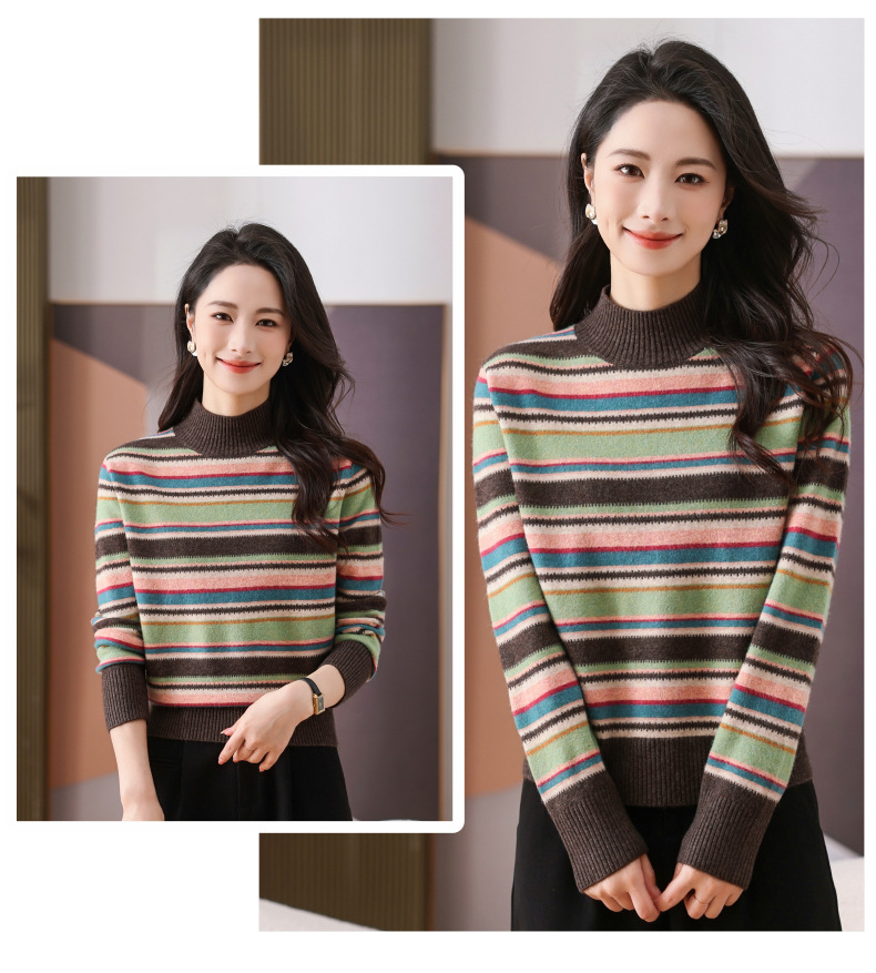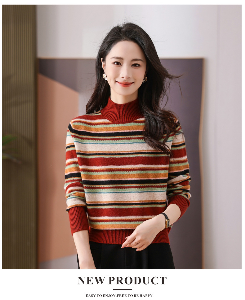 CC-101-35464秋冬新款羊毛针织衫复古洋气条纹显瘦毛衣女半高领打底衫厚
