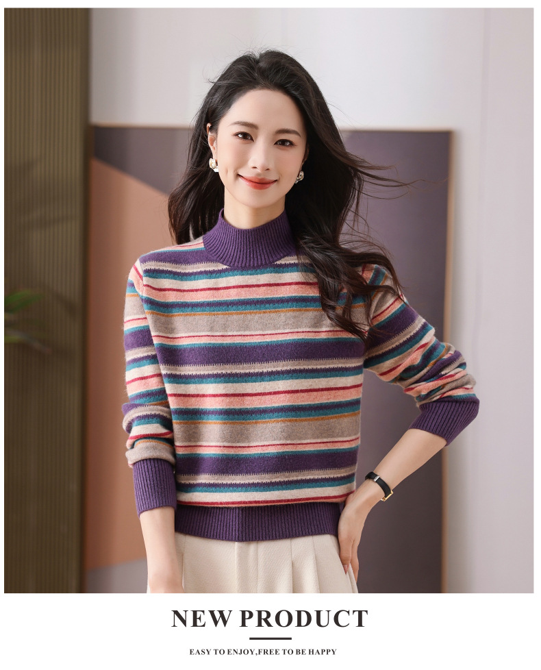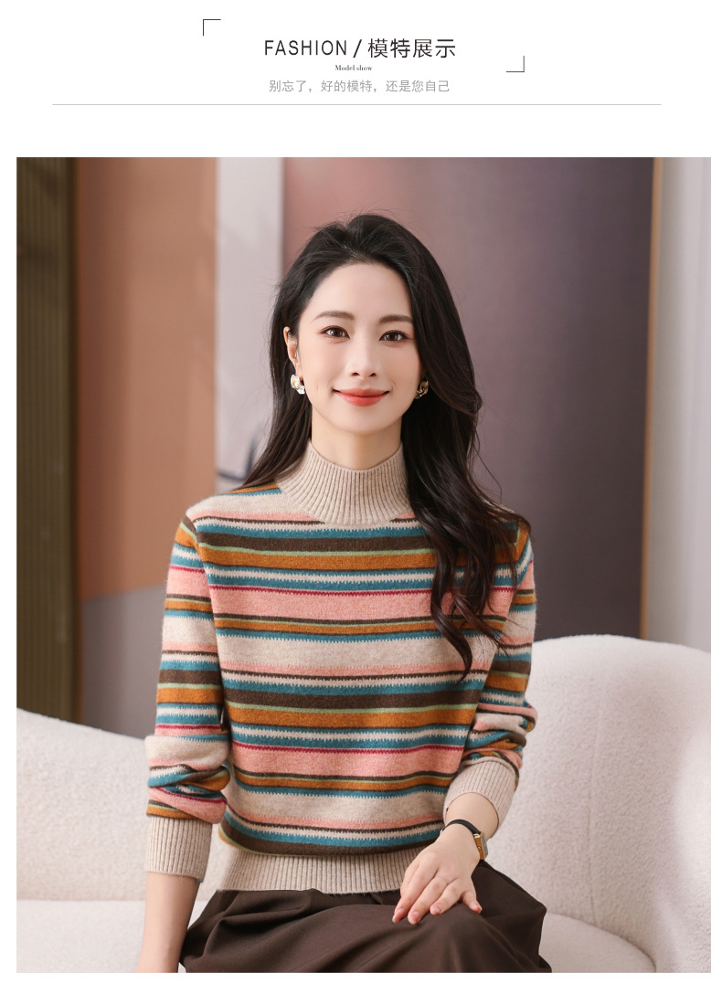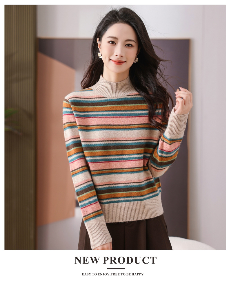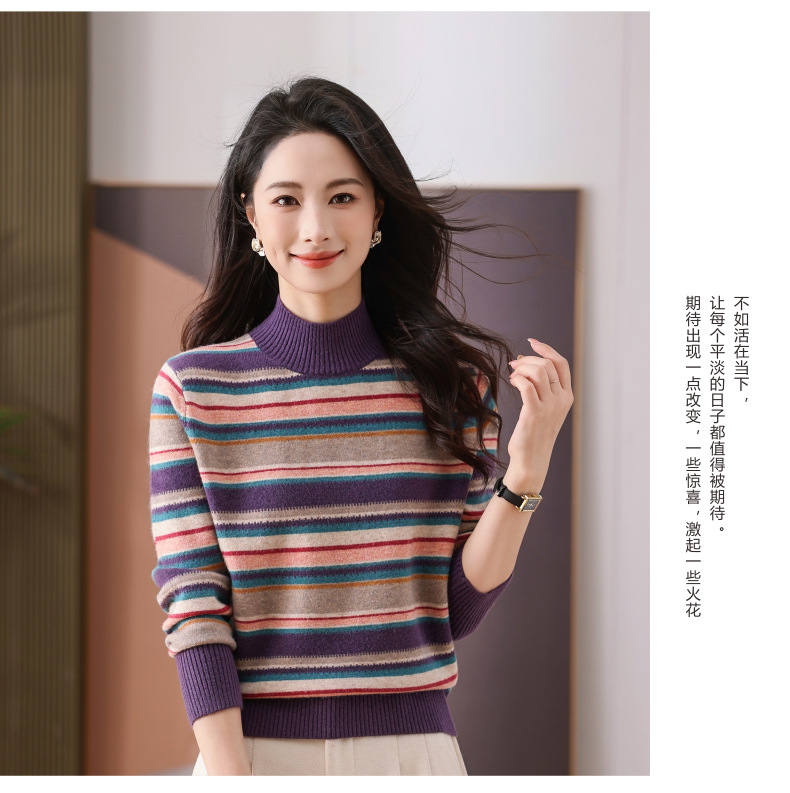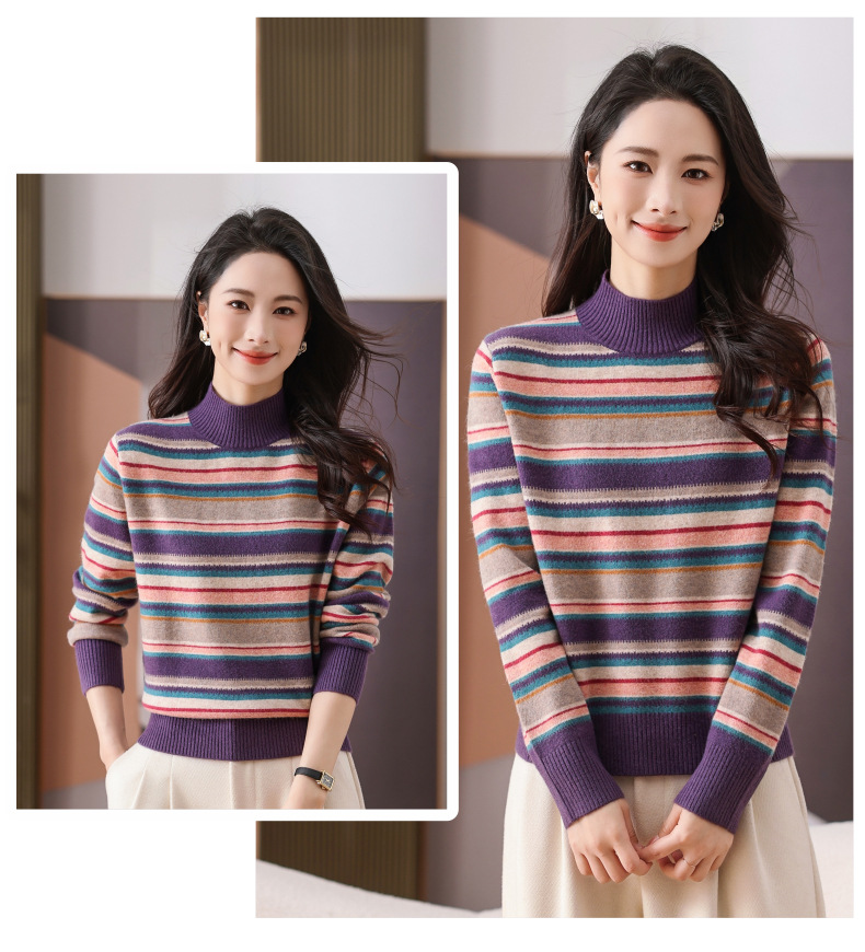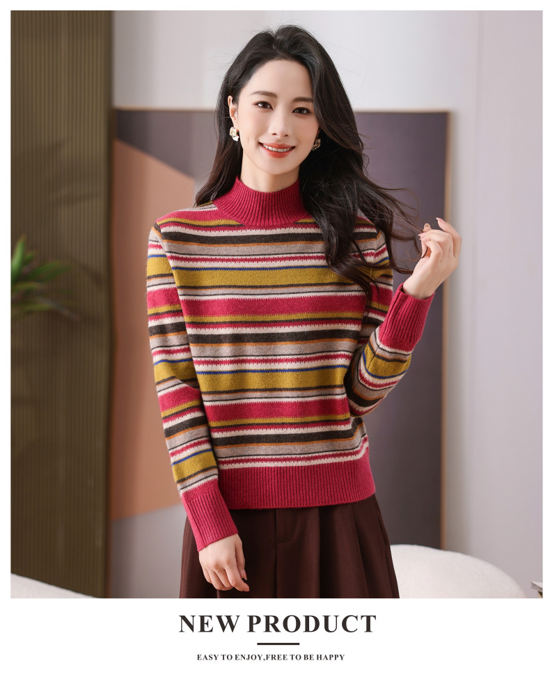 CC-101-35464秋冬新款羊毛针织衫复古洋气条纹显瘦毛衣女半高领打底衫厚