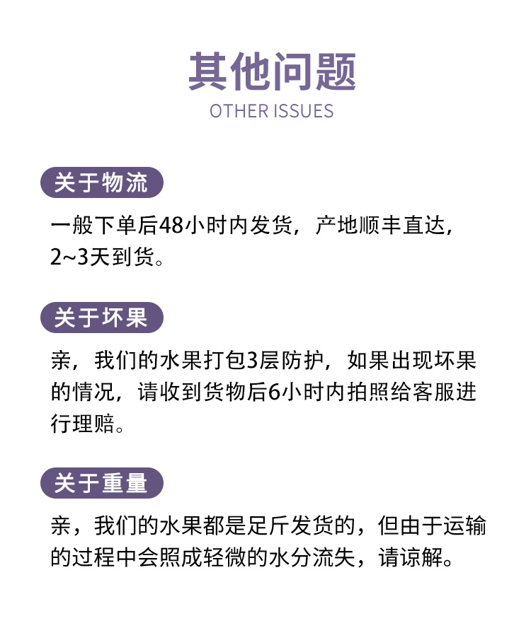 每一颗果实采摘后,都要经过专业种植户人工挑选,任何瑕疵不容放过;保证品质的基础上产地装箱、航空发货,以最快的速度送至客户手中。