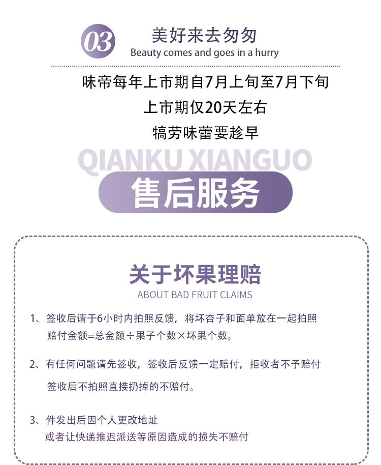 【口感】:一口咬下,果皮分泌的淡酸味刺激口腔产生对美食的欲望,咀嚼发生的同时,果肉爆发出香甜果汁充斥味蕾,完美的酸甜比配合滑感果肉,食用感风味十足