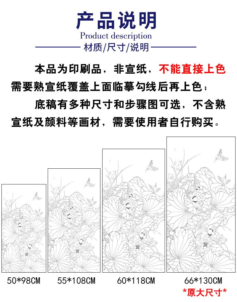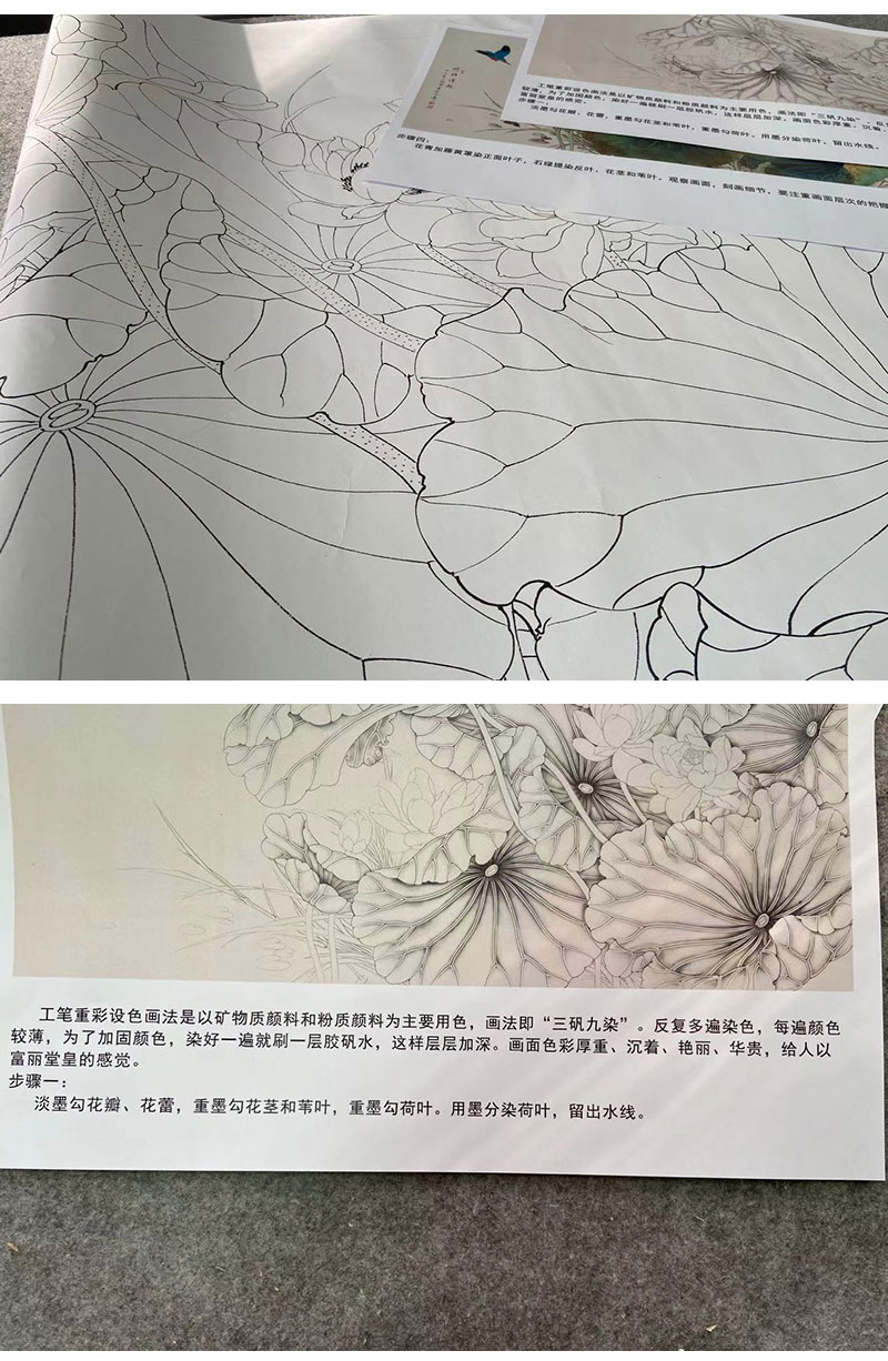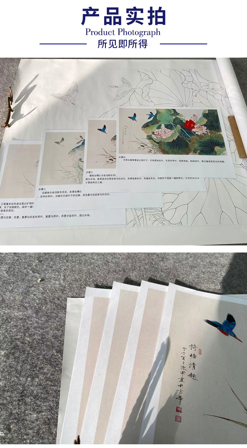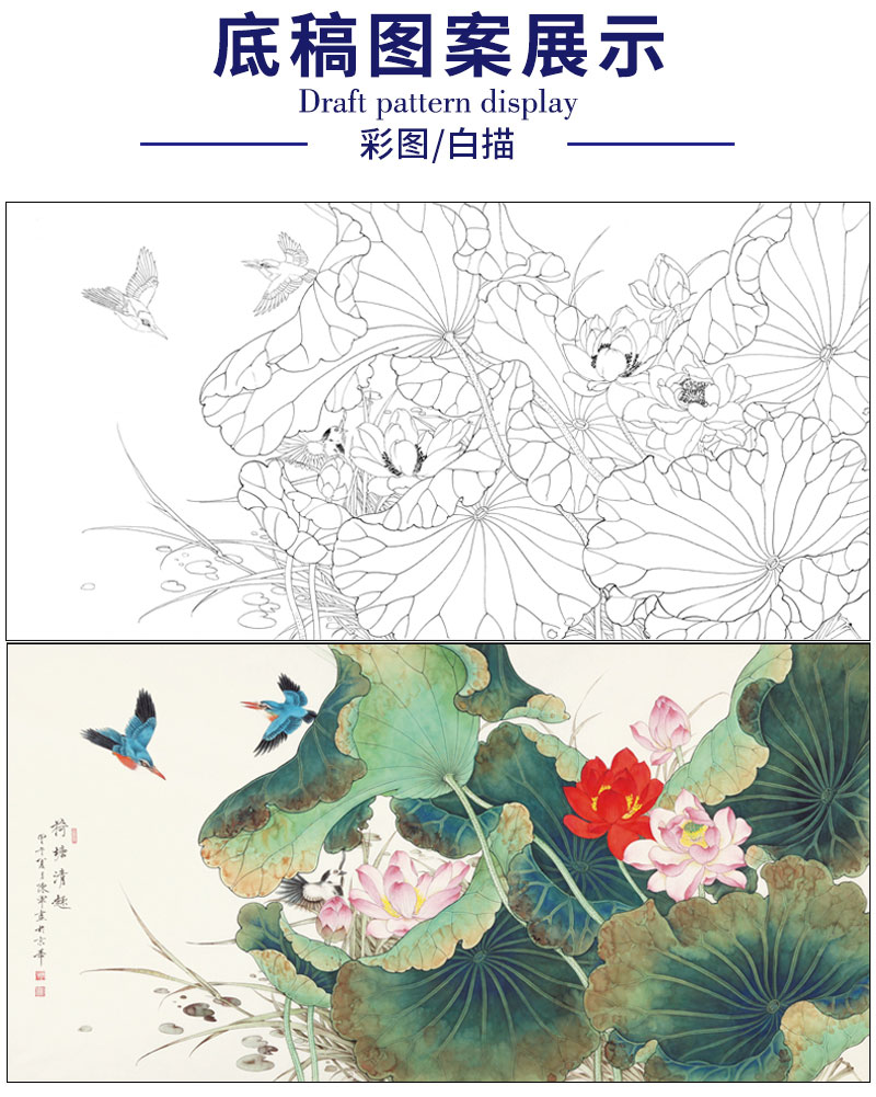 【有步骤】陈军横幅工笔画白描底稿《荷塘嬉戏》荷花翠鸟初学者临摹花鸟线稿CJ01