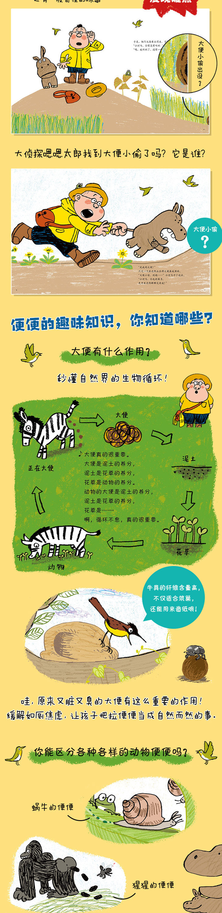 ★ 这不是一本便便百科书,你不需要花费心力死背便便的形状、气味,辨别是哪一个动物的便便。你只需透过作者安排的角色──幽默又逗趣的便便专家嗯嗯太郎,就可以从他的两次小小侦探观察记中,学会如何透过生物的生活习性,观察他们的便便,同时,从简单又令人发笑的文字和情节中,认识动物们与自然界中的便便生态。——台版推荐语