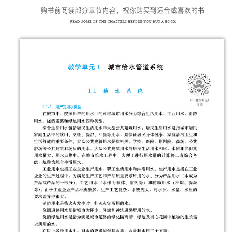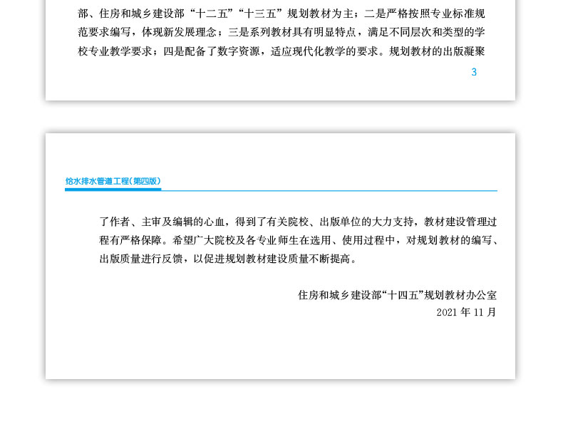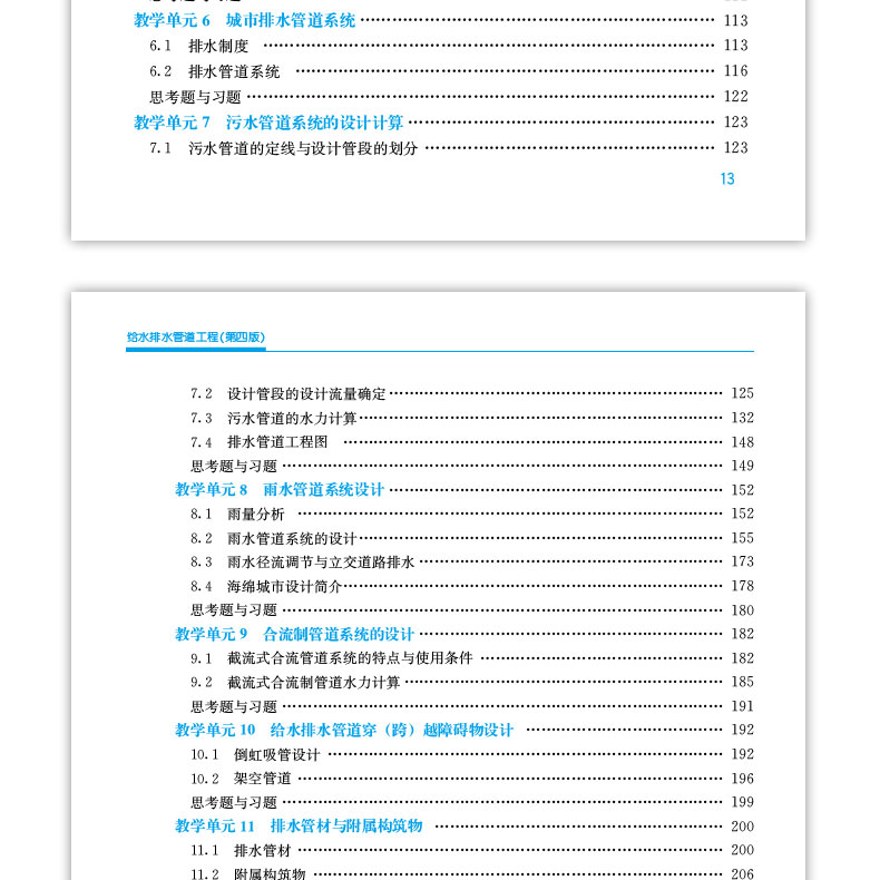 随着教学改革的深入及新的指导文件的出版,需要根据新的形势进行修订。本教材第四版主要内容为给水排水管道工程的基本概念,给水管道系统的组成、布置和工作机理,给水管道系统的设计用水量、管网定线和管网设计计算;排水管道系统的体制、组成和布置,污水、雨水和合流管道系统的设计计算;雨水径流调节与立交道路排水;给排水管材及附属构筑物;给排水管道系统的养护管理等。配有完备的课件ppt。其特色是:(1)将给水管道工程与排水管道工程分别讲述,便于组织教学且易于学生理解掌握;(2)在内容安排上做到讲练结合,注重学生设计技能及与设计人员沟通能力的培养;(3)以能正确识读施工图为教学目标组织教材内容,注重学生识读图纸能力的培养,以提高学生的职业技能。