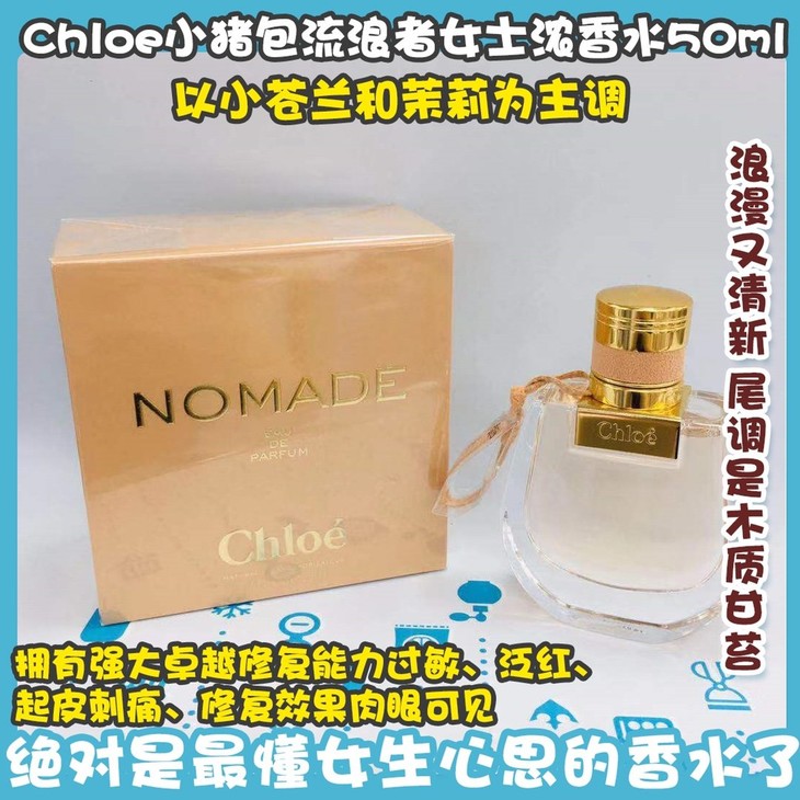Chloe小猪包流浪者女士浓香水50ml👍chloe绝对是最懂女生心思的香水了🎀,从瓶身到香味🌬,都是能让女生倾心的类型😘。这支新款香水也不例外,瓶身特地打造成chole家最出名的小猪包外形🐷,香味以小苍兰和茉莉为主调🌸,很清新自然🍃,像一束绿叶上点缀着星星点点的小白花✨,浪漫又清新😋。尾调是木质甘苔,增加了绿色气息和木质的沉稳🌿,中和了花香的甜美,非常耐闻😊!