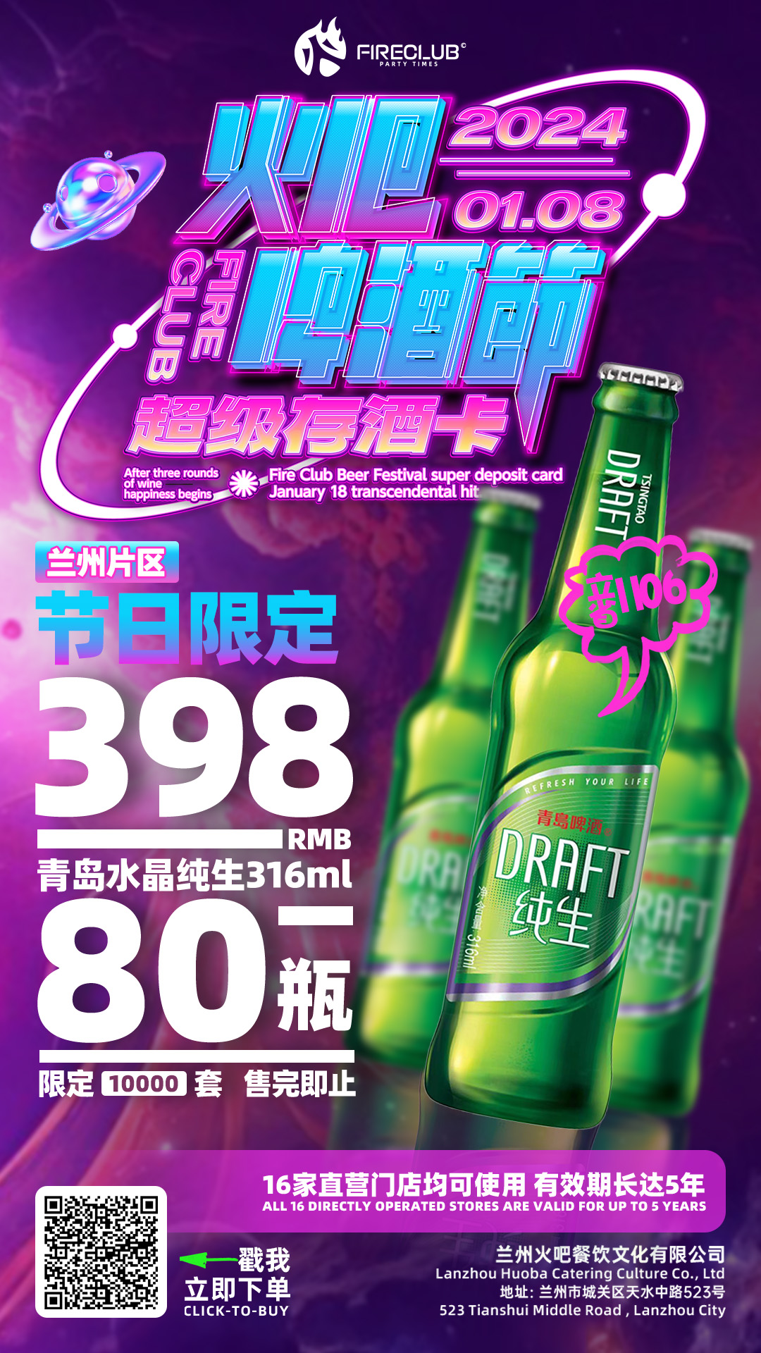 【兰州通用】1月8日火吧啤酒节—超值存酒卡—398元80瓶青岛水晶纯生316ml